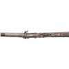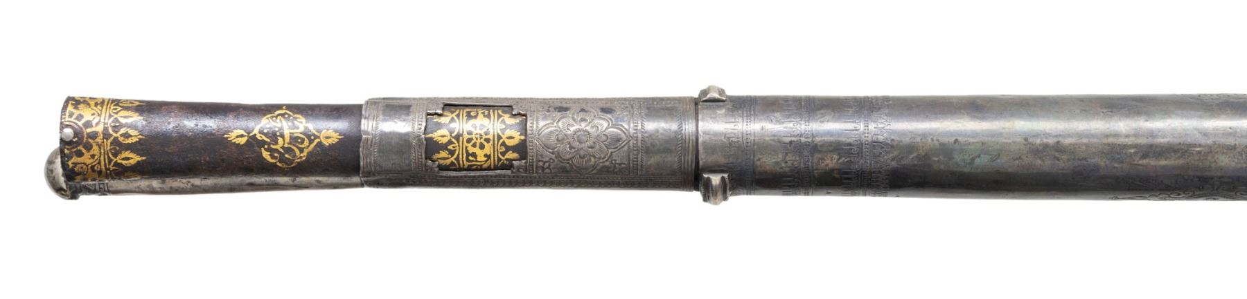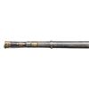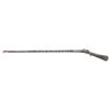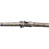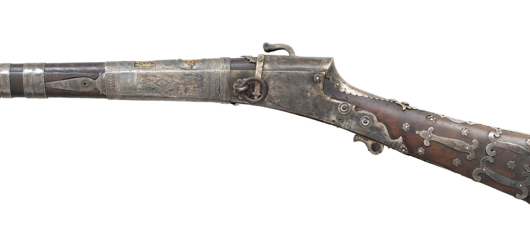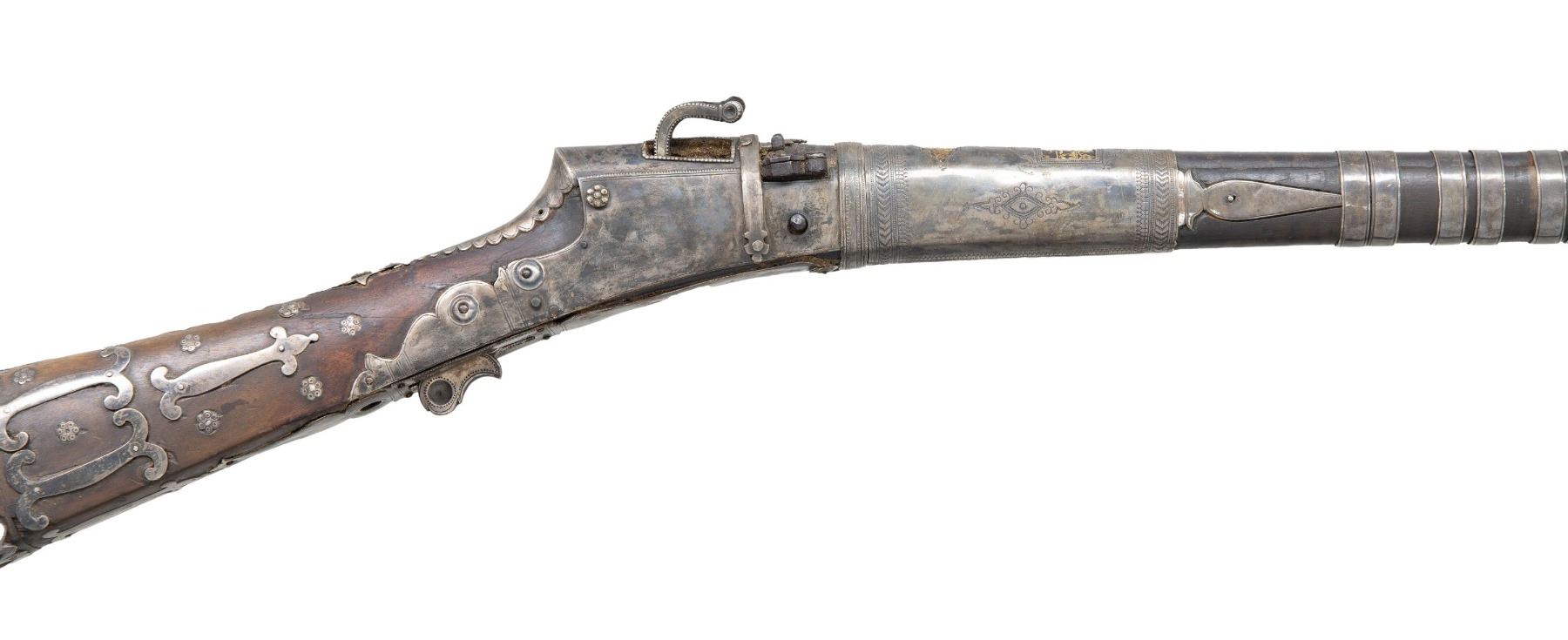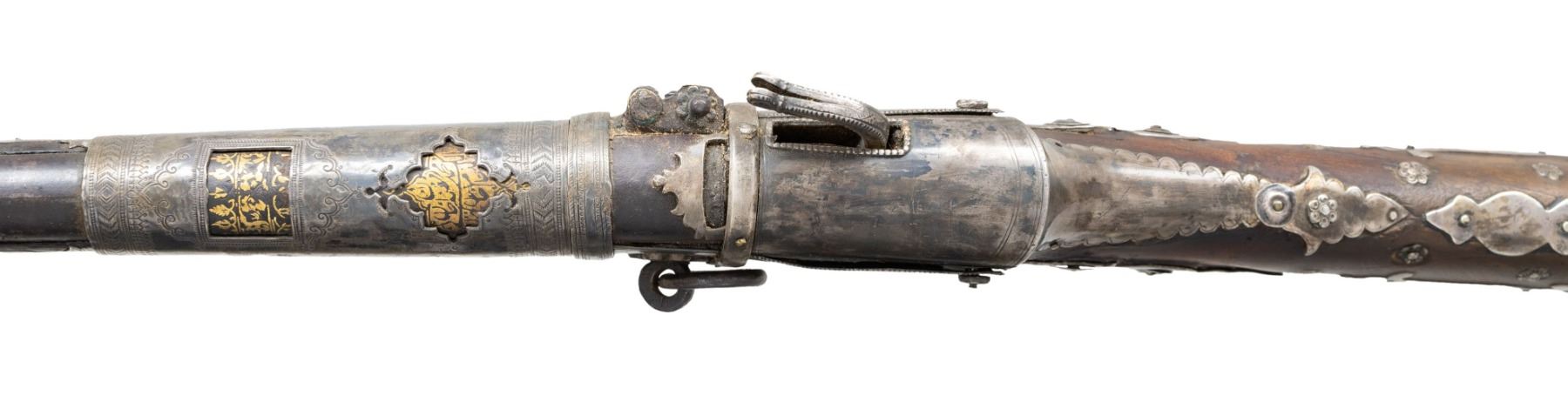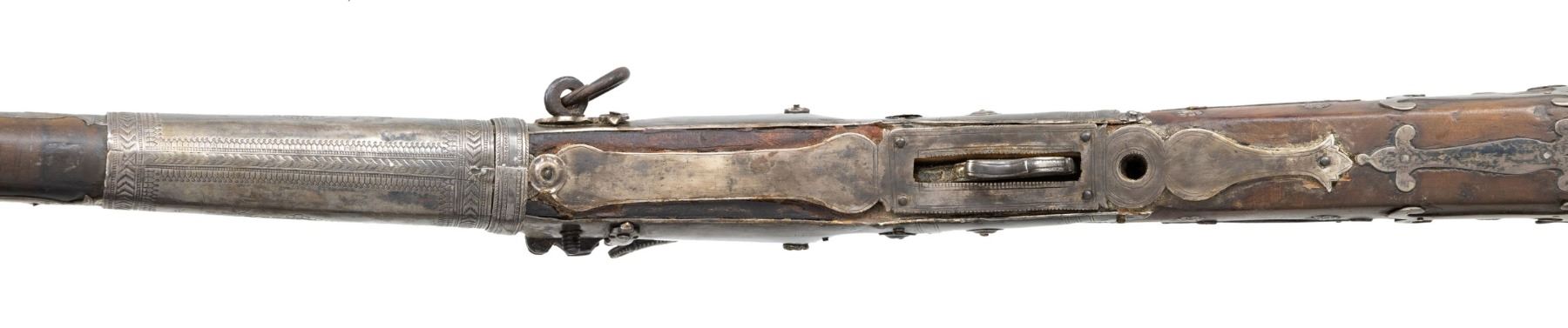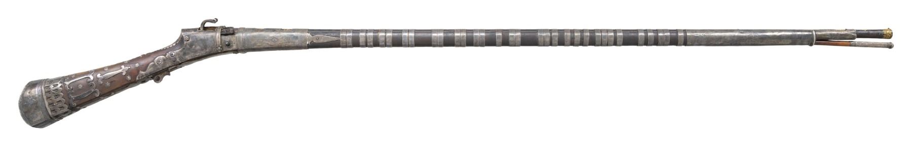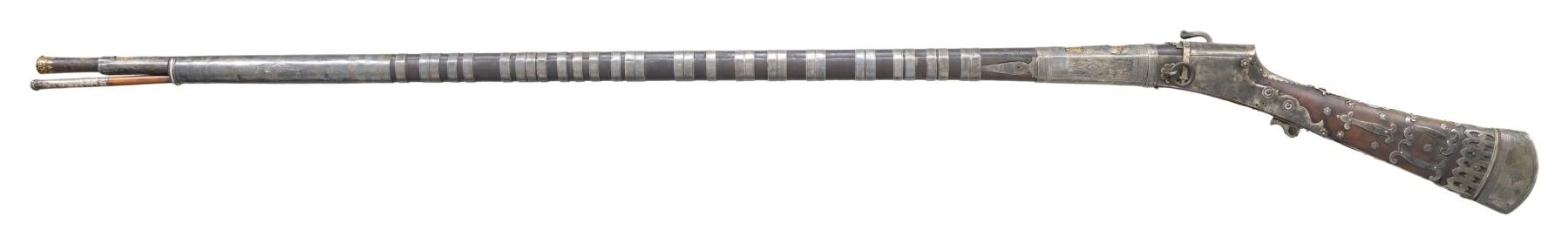 MATCHLOCK MUSKET. Cal. 45. NSN. 59" overall. This long graceful musket was made in late 18th century in Coorg, southwest India. The unique tapered round barrel has top central spine flaring at muzzle. There are 2 gold inset panels that have silver bands cut out to show them. Musket is almost totally covered in silver insets, plaques, and bands, silver tipped wood ramrod. CONDITION: very good overall, sound & well fit, mechanics fine, good smooth bore, several pins in silver insets are rising. PROVENANCE: Estate Collection of Dr. Curtis S. Morse. (01-26298/JS). ANTIQUE. $1,500-3,000.