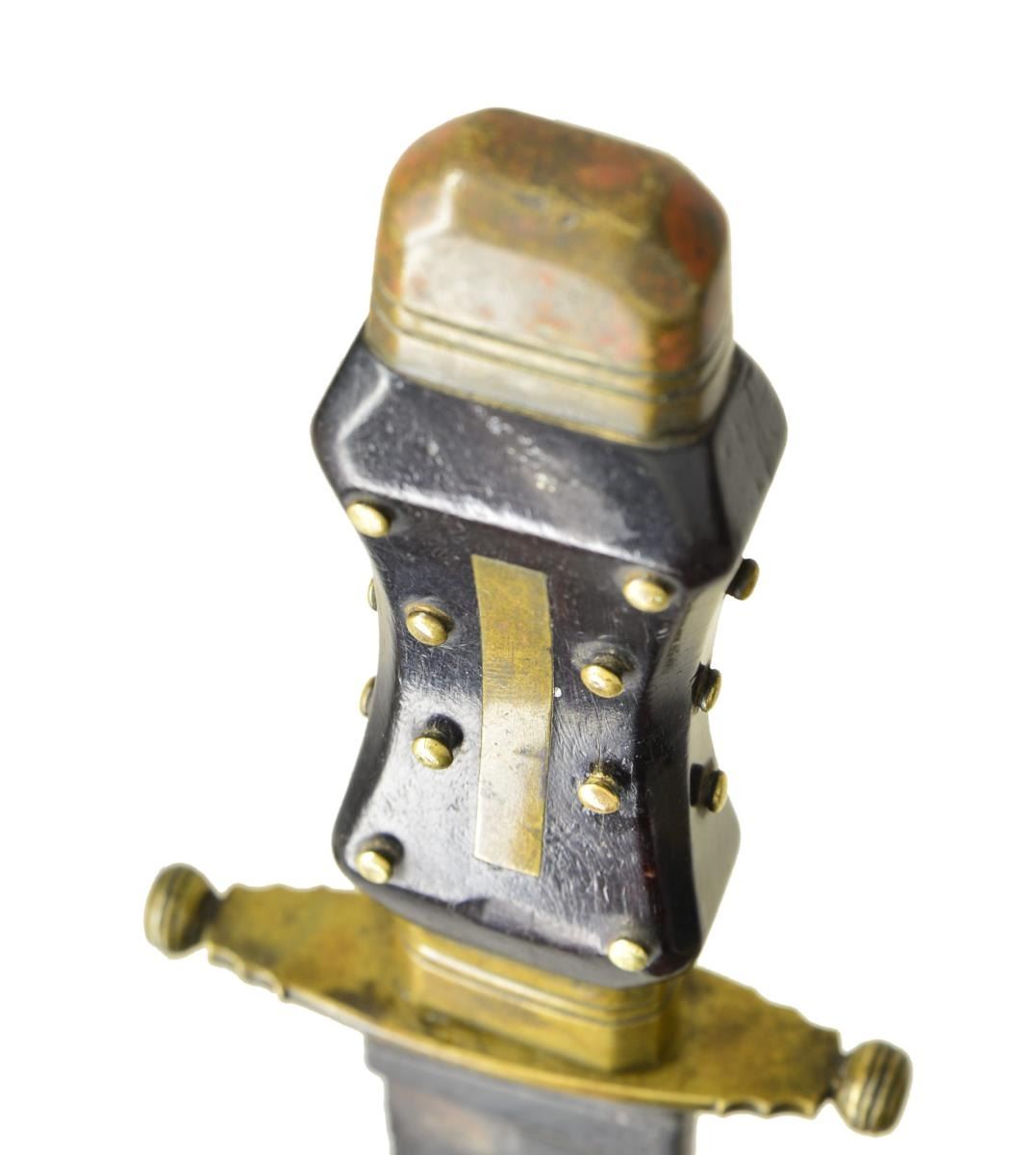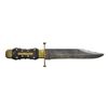 11.5”overall, 7.25” clip point blade, deep cut grooves are found on ricasso where normally maker marked, only “3” is seen denoting size of this distinctive early American made bowie. Brass mounted rosewood grip with brass pins. Fined old patina. CONDITION: very good “as found”, blade has smooth dark iron patina, hand word patina to wood, brass has mixed mustard patina. PROVENANCE: From the Lifelong Collection of Glen E. Mattox. (02-18483/JS). $3,000-5,000.