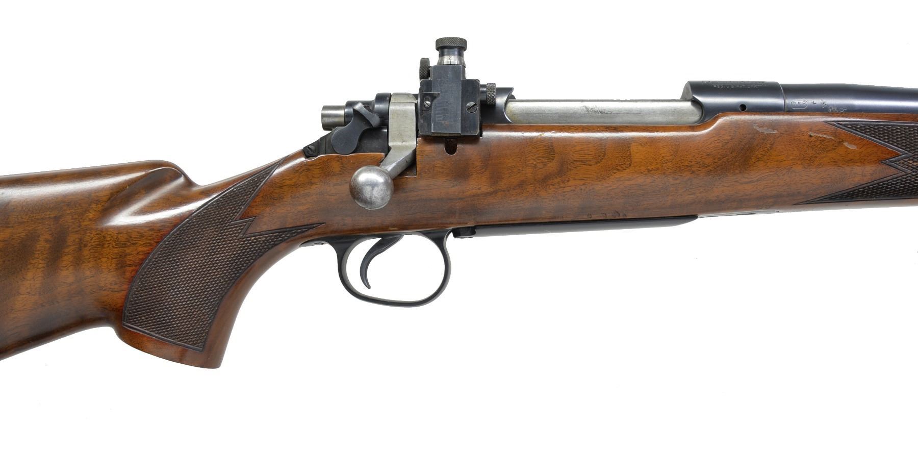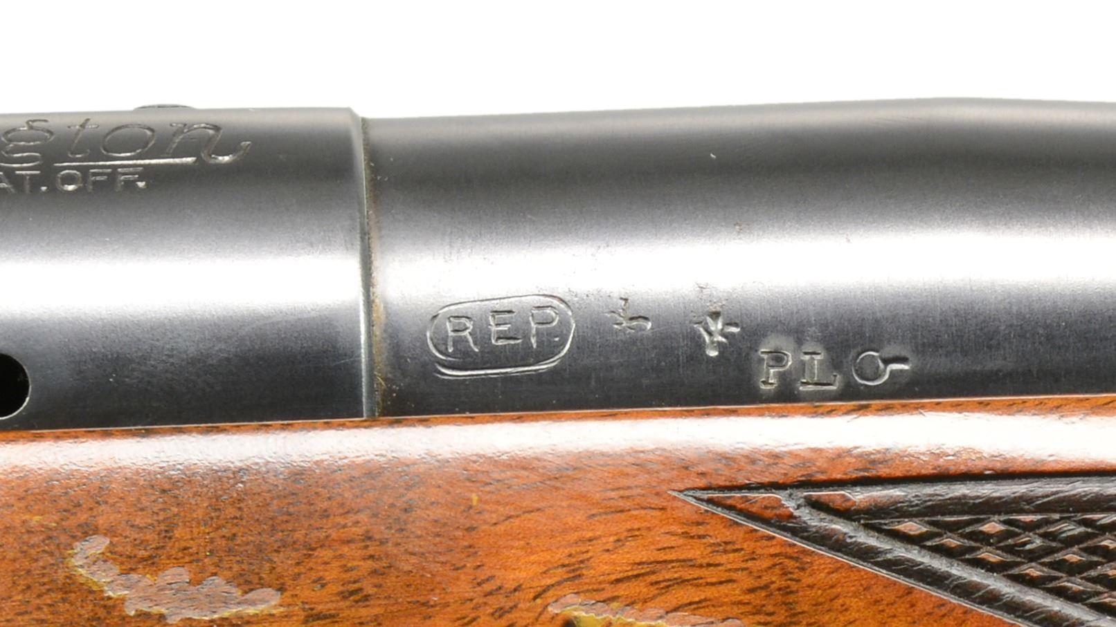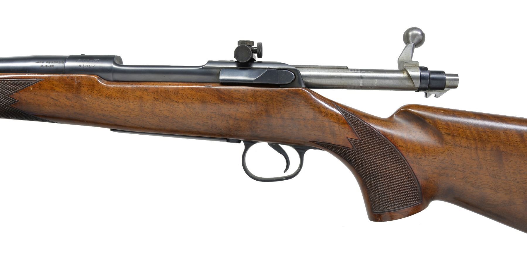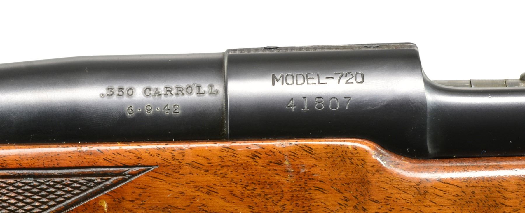 MODEL 720 BOLT ACTION RIFLE. Cal. 350 Carroll. S# 41807. Bbl. 26". Left side of bbl. at breech is marked ".350 CARROLL" over date of "6-9-42". Former 1st Lieutenant Dan Carroll worked for Remington Arms Company Research & Development Department in the Bridgeport Connecticut Machine Shop. His research work & precision shooting knowledge aided in the testing of arms & ammunition during WWII. The Model 720 was designed to compete w/ Winchester's popular Model 70 & is a refined version of the Enfield 1917. The Model 720 was introduced in 1941 w/ a total production of approx. 2,500 rifles. Commercial production was interrupted & never resumed after the war. Nearly 1,000 were purchased in 1942 by the Navy Department & were eventually awarded as trophies in Navy & Marine Corp. shooting competitions into the 1960's. The 350 Carroll is a proprietary cartridge Dan Carroll developed during his time at Remington. A Feb. 26, 1996 letter from Rem. historian J. D. Heath gives the following insight into this rare rifle "The .350 Carroll is also very interesting in the fact that Dan Carroll was w/ the Company at the time, and he was in R & D. He may have put it together & bought it from the Company, and somehow, it got into your hands. Dan Carroll died several years ago, so someone may have sold his firearms. The mystery continues!". The 720 has an Enfield style action w/ improved bolt release having alloy trigger guard & floorplate. Bbl. band fastened bead front sight & fillers in holes for rear sight along w/ Lyman 48RS receiver sight. The action is drilled for scope attachment w/ filler screws. Classic style sporter stock of nicely grained black walnut w/ point pattern hand checkering, sling eyes & checkered aluminum buttplate. UNATTACHED ACCESSORIES: Remington Arms letter dated Feb. 26, 1996. Printed information regarding the 720 rifle & production numbers. Photo of document regarding Dan Carroll dated 7/20/43. Photocopy of a picture of a young Dan Carroll looking down the sights of a Springfield 1903 rifle. CONDITION: retains over 98% metal finish showing some scratches on alloy bottom metal. Front sight retainer & pin are missing. Original stock finish shows some sm. marks & forearm checkering shows a few chipped diamonds. Near excellent bore. (20-630/DS). CURIO. $3,500-5,500.