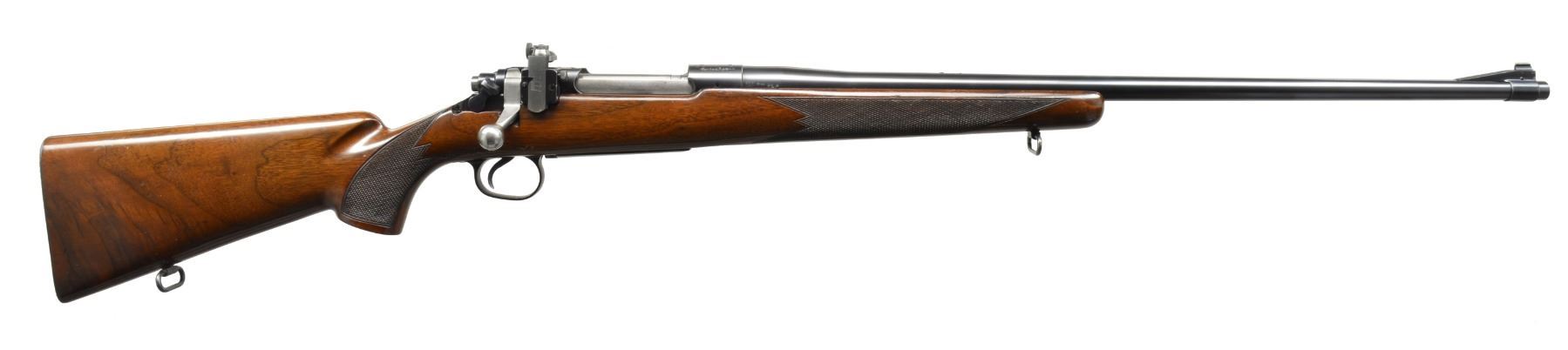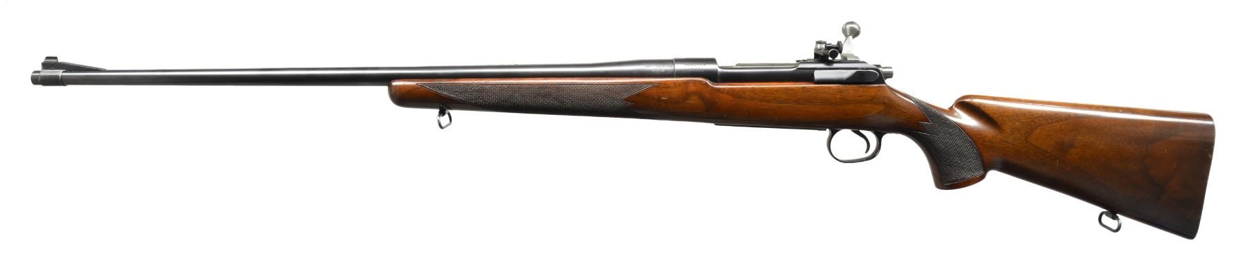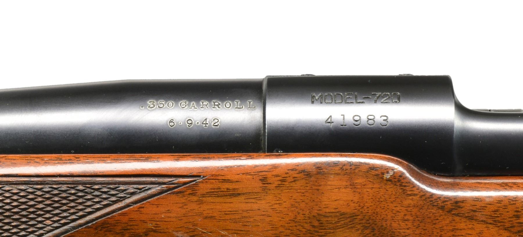 MODEL 720 BOLT ACTION RIFLE. Cal. 350 Carroll. S# 41983. Bbl. 26". Left side of bbl. at breech marked ".350 CARROLL" over date of "6-9-42". Former 1st Lieutenant Dan Carroll worked for Remington Arms Company Research & Development Department in the Bridgeport Connecticut Machine Shop. His research work & precision shooting knowledge aiding in the testing of arms & ammunition during WWII. The Model 720 was designed to compete w/ Winchester's popular Model 70 & is a refined version of the Enfield 1917. The Model 720 was introduced in 1941 w/ a total production of approx. 2,500 rifles. Commercial production was interrupted & never resumed after the war. Nearly 1,000 were purchased in 1942 by the Navy Department & were eventually awarded as trophies in Navy & Marine Corp. shooting competitions into the 1960's. The 350 Carroll is a proprietary cartridge Dan Carroll developed during his time at Remington. A Feb. 26, 1996 letter from Rem. historian J. D. Heath gives the following insight into this rare rifle "The .350 Carroll is also very interesting in the fact that Dan Carroll was with the Company at the time, and he was in R & D. He may have put it together and bought it from the Company, and somehow, it got into your hands. Dan Carroll died several years ago, so someone may have sold his firearms. The mystery continues!". The 720 has an Enfield style action w/ improved bolt release having alloy trigger guard & floorplate. Bbl. band fastened bead front sight & fillers in holes for rear sight along w/ Lyman 48RS receiver sight. The action is drilled for scope attachment w/ filler screws. Classic style sporter stock of nicely grained black walnut w/ point pattern hand checkering, sling swivels & checkered aluminum buttplate. UNATTACHED ACCESSORIES: Remington Arms letter dated Feb. 26, 1996. Printed information regarding the 720 rifle & production numbers. Photo copy of document regarding Dan Carroll dated 7/20/43. Photocopy of a picture of a young Dan Carroll looking down the sights of a Springfield 1903 rifle. CONDITION: bbl. & action retain over 98% original finish showing sm. handling marks w/ blue loss due to surface corrosion on forward portion of trigger plate. Original stock finish shows scattered w/ scratches & marks. Near excellent bore. (20-631/DS). CURIO. $3,500-5,500.