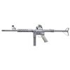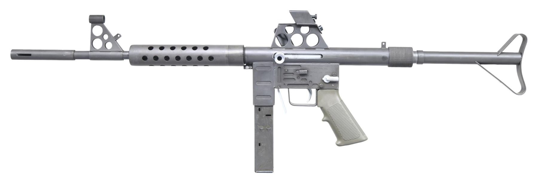 Cal. 9mm. S# 1203. Bbl. 16.25". Manufactured in the USA from 1984-1989. It was designed as a modular system w/ changes & upgrades easily available at will. It utilizes an AR-15 fire control group. Other models were also manufactured for 45acp and .22lr. Sights are unusually tall, w/ aesthetic design features considered "modern" at the time. Parkerized finish on all exterior surfaces. An interesting tube receiver design chambered in 9mm NATO. Blowback operated, closed bolt operating system. Muzzle brake / flash hider is integral to the barrel. Hooded post front sight. Ventilated circular handguard. Left side, reciprocating charging handle. Left side safety / selector. Hooded peep rear sight. AR-15 style plastic pistol grip. Knurled receiver end cap. Steel, tubular fixed shoulder stock, numbered to receiver. Top mounted sling swivels, front & rear. MAGS: 1 steel 32 rd. CONDITION: Finish coverage complete & consistent w/ some drag lines typical of vertical storage. Bright bore w/ strong rifling. Fire control mechanism appears to function correctly when cycled by hand. (22-2268/JZ). MODERN. $500-800.