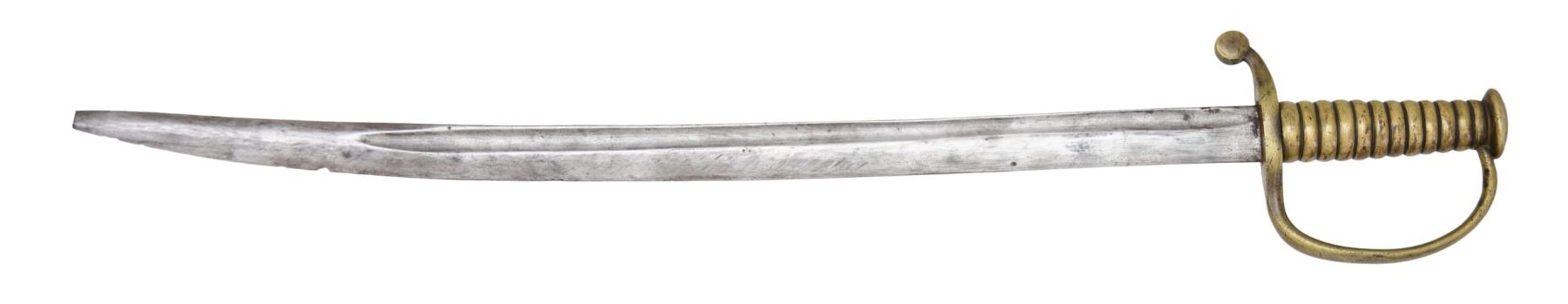 HANGER & PARTIAL SCABBARD. 27" overall, 22.5" classic Confederate hand forged blade with unstopped fuller. The scabbard throat is copper with unique soldered button which I have seen excavated as at least two of these sword hilts has been found on battlefield or campsites. There is a very similar and equally rare heavy cast ribbed handle D-guard hanger made by Cook & Brother of New Orleans. Because of similarity, collectors have always believed these were made in New Orleans. Old time Confederate sword & knife collector John Ashworth believed this pattern was made in Memphis as he found one there. Till this specimen surfaced, the Ashworth example was the best one when it sold at Julia Auctions in March of 2016. CONDITION: very good overall, blade is gray with sharpening, broken tip, scabbard is in 3 pieces, but only original scabbard known on this pattern. PROVENANCE: From the Collection of a Tennessee Gentleman. (02-23044/JS). $3,000-5,000.