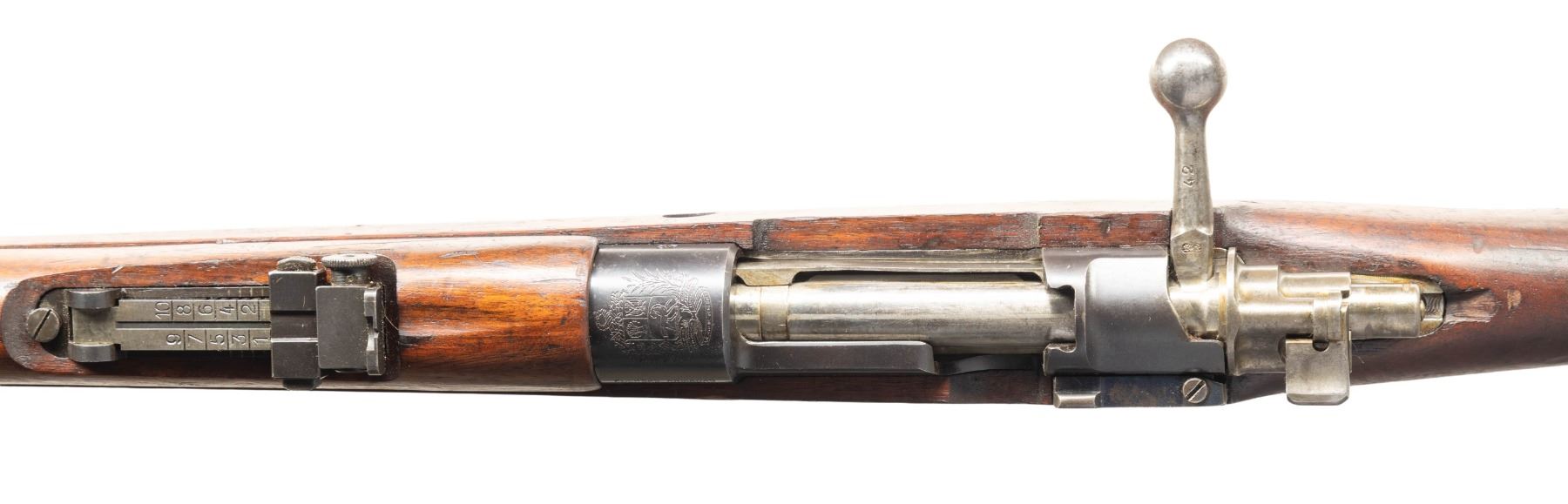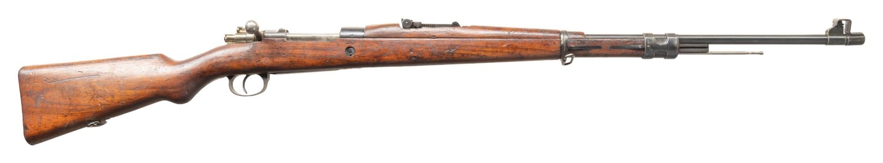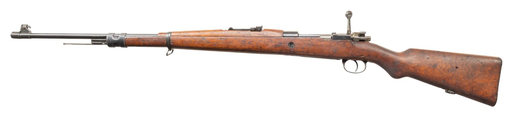 Cal. 7mm Mauser. S# 42. Bbl. 27" with illegible import marking. Tall blade front sight. Adjustable target rear sight graduated to 1000m. All visible matching numbers. One of an estimated 400 FN Model 1930 Mauser rifles that were arsenal converted for international competition in the 1950's. Receiver ring has Venezuelan crest. Arsenal rework blued finish. Walnut stock set with bottom mounted sling swivels. Cleaning rod present. UNATTACHED ACCESSORIES: black muzzle cover that does not fit all the way. CONDITION: stock set shows scattered dings, staining & handling marks. Metal retains 70% arsenal rework blue with some light dings on bbl., scattered oxidation, handling marks & edge wear. Very good bore with strong rifling. Action functions properly when hand cycled. PROVENANCE: From the PMRB Collection. (25-5994/MJC). CURIO. $500-700.