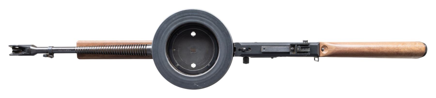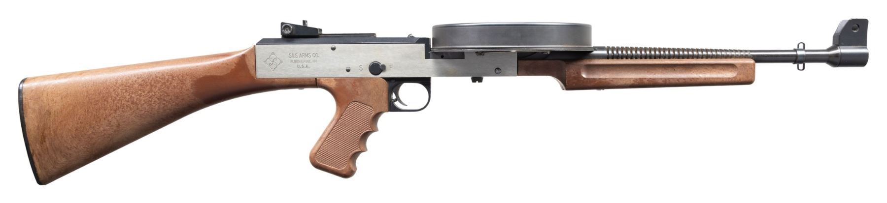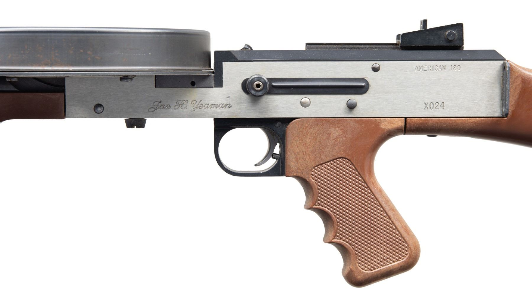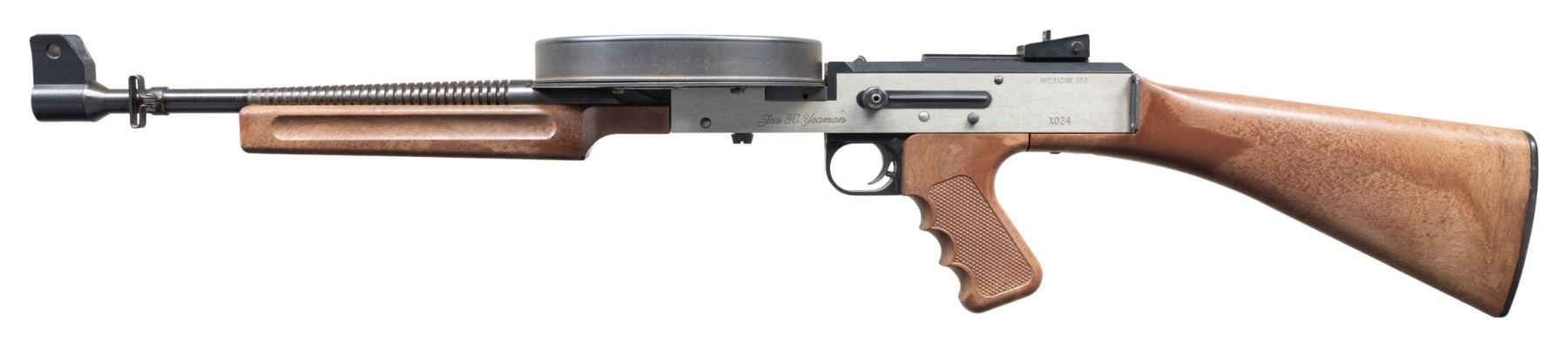 RIMFIRE SUBMACHINE GUN. Cal. 22 LR. S# X024. Bbl. 16.5". Originally mfg. & imported from Austria, the earliest American 180 variants were classified as Dealer Samples due to the inability to import transferable machine guns after 1968. E&L mfg. started building a version in the United States & since they were domestic in mfg., these were fully transferable firearms. Research has indicated that approx. 24 examples were mfg. & registered by S&S Arms. It's interesting to note that this particular gun bears the S# X024, possibly being the last firearm produced. The American 180 is an open bolt, select fire 22 LR buzz saw that feeds from a 176 rd., 3 tiered drum. The cyclic rate is often rumored to be in excess of 2000 RPM & a single burst in a full mag. is completed in only 7 seconds. The sound is as unique as its appearance, compared more to that of a chainsaw than a firearm because of the excessive cyclic rate. The bbl. is finned in a similar style to that of the legendary Thompson w/ a protected blade front sight & an adj. peep rear sight. The forend, pistol grip & shoulder stock are a brown plastic designed to imitate wood aesthetics. Pistol grip is checkered w/ finger grooves. Finish on all exposed metal parts w/ the exception of the natural finished aluminum receiver, is blued or black paint. Left side non reciprocating charging handle. Safety is located on the right side of the receiver. The selector is a cross slide pin. When pushed from left to right, full auto is selected & will continue to fire as long as trigger is held to the rear. When the pin is pushed in from the right, it is an open bolt semi auto action. The unique drum, w/ winding assembly is mounted on the top, above the chamber, forward of the trigger. The ejection port is below the firearm forward of the trigger. Receiver marked on left side w/ name of previous owner tastefully engraved just above ejection port. Right rear markings are "AMERICAN 180" over "X024". Right side receiver markings include "S&S" logo & "S&S ARMS CO."/ "ALBUQUERQUE, NM"/ "U.S.A.". Bbl. marked on top w/ 2 indistinguishable marks, "73" & "AMERICAN INTERNATIONAL CORP"/ "SLC. UTAH USA"/ "A001881". Top of bbl. just rear of front sight marked "MADE IN AUSTRIA". Removable rear stock locks w/ a single pushbutton to the rear of the receiver similar to that of a Thompson SMG. Sling swivels front & rear on left side. MAGS: 2 steel 176 rd. drums w/ 1 winder. CONDITION: original finish enjoys full coverage on exposed metal surfaces w/ only gentle thinning to indicate prior use. No major visible flaws of any type. Plastic furniture exhibits only light handling marks, however the rear portion of the shoulder stock leans more towards a matte finish. Bright bore w/ visible rifling. Fire control mechanism appears to function correctly when cycled by hand. Both drums appear to have seen little use & both rotate freely. NATIONAL FIREARMS ACT SMG REQUIRING BATF TRANSFER BEFORE TAKING POSSESSION. FULLY TRANSFERABLE. (03-1938/JZ). MODERN CLASS III. $15,000-20,000.