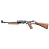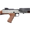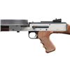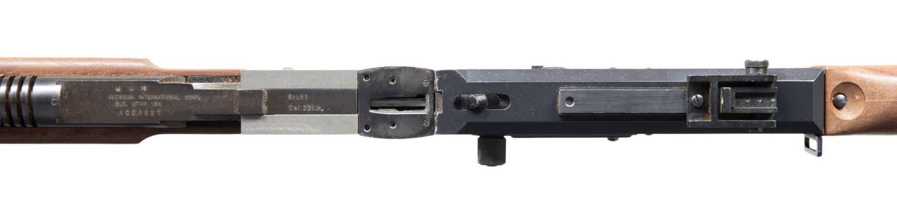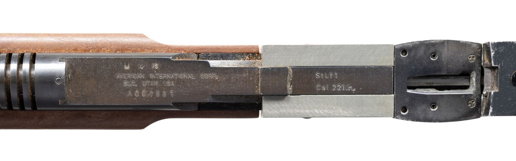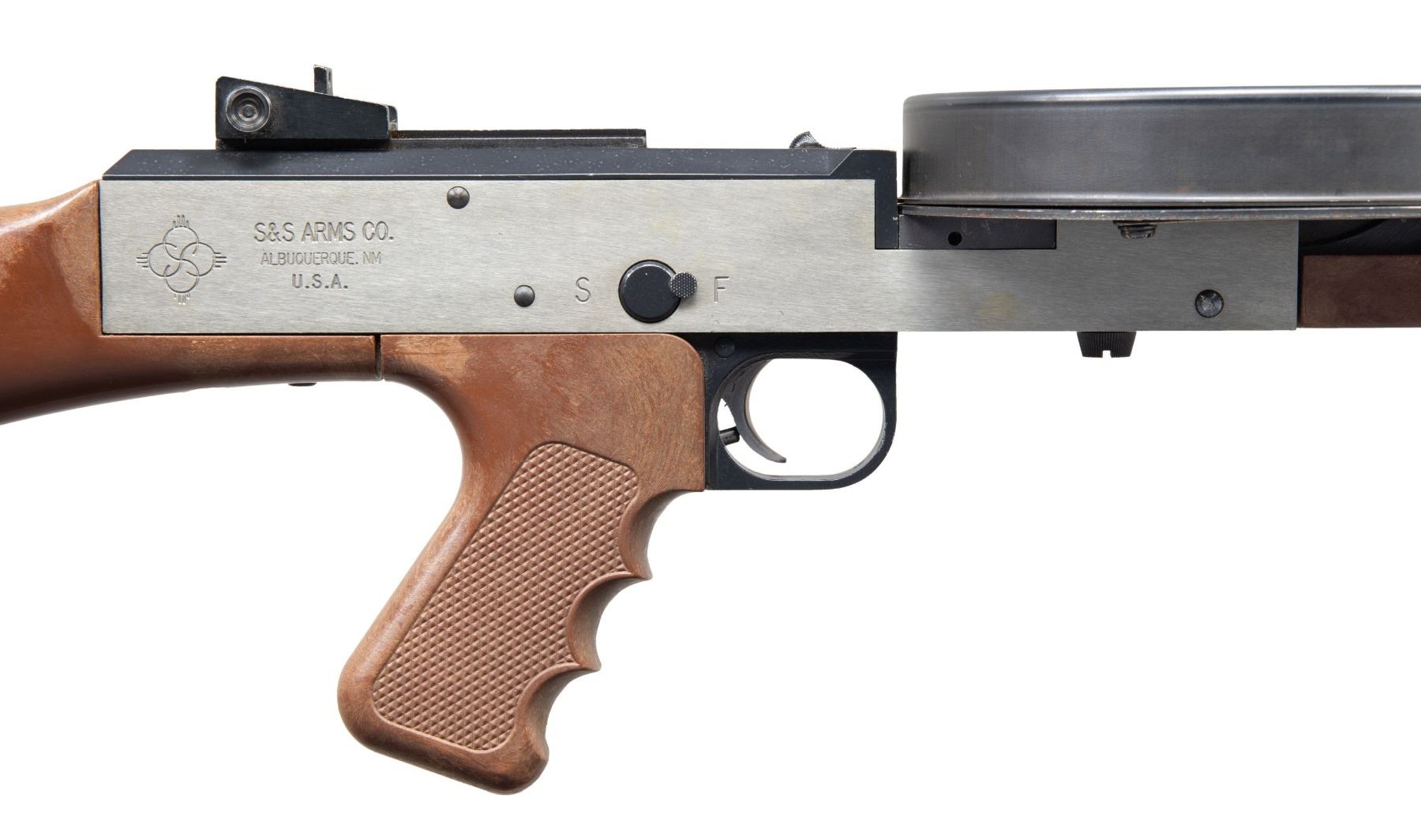 RIMFIRE SUBMACHINE GUN. Cal. 22 LR. S# X024. Bbl. 16.5". Originally mfg. & imported from Austria, the earliest American 180 variants were classified as Dealer Samples due to the inability to import transferable machine guns after 1968. E&L mfg. started building a version in the United States & since they were domestic in mfg., these were fully transferable firearms. Research has indicated that approx. 24 examples were mfg. & registered by S&S Arms. It's interesting to note that this particular gun bears the S# X024, possibly being the last firearm produced. The American 180 is an open bolt, select fire 22 LR buzz saw that feeds from a 176 rd., 3 tiered drum. The cyclic rate is often rumored to be in excess of 2000 RPM & a single burst in a full mag. is completed in only 7 seconds. The sound is as unique as its appearance, compared more to that of a chainsaw than a firearm because of the excessive cyclic rate. The bbl. is finned in a similar style to that of the legendary Thompson w/ a protected blade front sight & an adj. peep rear sight. The forend, pistol grip & shoulder stock are a brown plastic designed to imitate wood aesthetics. Pistol grip is checkered w/ finger grooves. Finish on all exposed metal parts w/ the exception of the natural finished aluminum receiver, is blued or black paint. Left side non reciprocating charging handle. Safety is located on the right side of the receiver. The selector is a cross slide pin. When pushed from left to right, full auto is selected & will continue to fire as long as trigger is held to the rear. When the pin is pushed in from the right, it is an open bolt semi auto action. The unique drum, w/ winding assembly is mounted on the top, above the chamber, forward of the trigger. The ejection port is below the firearm forward of the trigger. Receiver marked on left side w/ name of previous owner tastefully engraved just above ejection port. Right rear markings are "AMERICAN 180" over "X024". Right side receiver markings include "S&S" logo & "S&S ARMS CO."/ "ALBUQUERQUE, NM"/ "U.S.A.". Bbl. marked on top w/ 2 indistinguishable marks, "73" & "AMERICAN INTERNATIONAL CORP"/ "SLC. UTAH USA"/ "A001881". Top of bbl. just rear of front sight marked "MADE IN AUSTRIA". Removable rear stock locks w/ a single pushbutton to the rear of the receiver similar to that of a Thompson SMG. Sling swivels front & rear on left side. MAGS: 2 steel 176 rd. drums w/ 1 winder. CONDITION: original finish enjoys full coverage on exposed metal surfaces w/ only gentle thinning to indicate prior use. No major visible flaws of any type. Plastic furniture exhibits only light handling marks, however the rear portion of the shoulder stock leans more towards a matte finish. Bright bore w/ visible rifling. Fire control mechanism appears to function correctly when cycled by hand. Both drums appear to have seen little use & both rotate freely. NATIONAL FIREARMS ACT SMG REQUIRING BATF TRANSFER BEFORE TAKING POSSESSION. FULLY TRANSFERABLE. (03-1938/JZ). MODERN CLASS III. $15,000-20,000.