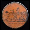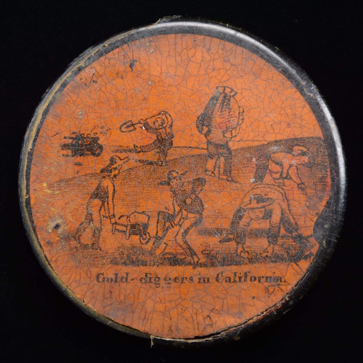 BOX. 2.75" diameter, circa 1850 lacquered paper-mache snuff box, satirical figures of several miners. CONDITION: label all discernible, darkened, crazed, about half of rim of lid missing. PROVENANCE: Martin Lane Historic & Western Americana Lifetime Collection. (02-21452/JS). $400-500.