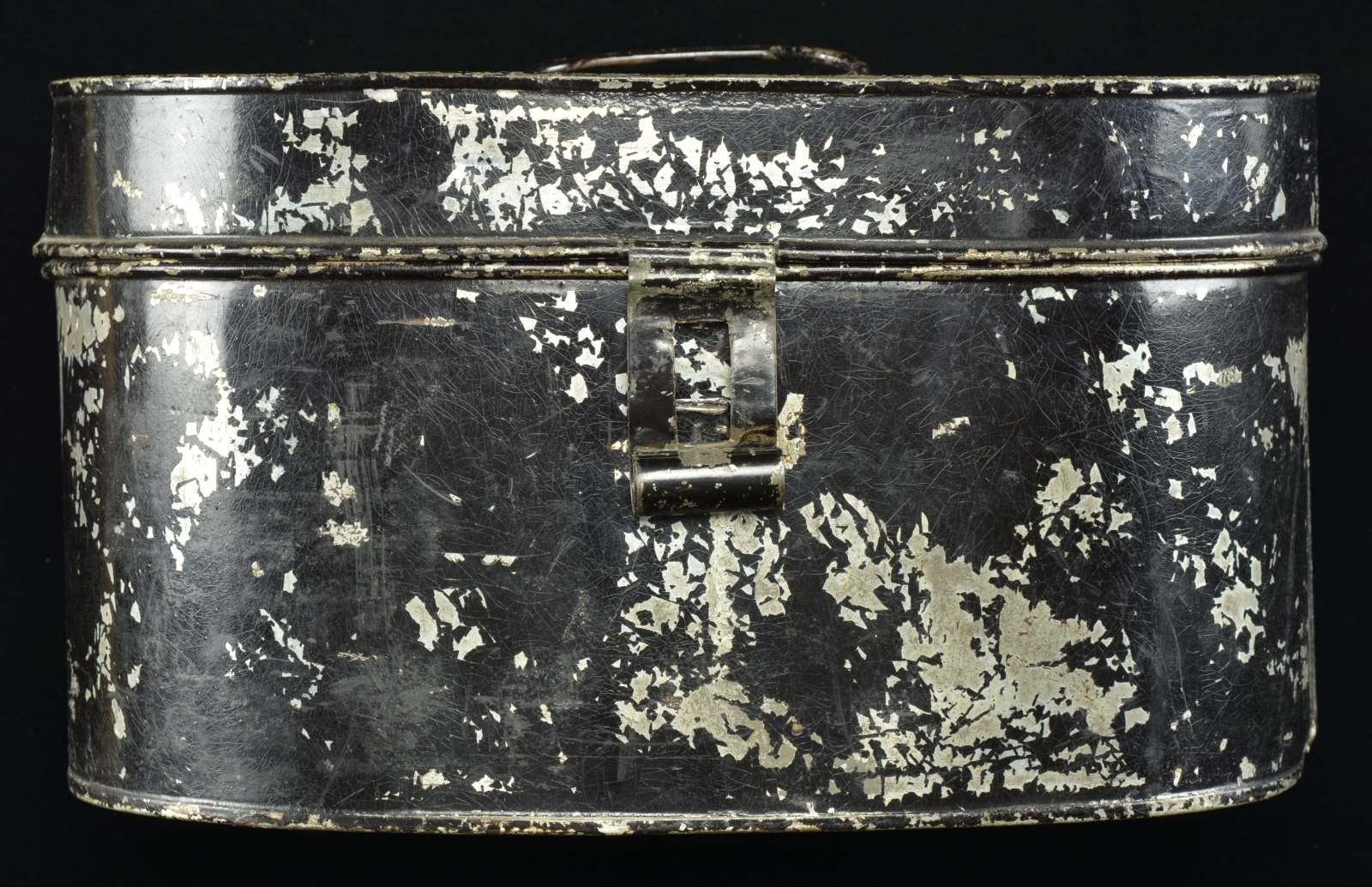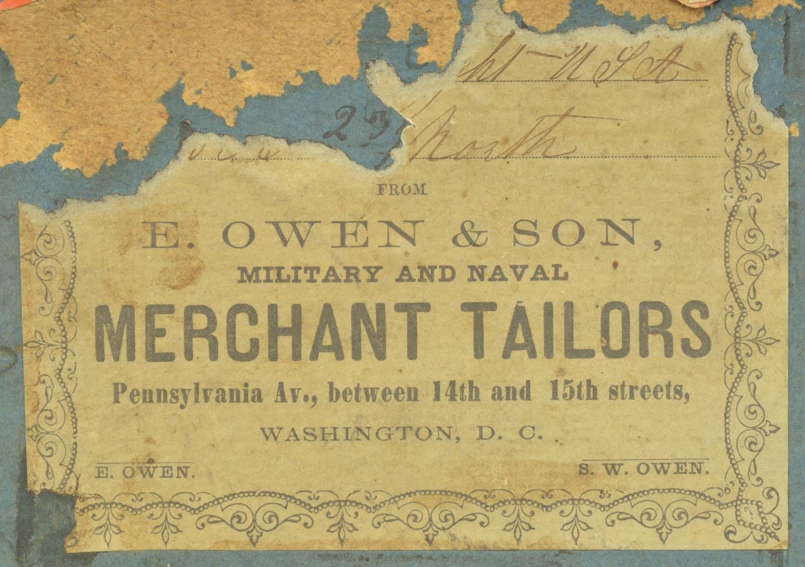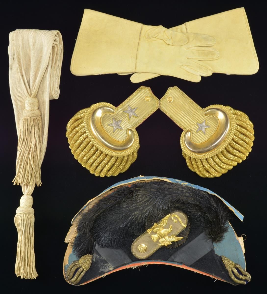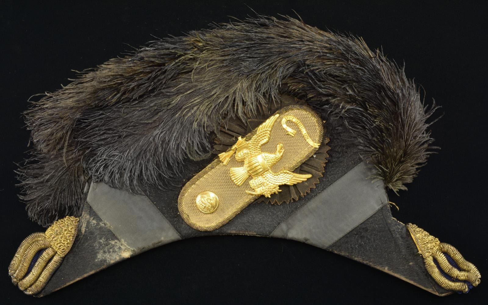 2. Chapeau de Bras, silk lined with New York maker’s label, “CHAPELLE PARISIENNE / D. BAUDIN / 648 BROADWAY / NEW YORK”, cockade with 3” gold washed American eagle with separate gold washed ribbon above with “E PLURIBUS UNUM” and 23mm engineer button. Chapeau is good overall, worn thin at edges, loss of felt forward of one silk ribbon as seen in photos. The original pasteboard box is in poor condition and apart but has General Wright’s name on box