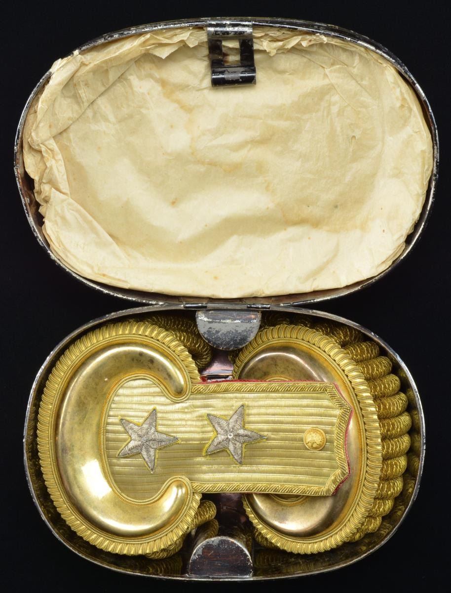 4. Cased pair of major general epaulets, one epaulet is missing second star, very good overall jappaned case is missing partitions and epaulets are loose with tissue paper packing inside. (02-17009/JS). $12,000-15,000.