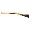 LEVER ACTION RIFLE. Cal. 45 Colt. S# BB0016748C. Bbl. 20" oct. Gold bead front sight. Sporting rear sight. Gold finished commemorative to the Indianapolis Motor Speedway. Numbered 77 out of 100 made by A&A Engraving of Rapid City, SD. Receiver has floral engraving w/ several scenes of racing including vintage motorcycling & automobile racing. Right side of receiver also has a plaque telling the history of the speedway. Both sides of bbl. have "1909 INDIANAPOLIS MOTOR SPEEDWAY 2009" markings. Top of bbl. marked "THE GREATEST RACE COURSE IN THE WORLD". Tang of buttplate has Culver Block brick engraving. Plastic band present on lever likely indicating this rifle is unfired. Walnut stock has several carvings of racing including vintage cars, NASCAR & open cockpit race cars. Butt & forend also have carvings of the Indianapolis Speedway logo. UNATTACHED ACCESSORIES: factory box matching numbered to gun, manual, gun sock w/ A&A Engraving sticker, a certificate of authenticity, a framed photo of the Indy 500 hall of fame w/ every winner from 1911 until 2008, a matching numbered wooden display case, factory display stand & paperwork from A&A Engraving. CONDITION: all aspects near new in box. (23-4795/MJC). MODERN. $10,000-15,000.