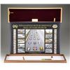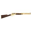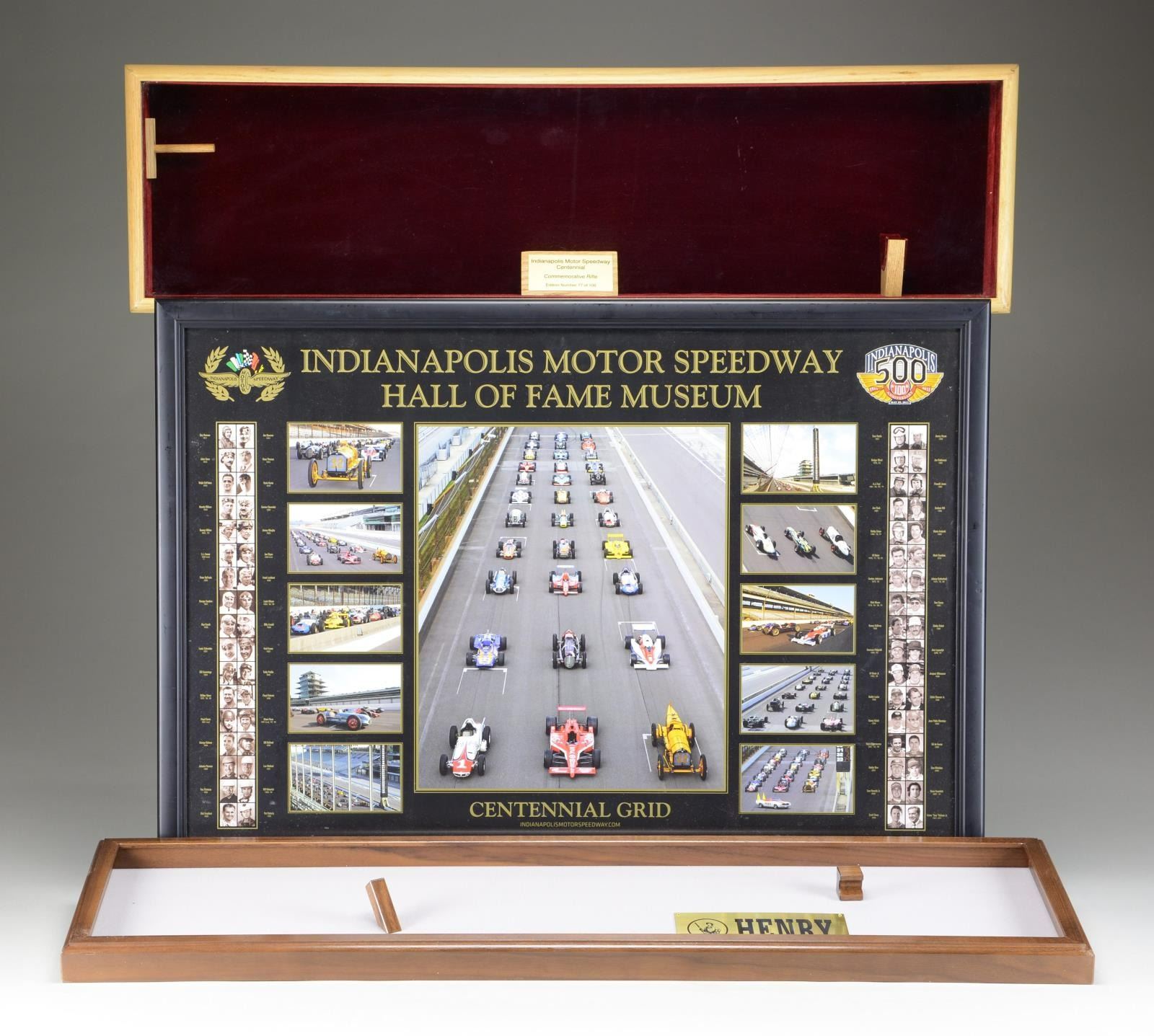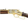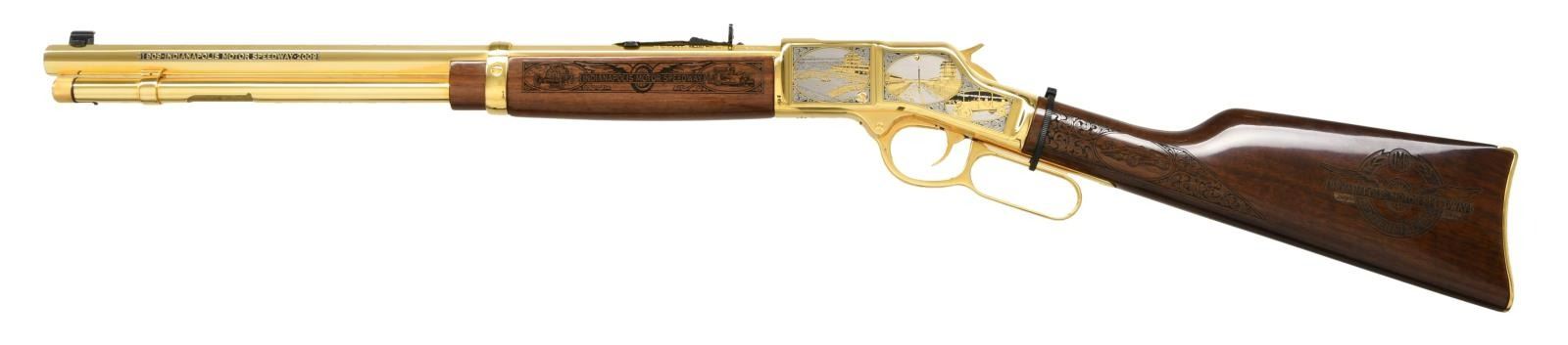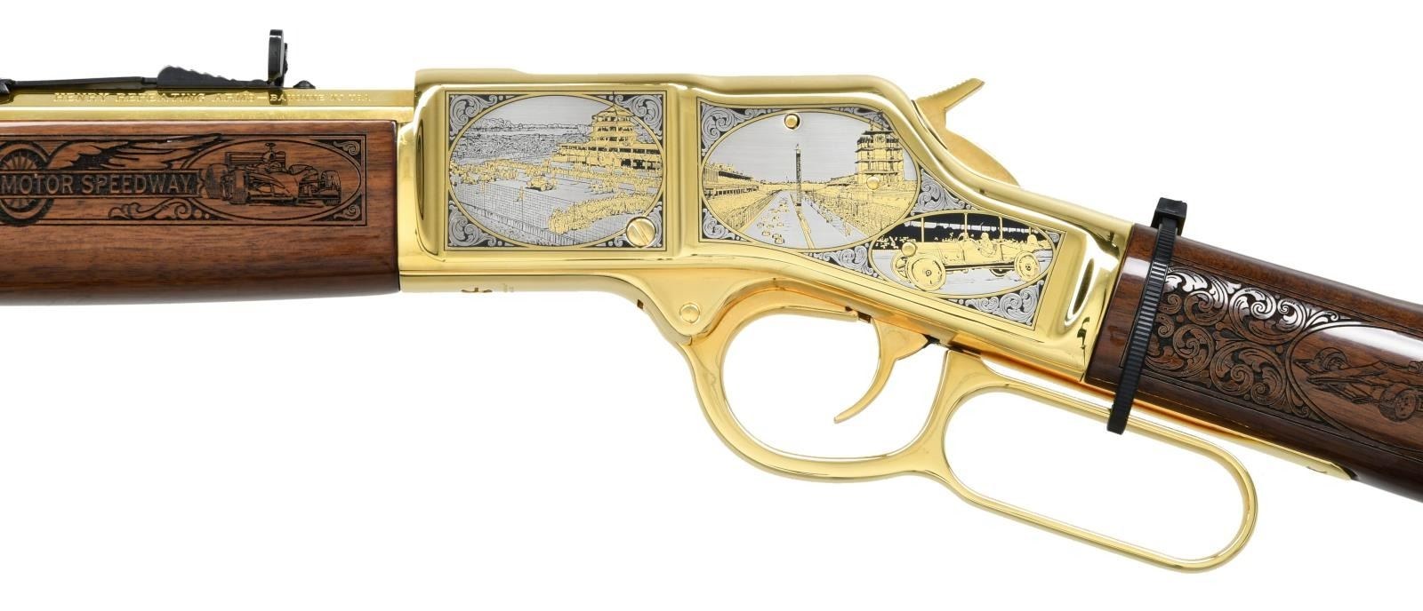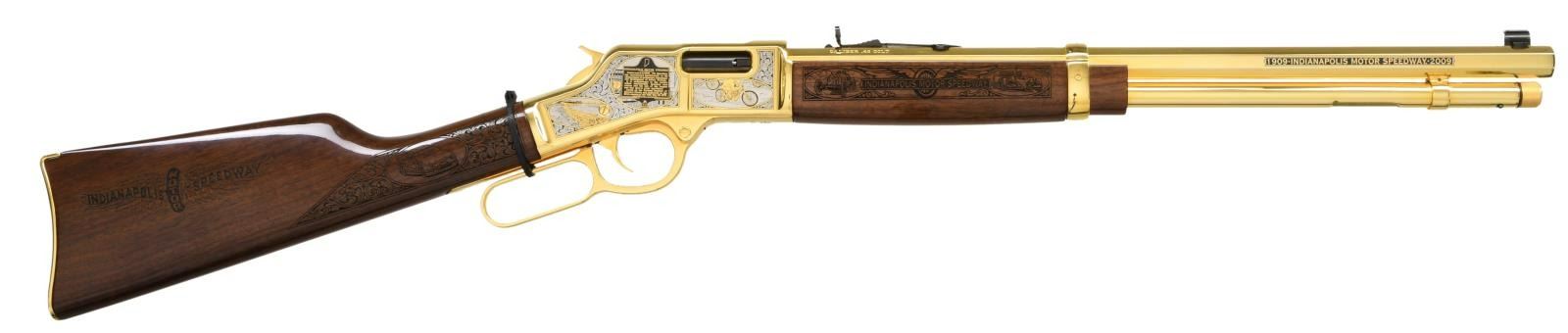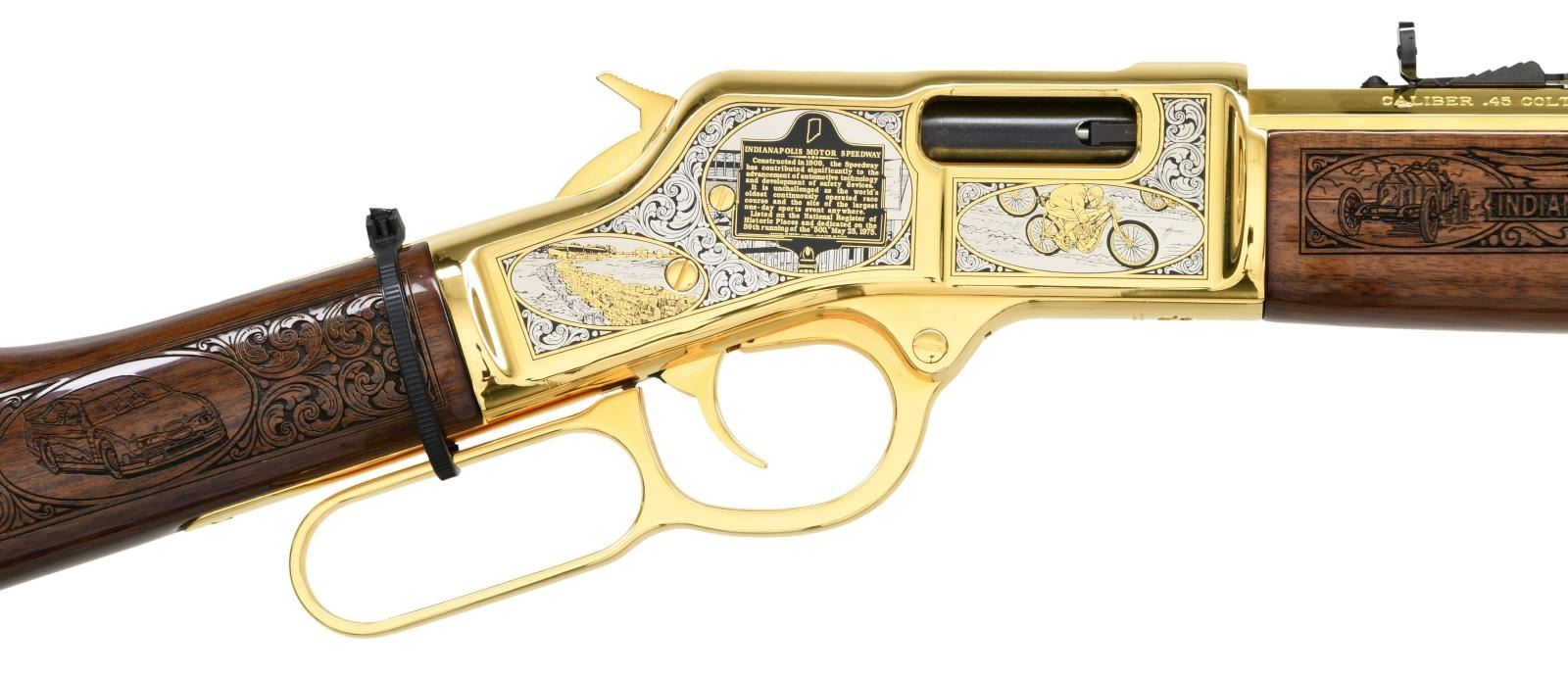 LEVER ACTION RIFLE. Cal. 45 Colt. S# BB0016748C. Bbl. 20" oct. Gold bead front sight. Sporting rear sight. Gold-finished commemorative to the Indianapolis Motor Speedway. Numbered 77 out of 100, made by A&A Engraving of Rapid City, SD. Receiver has floral engraving with several scenes of racing, including vintage motorcycling and automobile racing. Right side of the receiver also has a plaque telling the history of the speedway. Both sides of bbl. have "1909 INDIANAPOLIS MOTOR SPEEDWAY 2009" markings. Top of the bbl. is marked "THE GREATEST RACE COURSE IN THE WORLD". Tang of the buttplate has Culver Block brick engraving. Plastic band is present on the lever, likely indicating this rifle is unfired. Walnut stock has several carvings of racing, including vintage cars, NASCAR, and open-cockpit race cars. Butt and forend also have carvings of the Indianapolis Speedway logo. UNATTACHED ACCESSORIES: factory box matching-numbered to the gun; manual; gun sock with A&A Engraving sticker; a certificate of authenticity; a framed photo of the Indy 500 Hall of Fame with every winner from 1911 until 2008; a matching-numbered wooden display case; a factory display stand; and paperwork from A&A Engraving. CONDITION: all aspects are near new in the box. (23-4795/MJC). MODERN. $6,000-9,000.