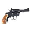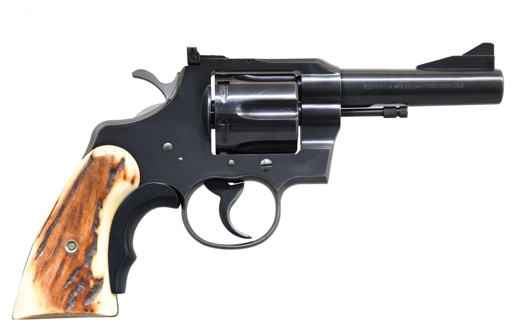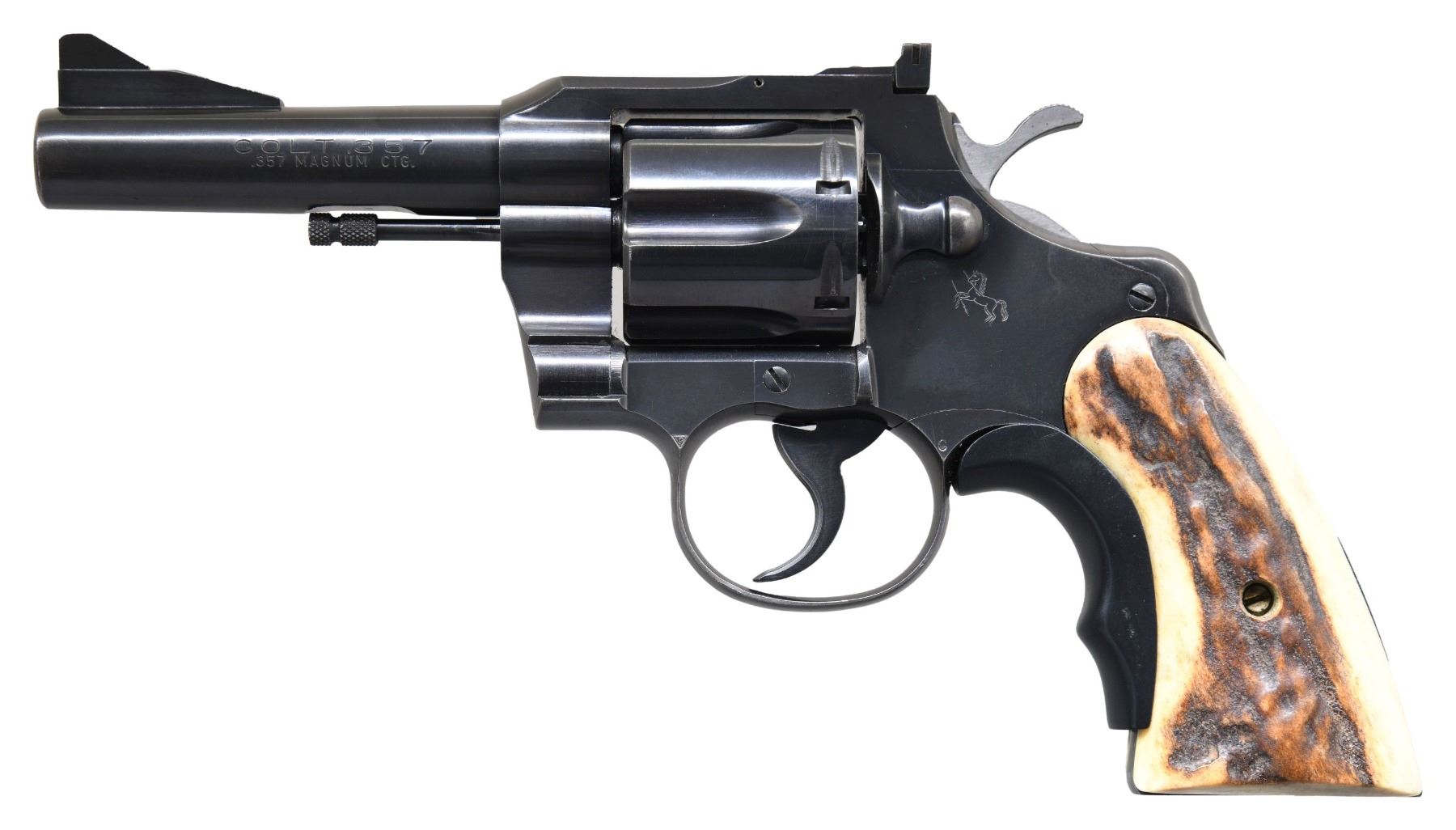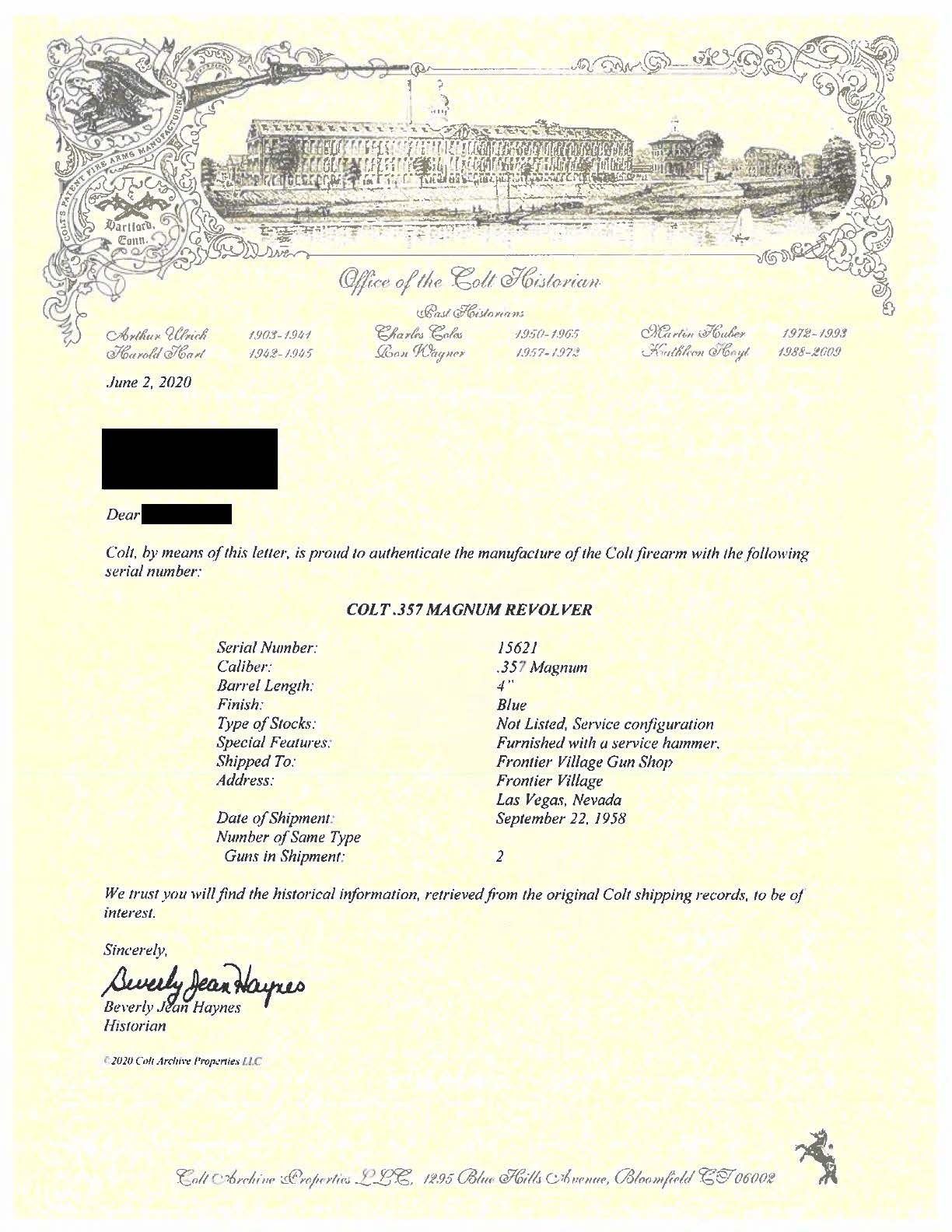 ACTION REVOLVER WITH FACTORY LETTER. Cal. 357 Mag. S# 15621. Bbl. 4". 1 of only 15,000 .357 Magnum Model double action revolvers mfg. by Colt prior to the mfg. of the Python. This example, mfg. in 1958, is marked "COLT .357/ .357 MAGNUM CTG." on the left side of the bbl., with Colt's single line address marked across the right. Left side of the frame is marked with Colt's "VP" proof, as well as the Rampant Colt logo. Metal components exhibit a blue finish overall, save for on the sides of the hammer, which are polished in-the-white. Serrated and ramped blade front sight, with adj. square notch rear sight. Frame is mounted with 2-piece stag grips, with a black enamel finished alloy grip extension mounted on the front grip strap. UNATTACHED ACCESSORIES: factory letter indicating "Type of Stocks:" as "Not Listed, Service configuration", "Special Features" as "Furnished with a service hammer", as well as indicating that this example was 1 of 2 revolvers shipped to Frontier Village Gun Shop in Las Vegas, NV on September 22nd of 1958. CONDITION: very good, with metal components retaining the vast majority of their original factory blue finish, exhibiting light to mild wear and thinning on the front edges of the bbl. and frame, some superficial handling marks, as well as a few spots of light surface oxidation overall. Grips straps exhibit some wear and thinning, with the underside of the bbl. exhibiting a small spot of finish loss. Mirror bore, exhibiting well defined rifling throughout. Grips are very good overall. PROVENANCE: From the Estate of Jon Thomas, Gunsport, LTD. (25-1121/MLW). CURIO. $500-800.
