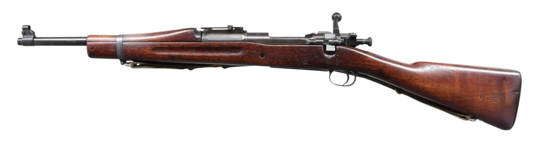 BUSHMASTER RIFLE. Cal. 30-06. S# 78748. Bbl. 18" with ladder rear sight graduated to 2850 yards. Blade front sight. Sight has issue protective hood marked on the left side with a circle "P". Bbl. is unmarked. Receiver has Rock Island Arsenal markings and the S# indicates a manufacture date of 1907. Replacement bolt with swept handle marked "BF" and "4". These rifles were modified by the ordnance shop in the Panama Canal Zone for use by the 158th infantry of the Oklahoma National Guard who needed a shorter handier rifle to cope with the jungles in Panama. Approximately 4,700 Model 1903 rifles were shortened 6" for use by the jungle security platoon while training in the heavy jungle foliage. Major General Robert H. Lewis, commanding the Panama Mobile Force command, obtained permission to make this alteration from Army Chief of Ordnance with the work being done at the ordnance shops at Couozal Canal Zone. The rifles were nicknamed Bushmaster for the deadly tropical pit vipers found in that area. When the 158th infantry was re deployed to the Pacific most, if not all, of these rifles were sent to Raritan Arsenal in N.J. and were destroyed. This specimen has seemingly escaped that fate. As with any arsenal reworking of a large number of rifles, parts are frequently interchanged or replaced. The bbls. were shortened to 18" & the front sight re mounted. The stocks were modified by removing the forend & handguard approx. 2 3/8" ahead of the lower band leaving the band retaining spring in place. The buttstock is an "S" type straight grip stock with grasping grooves. These stocks were given an arsenal rework finish at the time of conversion partially obscuring some of the markings. There is a partial boxed "SP" on the left side over the trigger guard. Encircled "P" proof under grip. The left side of the buttstock has a horizontally oriented "FT CLAYTON". Oriented vertically near the butt is the "JSP" marking of the Jungle Security Platoon and the encircled "Hell Gate" marking of the Panama Mobile Force. There is a rack #17 at the toe. The stock is equipped w/ a fine checkered stamped buttplate. Brown leather Model 1907 sling. Sling has heavy wear, scuffing and arsenal markings are not visible. UNATTACHED ACCESSORIES: there is a hand written note in the butt which states "R.I. A. "Bushmaster" #78748, purchased from K-Mart, San Antonio in 1968 for $69.95, from a crate sent from Panama, used by Jungle Security Platoon, out of Ft. Clayton. C.Z. made in 1907, converted in 1942. Rack #17, inspector S. Priestly, 1906-07. Panama Mobile Force insignia "HellGate"". Included are photocopies of the sale of this rifle in May 14, 2022 and information on these rifles are mentioned in the reference works "03 Springfield Service Rifle by Canfield and The Springfield 1903 Rifles by Brophy". CONDITION: stock set has a very professional appearing arsenal rework finish with light wear and scattered handling marks. The metal was given a blue refinish as the Ordnance shops in Panama were not equipped to do parkerizing. The metal has light wear, thinning and scattered handling marks with a number of small pits. There are a number of small pits in the area of the wood line and on both sides of the forward end of the barrel. Surface of barrel behind front sight has transverse scratches under the finish, likely from the use of a lathe steady rest. Good shiny bore w/ sharp lands and slightly gray appearance in throat area. PROVANANCE: from the estate collection of Thomas J. Mulligan. (23-1194/RW). CURIO. $.