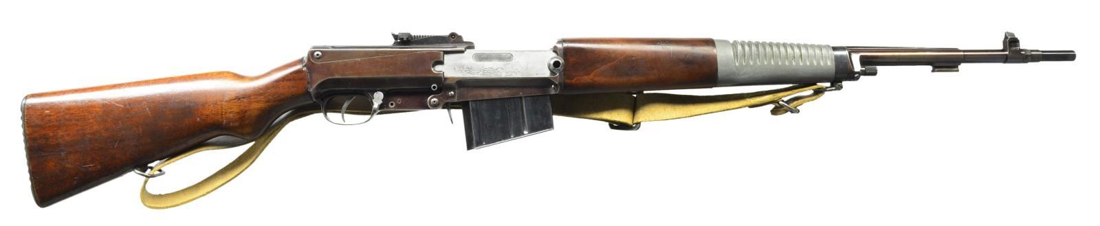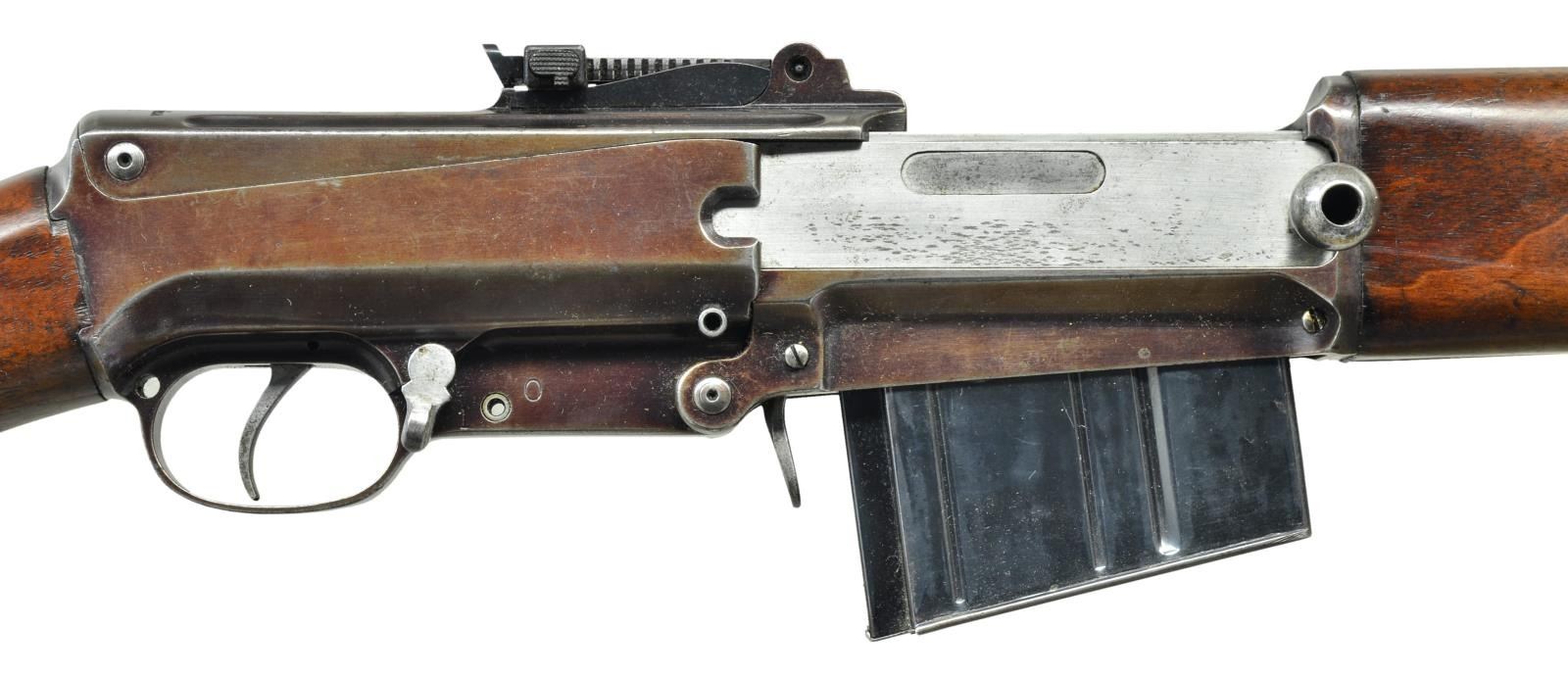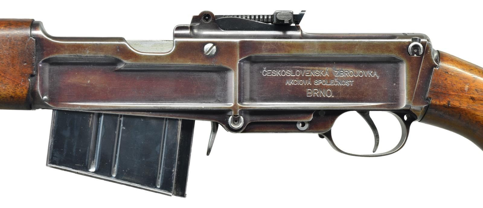 MILITARY RIFLE. Cal. 8x57 Mauser. S# 10209. Bbl. 23 5/16". Introduced in 1929, this rifle is a gas operated tilting block design by Emmanuel Holek, who was the brother of Vaclav Holek, designer of the Z.B. 26 LMG. The rifle has an unusual design in that the bolt locks into the left side of the receiver causing the breech to be offset to the left and requiring that the sights be offset to compensate. Features include the hinged receiver for takedown and cleaning as well as an adj. gas cyl. to regulate the operating pressure. Forend terminates in a cast aluminum block with cooling fins. Rifles were made primarily in 8x57 Mauser and given trial in many countries including the United States. According to Bruce Canfield in the book "The M1 Garand Rifle", the ZH 29 as trialed by the U.S. ordnance board was not well liked for its looks, but it did perform very well and importantly did not require lubricated ammunition. The rifle also weighed less than the minimum weight thought necessary & established that a full power rifle could be built within the weight limits desired by the U.S. Ordnance Department. This was a crucial element and turning point in the development of the M1 Garand rifle. Research reveals that the rifle was purchased in small quantities by China and Ethiopia, as well as being trialed by Japan, Lithuania and the U.S. Little record is available on combat use of this rifle, but there is little doubt it would have performed well under normal circumstances. Receiver marked on left side "CESKOSLOVENSKA ZBROJOVKA, AKCIOVA SPOLECNOST BRNO". Receiver marked on top rear "AUTOMATICKA PUSKA Z.H. 29." & "rampant lion". Tangent rear sight graduated to 1,600 meters. Inverted V front sight. Bayonet lug is mounted on bbl. shroud & has matching S#. Rotary safety on right side of rifle. Rifle is mfg. for detachable box mags. which can be loaded at the top using integral grip guides in receiver. Bottom swivels. Buttplate is grooved sheet metal. Walnut pistol grip buttstock & matching 2 piece walnut handguards. Unmarked tan leather military sling. MAGS: 1-10 rd. blued steel marked on rear w/ sm. encircled Z. CONDITION: has nice appearance but has evidence of a sm. degree of service use. Buttstock is slightly loose on receiver. Stock set has light wear, scratches & sm. handling marks. Metal parts have correct plum hue finish w/ scattered sm. spots of oxidation & modest high point wear. Aluminum cooling block has dull appearance & notable 4 sm. filled areas on left side. Bright bolt has numerous tiny scratches on left side. Bore has good shiny appearance w/ strong sharp lands. (22-1038/RW). CURIO. $13,000-19,000.