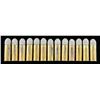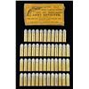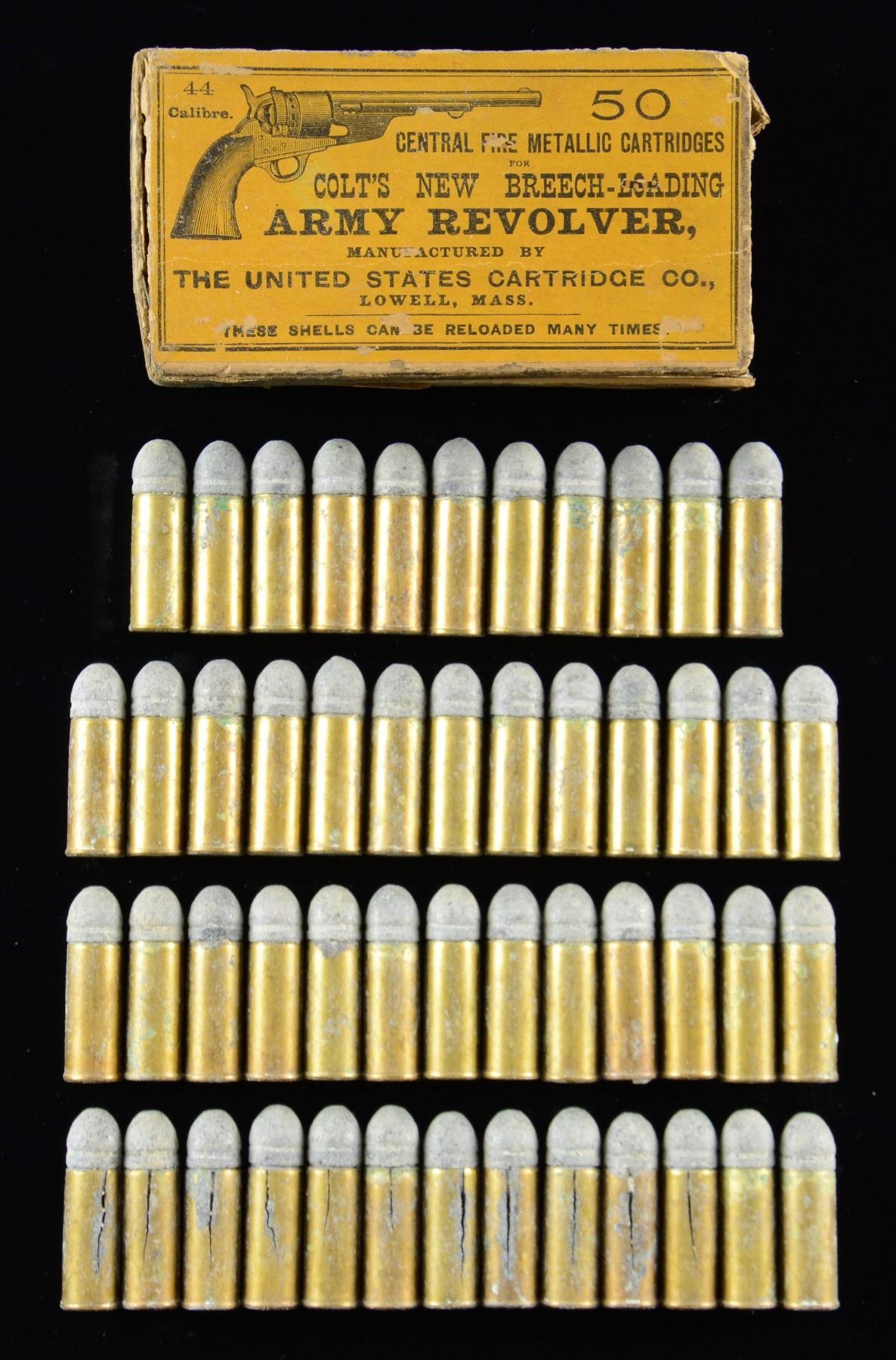 CONVERSION 1860 ARMY REVOLVERS, 44CF, CIRCA 1875. Orange/yellow label "United States Cartridge Co" box of 50 cartridges "44 / CALIBRE" for "COLT'S NEW BREECH-LOADING / ARMY REVOLVER". Illustrated with early 12-stop Richards Conversion Army revolver. CONDITION: box shows large pieces detached & edges torn. At least 11 of the original 49 cartridges show large splits in casing along with oxidation. (02-23301/ MD/JS). $200-300.