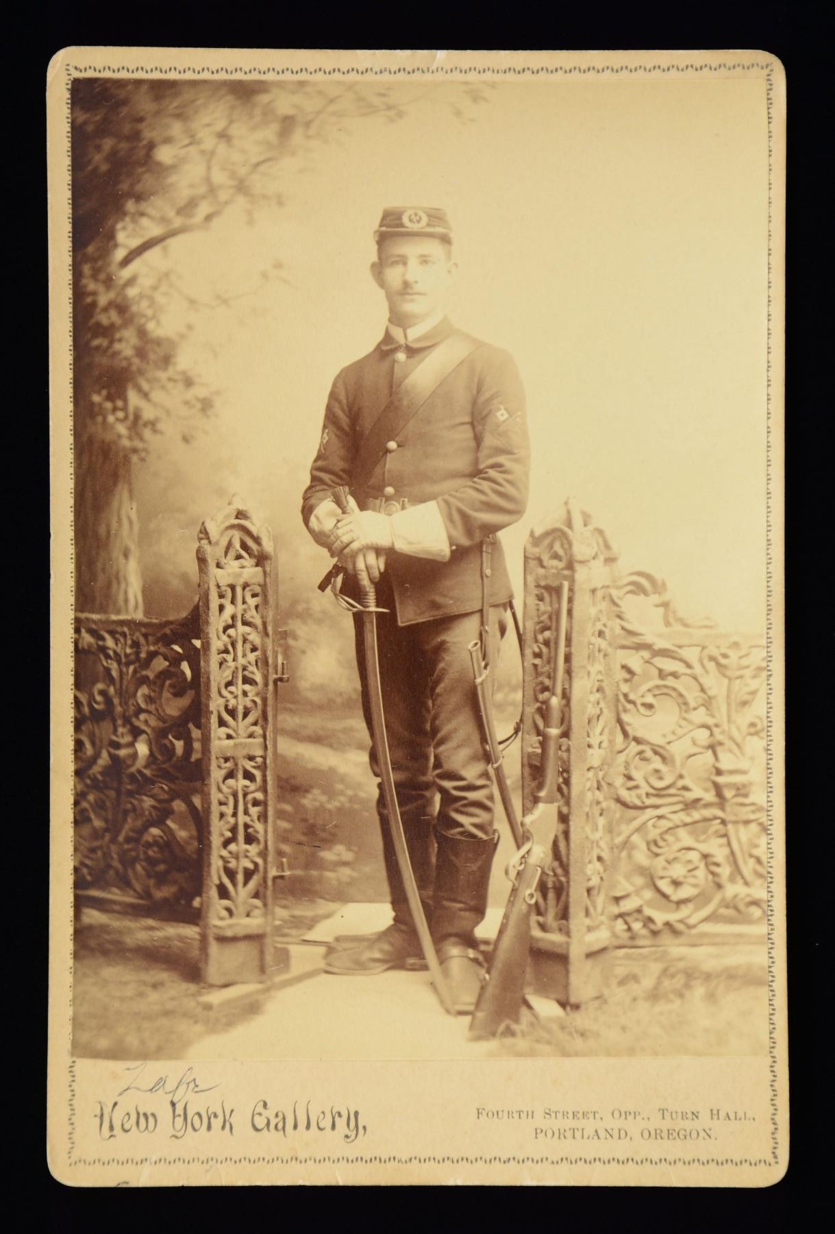 WITH SPENCER CARBINE. You will not find a crisper photograph of a trooper (Lafayette Wells) circa 1885 with signal corps insignia on sleeve and cap, wearing a model 1832 two piece interlocking US buckle, holding 1860 cavalry saber, Spencer carbine leaned against gate in foreground, stabler devise clearly seen. This image was taken in Portland, Oregon and "Lafayette Wells" penned on reverse. CONDITION: very good overall, light toning. PROVENANCE: From the Lifelong Collection of Glen E. Mattox. (02-23318/MD). $200-400.