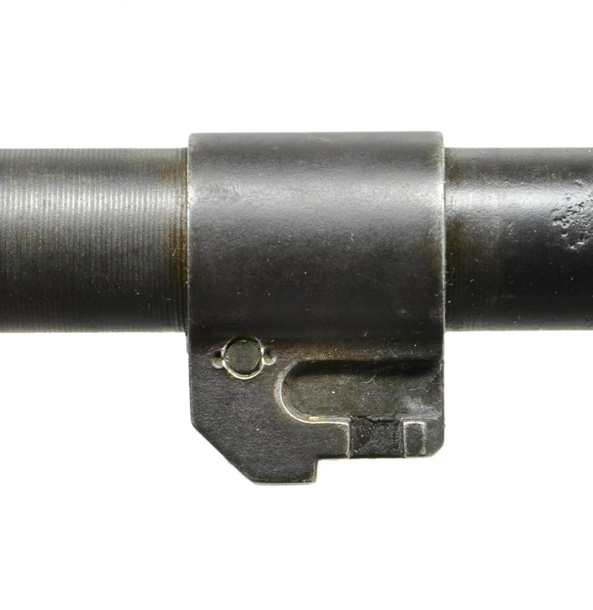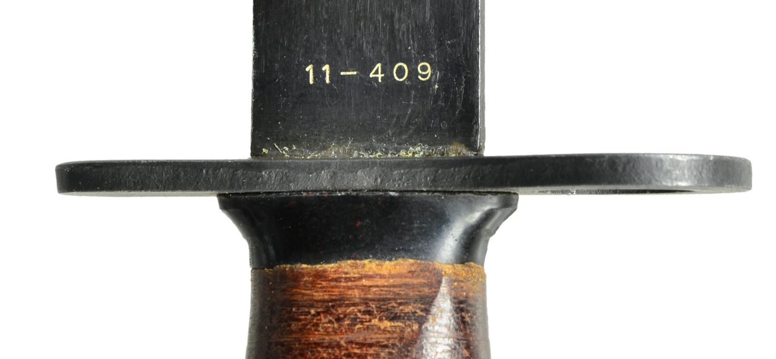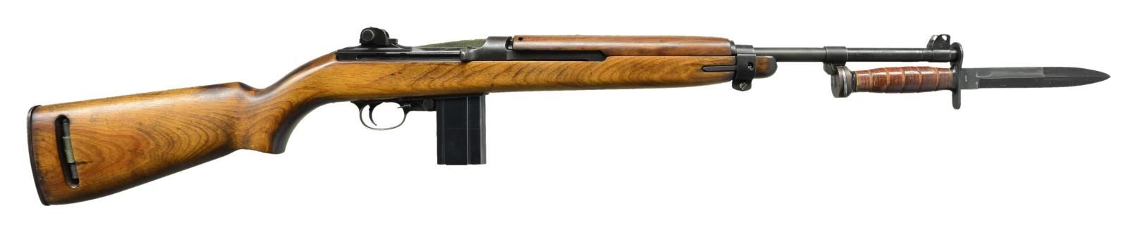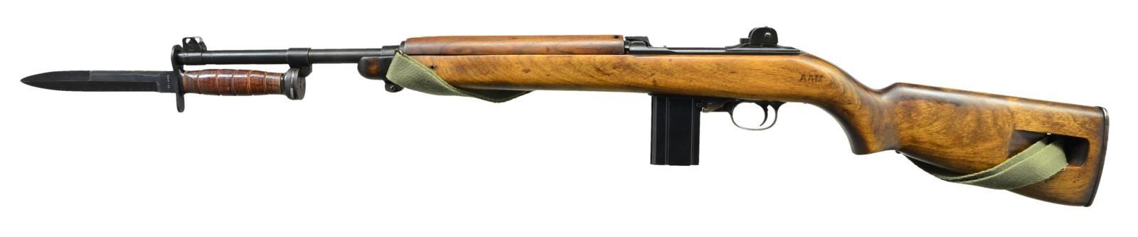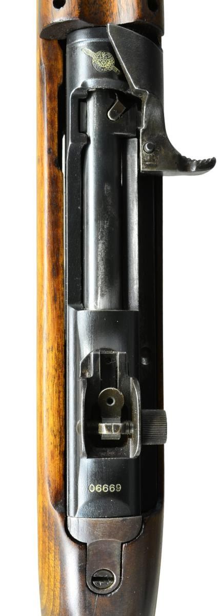 WITH CORRECT JAPANESE BAYONET. Cal. 30 Carb. S#. 06669. All visible S#'s match; S#'d parts include receiver, bbl., bolt, slide, trigger guard, buttstock & handguard. Bbl. 18 ". Bbl. has faint underwood marking & flaming bomb behind front sight. These carbines were made in Japan for the Japanese Ground Self-defense Force. Howa Industries was the sole licensed producer of these rifles along w/ other military equipment in Japan. The total production is thought to have been approx. 10,000 of these rifles. These rifles were reportedly sold to Australia & other countries in the Far East when they were no longer needed in Japan & very few were imported into the United States. The U.S. imports supposedly had their bayonet lugs removed, but a very few, including this example, escaped this provision. The rifles were produced to the extent possible using surplus U.S. parts, including used stocks & handguards w/ newly mfg. receivers, slides & trigger housings. Receiver ring marked w/ what appears to be a dagger and rnd. shield. Japanese produced adjustable flip type aperture rear sight. Blade front sight w/ protective ears. Bayonet lug is attached to bbl. Bbl. band is unmarked. 6 O'clock type slide. Rnd. bolt. Milled trigger guard. Rotary safety. Mag. catch has support for 30 rd. mags. Straight cut hammer. Low wood oval cut buttstock marked in sling slot w/ "J", marked "B" at the end of pistol grip &"P" under grip. Marked on left side w/ "AAM" rebuild mark. Green nylon sling. 2 rivet deep grooved handguard marked "NP". MAGS: 1 unmarked 15 rd. UNATTACHED ACCESSORIES: 6 1/2" blade bayonet. Marked on left ricasso w/ "11-409". Marked on right ricasso "JAPAN". Bayonet is close copy of U.S. M-4 carbine bayonet w/ leather washer handle. Plastic & webbed scabbard appears to be Japanese production. Scabbard is marked on steel throat "U.S. M8A1". Bayonet & scabbard in very good condition w/ light wear & handling marks. Includes reprinted copies of magazine articles & photographs. CONDITION: stock set has arsenal rework type finish w/ light wear & handling marks & slight loss of wood in buttplate area. Metal retains lg. degree of dark parkerized finish w/ light wear & handling marks. Good bore w/ lightly worn lands & light frosting. (22-697/RW). CURIO. $1,000-1,500.