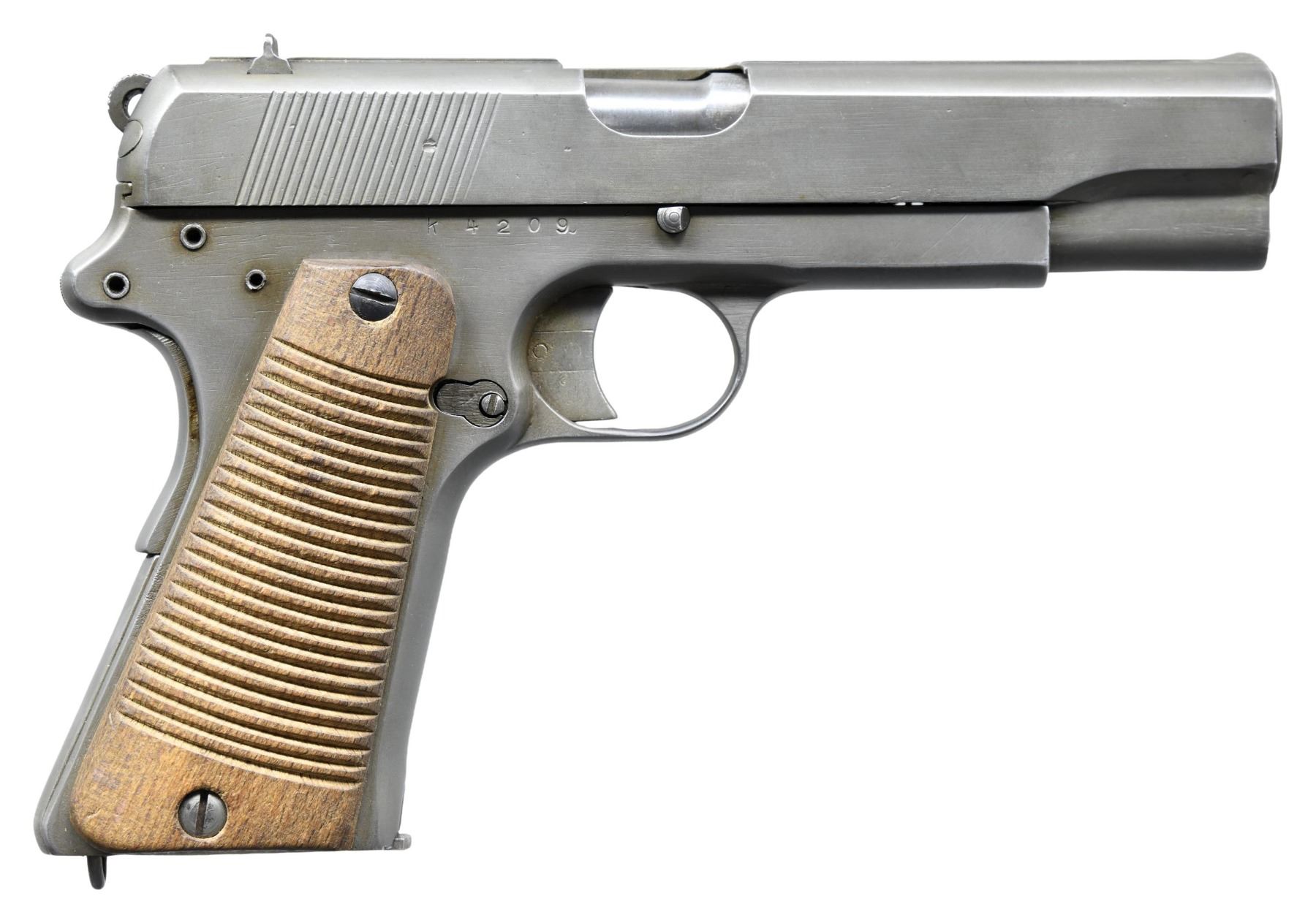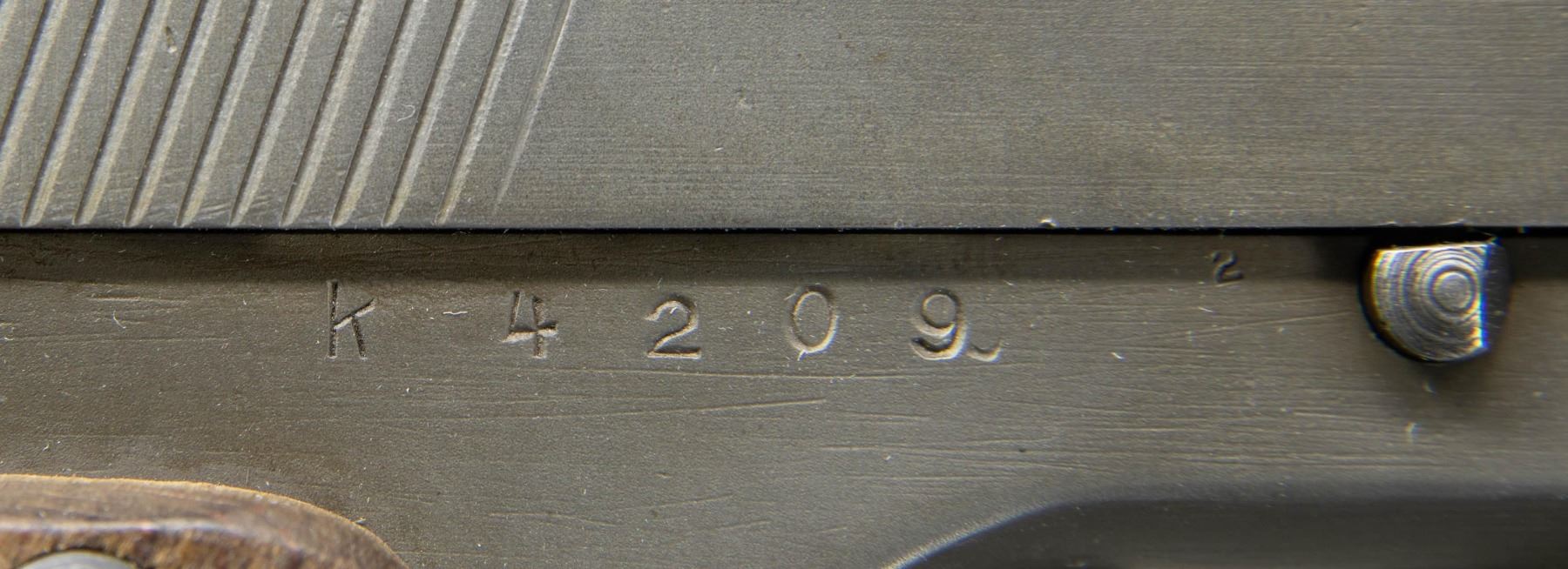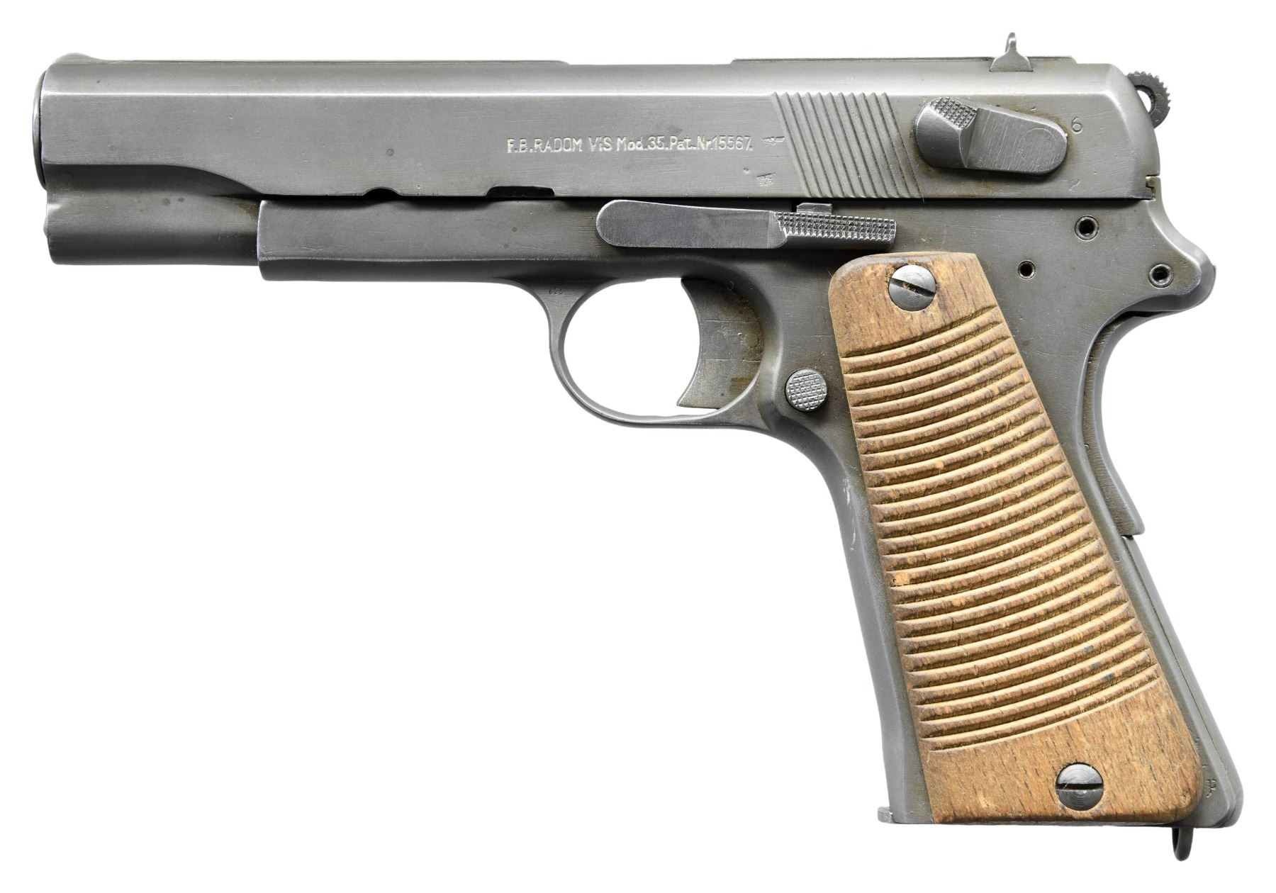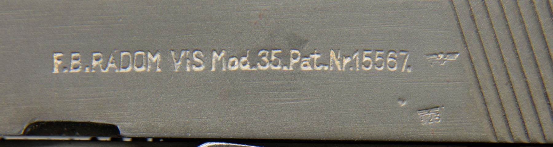 RADOM VIS.35 SEMI-AUTOMATIC PISTOL. Cal. 9mm Luger. S# K4209. Bbl. 4 5/8". Vis.35 (German designation: P.35(p)") semi-automatic pistol mfg. by Steyr at their Znaim factory. Left side of the slide is marked "F.B.RADOM VIS Mod.35.Pat.Nr.15567.", followed by an eagle firing proof above a Steyr Eagle/623 proof. Left side of the forward trigger guard web and bbl. lug exhibit a Steyr Eagle/623 proof. Metal components the bbl., which is polished in-the-white. Frame is mounted with 2-piece grooved wood grips. Slide features a matte rib, with a fixed blade front sight and dovetailed V-notch rear sight. All serialized parts are matching and include the frame, slide (underside of right slide rail), as well as the bbl. MAGS: 1 phosphate 8-rd. mag., marked with a Steyr Eagle/623 proof on the right. CONDITION: metal components retain the vast majority of their reapplied phosphate finish, exhibiting some light edge wear, as well as some small scattered spots of age related discoloration. Very bright bore, exhibiting consistent light pitting, while retaining well defined rifling throughout. Grips show a few superficial marks from handling and storage, but otherwise remains sturdy and serviceable. PROVENANCE: The Estate Collection of Charles Wagner. (25-357/MLW). CURIO. $1,500-2,500.
