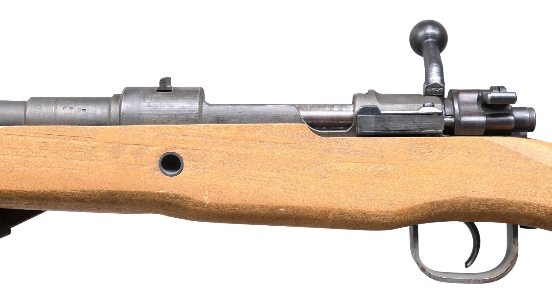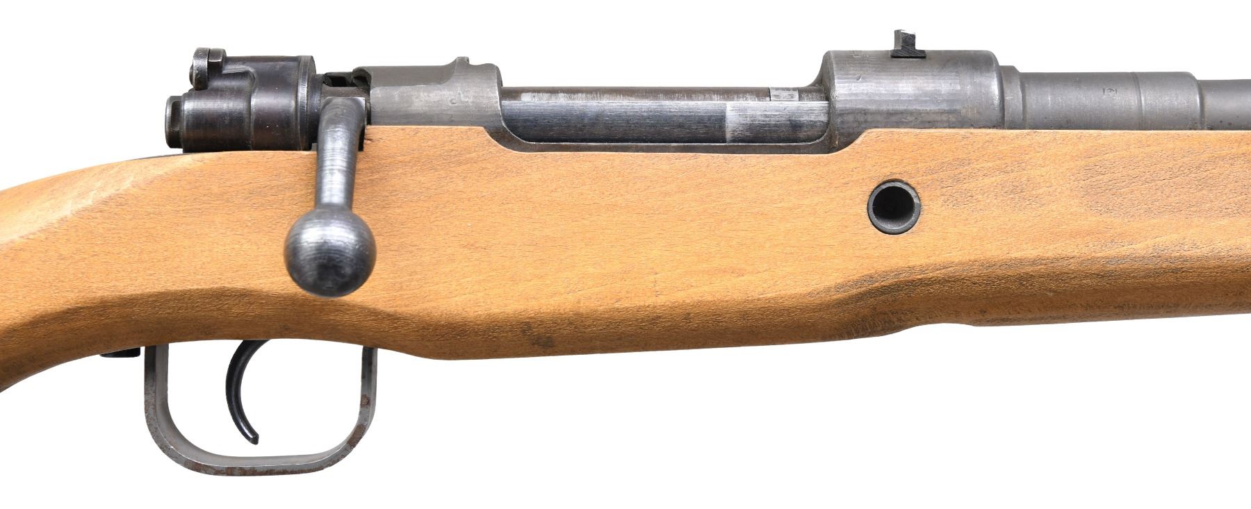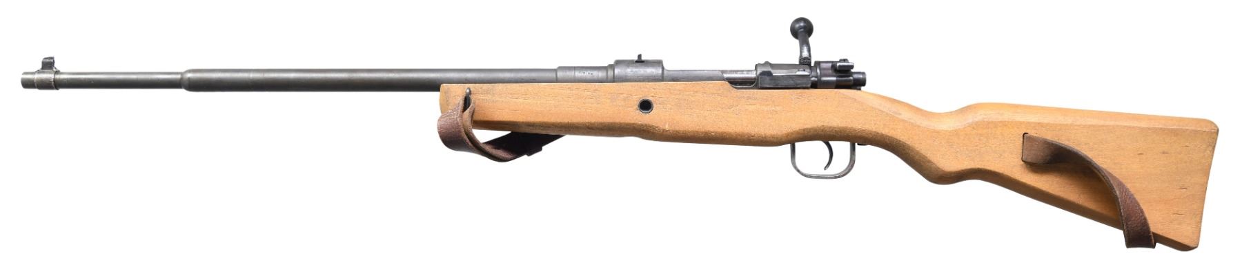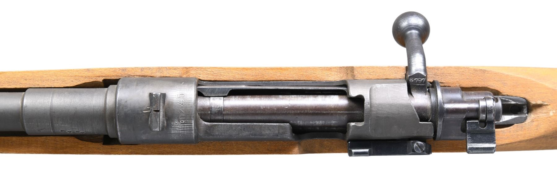 Cal. 8x57 (8mm Mauser). S# 6797. Bbl. 21". Blade front sight. Fixed rear sight. Matching numbers on bbl. & bolt handle. Other parts unnumbered & bottom of bolt has proper "V" marking. Simplified late war German Mauser style rifle made to arm Volksstrum with an estimated 10,000 being made. Receiver top marked "bnz 45" denoting Steyr mfr. in 1945. Phosphate finish. Beech "Slab" stock with leather sling. CONDITION: stock shows some light scratches & scattered handling marks. Metal retains 92% original phosphate with some edge wear, thinning & light oxidation mostly on trigger guard. Action functions properly when hand cycled. Very good + bright bore. (25-556/MJC). CURIO. $6000-9000.