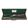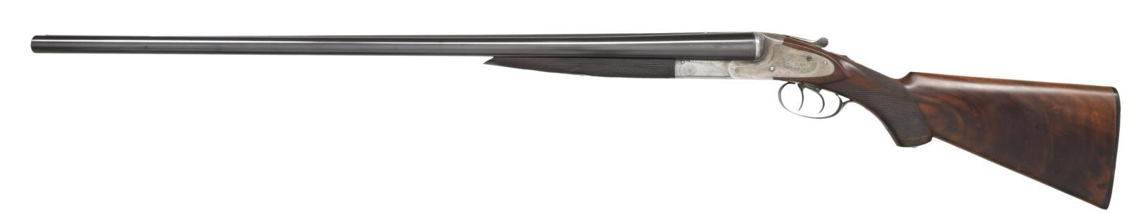 Cal.12 ga. 2 3/4" S#. 207255. Two barrel set, both barrels are 30" of Nitro Steel. This is the only Grade 4 shipped with 2 set of 30" barrels listed in the ledgers. Case colored sidelock action with selective ejectors & double triggers. The No. 4 engraving features oval scenes with pointing dogs. The scenes are surrounded by fine arabesque scroll that continues to upper & lower receiver areas as well as the trigger guard. the trigger guard bow is engraved with customer name "J. H. Shirk". The breech end of both bbls. have border line engraving. Rib extensions are marked "Hunter Arms Co., Fulton, NY". Each set of bbls has it individual splinter forend of ebony tipped thin shell walnut. Hard rubber capped pistol grip custom replacement stock of fancy walnut is checkered at the wrist. LOP: 13 1/2" over a proper style buttplate. DAC: 1 7/8". DAH: 2 5/8". Near neutral cast. BBL1: Bore diameter: RT .725, LT 727. Choke constriction: RT .034, LT .034. Minimum bore dia: RT .025, LT .030. BBL 2: Bore diameter: RT .729, LT .729. Choke constriction: RT .004, LT .020. Minimum bore dia: RT .026, LT .028. Weight: 7 lbs, 12.6 oz. UNATTACHED ACCESORIES: L.C. Smith Collectors Association letter providing general information & listing specifications for this gun as recorded on page 23 of Ledger 17. Completion date, January 26, 1907. Further stating "Serial Number 207255 was the only No. 4 shipped with two sets of 30" barrels." Total production of No. 4 shotguns from 1894-1915 was 495. No. 4 production in all gauges totaled 29 in 1907. Gun is housed in a leather covered case with green velour 2 bbl. fitted interior. Case lid exterior is marked with initials "H. S. M." Lid interior has an added L. C. Smith paper label. Case key is included. Case shows normal age related wear. CONDITION: Action retains 30% light case colors fading to a silvery gray. Both bbls. have over 95% blue. Both forearms are refinished with freshened checkering. Stock shows light wear & handling marks with hairline cracks behind both locks. All bore are very good & bright. (23-1616/DS) CURIO. $7000-10,000.
