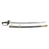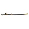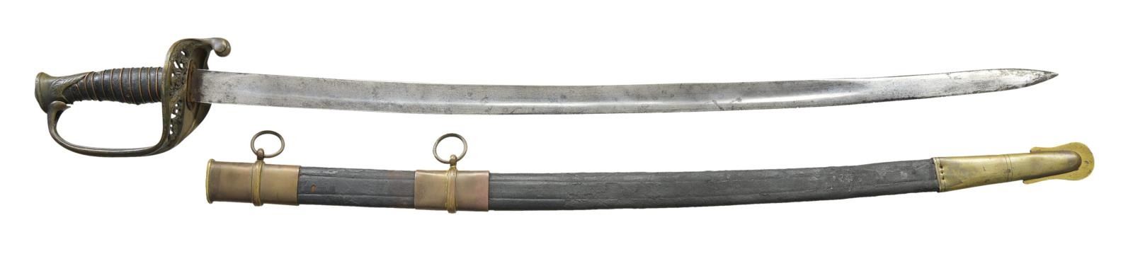 OFFICER SWORD. 30.25” unstopped fuller blade stamped lengthwise “DUFILHO / N. ORLEANS” in crisp marking 3” from ricasso. The brass hilt has Dufilho casting features, bulbous undecorated quillon, pommel cast in 2 pieces. CONDITION: very good overall, blade is gray/bright, staining & light pitting near tip. Grip retains about 60-70% original leather with added heavy single strand copper wire wrap which appears original to time of use. Protected under pommel is segment of the original Dufilho twisted brass wire wrap. Hilt & pommel have uncleaned olive/dark mustard patina. The accompanying brass mounted scabbard fits sword well but not a product of Dufilho. (02-19151/JS). $3,000-4,000.