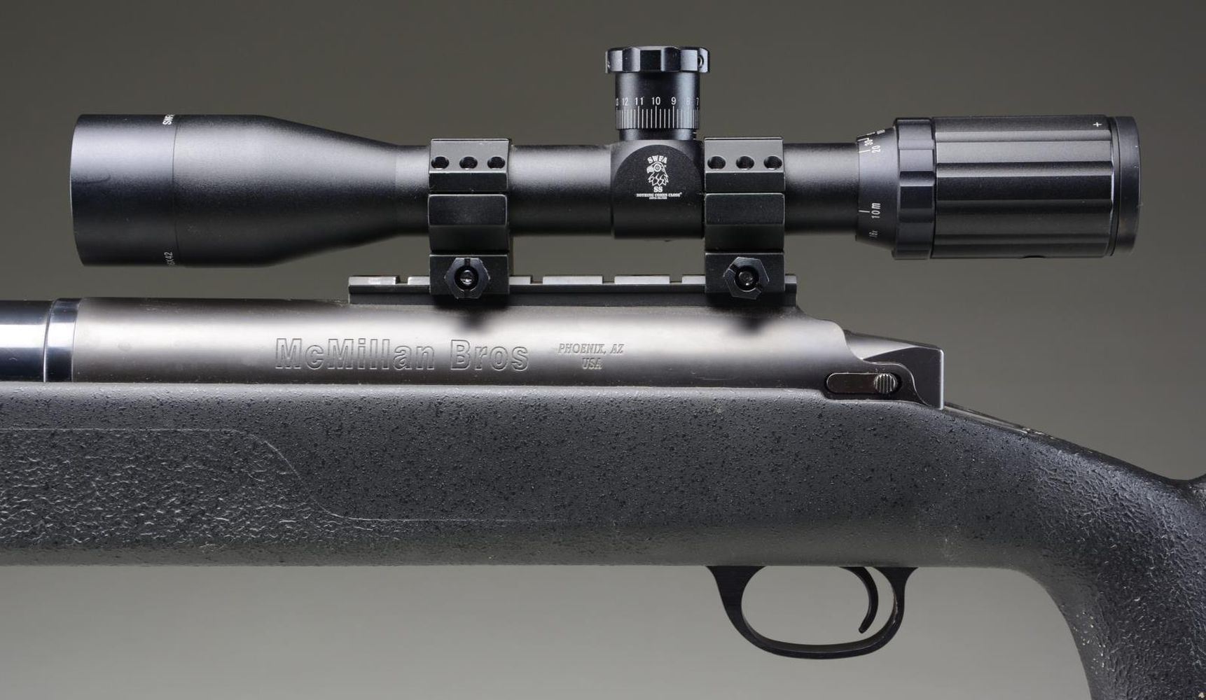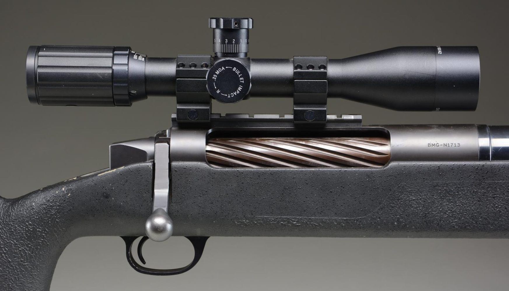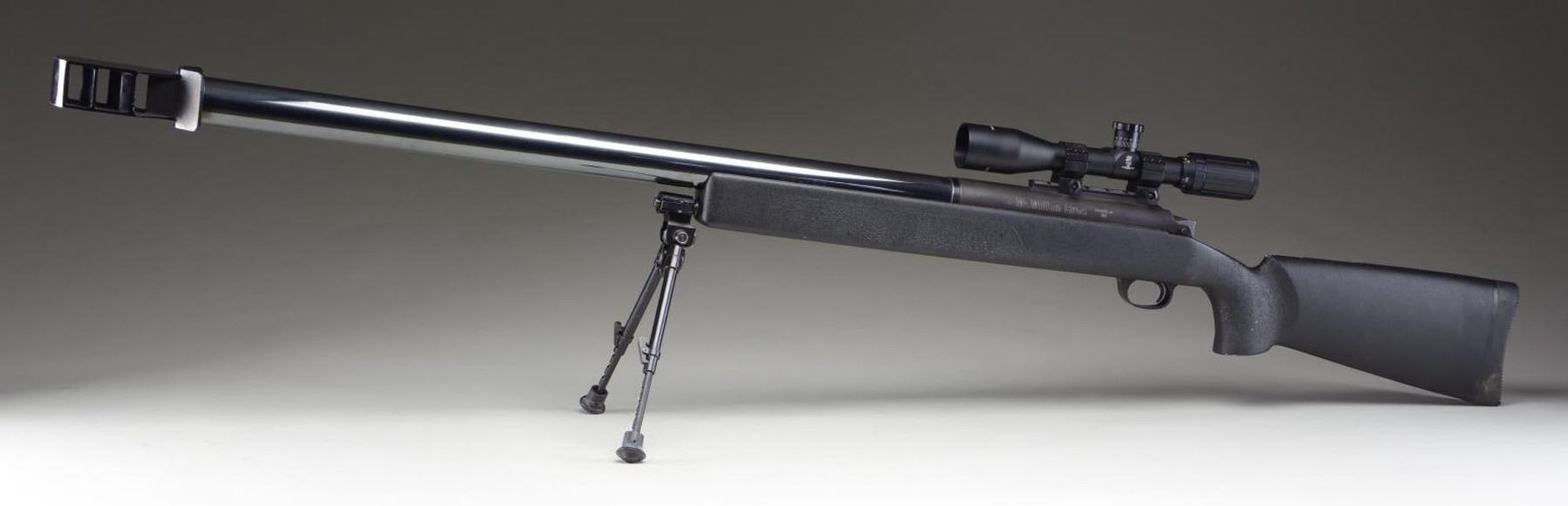 RIFLE. Cal. 14.5 JDJ. S# BMGN1713. Bbl. 38" Over brake. A rare rifle, as impressive in performance as it is to look at. The McMillan Brothers SSK Single Shot rifle was built by J.D. Jones, the well known wildcat cartridge designer, & chambered in his own 14.5 JDJ load. It launches a 1173 grain solid brass projectile upwards of 2700 feet per second, creating a whopping 19 Thousand foot pounds of energy. Deep bright blued finish on barrel, w/ matte finish black receiver. Barrel terminated w/ 5" long artillery style, 3 chambered muzzle brake. Heavy composite stock w/ thick rubber Decelerator butt pad. Integral bipod mounting point for included quick detach VersaPod. Massive, spiral fluted 2-lug bolt. 6" Weaver base above action currently sporting matte black SWFA SS 16x42 scope w/ Mil-Dot duplex reticle. No provision for open sights. Rifle weight unloaded, 42#. UNATTACHED ACCESSORIES: Spare barrel chambered in 50 BMG, 1 set 14.5 JDJ reloading dies, 1000+ bronze bullets made by Fricke at Lehigh Defense, 65"x14" Nielsen Sessions lockable transport case, cleaning solvent & paperwork. CONDITION: Original finish complete & consistent w/ full coverage. Barrel retains a beautiful deep blue finish. Receiver is matte finish w/ no visible signs of use. Finish on bolt has some thinning in areas of mechanical intervention which happens almost immediately. Stock has some small dings & scratches, primarily on top in the cheek area, probably from unintended contact w/ the massive bolt on occasion. Bipod moves fluidly and locks on correctly. Scope glass is clear w/ sharp reticle. Bore is bright w/ strong rifling. Transfers as any Title I firearm. According to manufacturer is/was never considered a Destructive Device as it was built for sporting applications only. (23-4967/JZ). MODERN. $12,000-15,000.