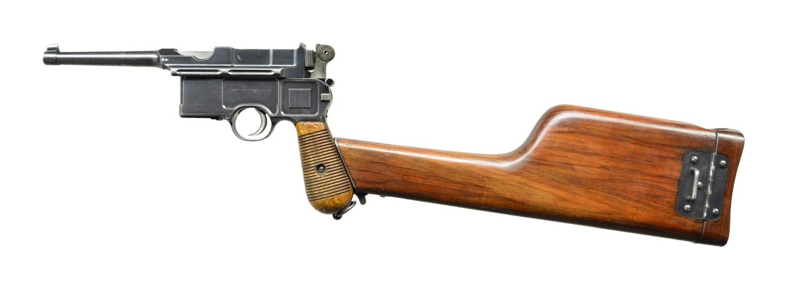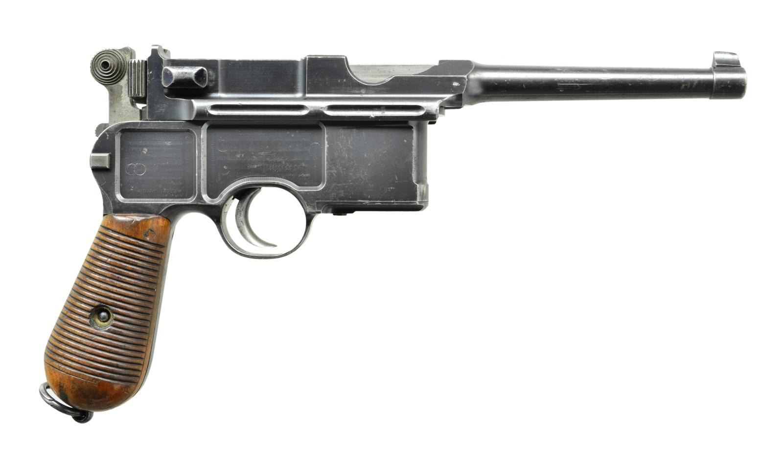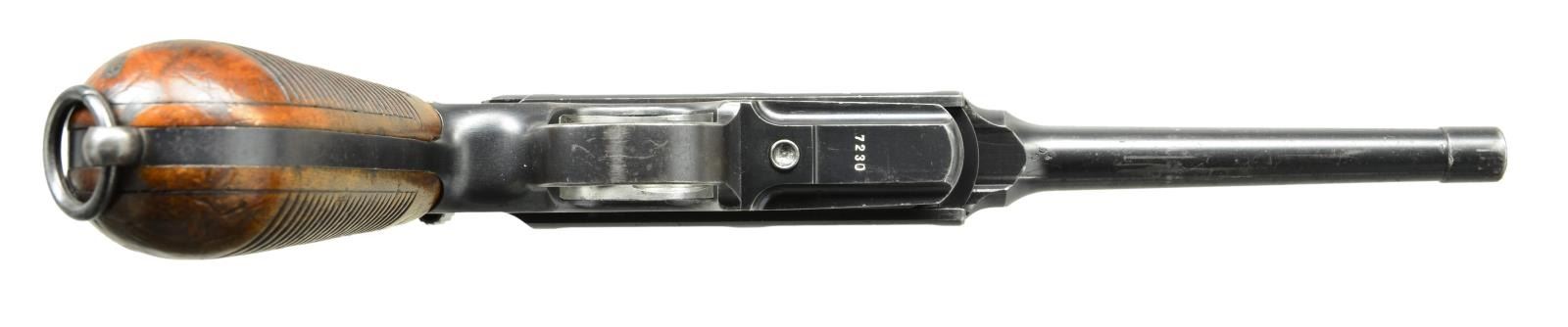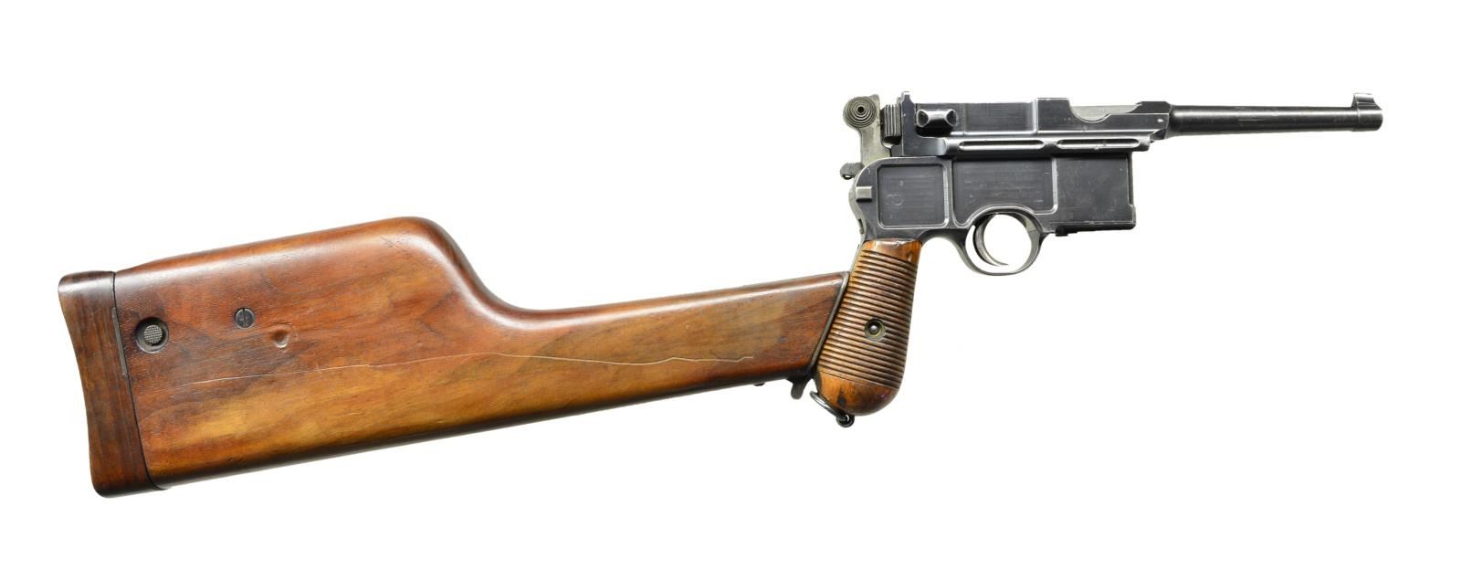 SIGHTS & STOCK. Cal. 7.63mm. S# 7230. Mauser made very few 6 shot Conehammers. This mid production example has a 4.75" bbl. w/ a fixed front & rear sight. Long extractor, independently retained firing pin & early safety. Usual Mauser address over chamber. Crown/"C"/"U" on left side of bbl. extension; antler proof on right. The full S# is on back of frame, hammer, floorplate & all of the other usual sm. parts as confirmed on disassembly including the firing pin, locking block & each of the serrated walnut grips. Lanyard ring present. UNATTACHED ACCESSORIES: complete w/ stock S# "13173", originally fitted for an Early Transitional Lg. Ring pistol. CONDITION: approx. 90-95% bright original rust blue. Fire blue parts consistent w/ pistol but showing more fading, no suggestion of enhancement. Comparable condition grips w/ most varnish, oil staining & scattered handling marks. Near mirror bore. Perfect manual mechanics. Stock is excellent, retaining most of its original varnish, scattered scratches & a few dents but no cracks, faded lug & hinge. A very scarce ensemble, as 6 shot Conehammers rarely come up for sale in any condition! (01-22330/LMA). ANTIQUE. $6,500-9,500.