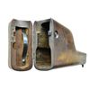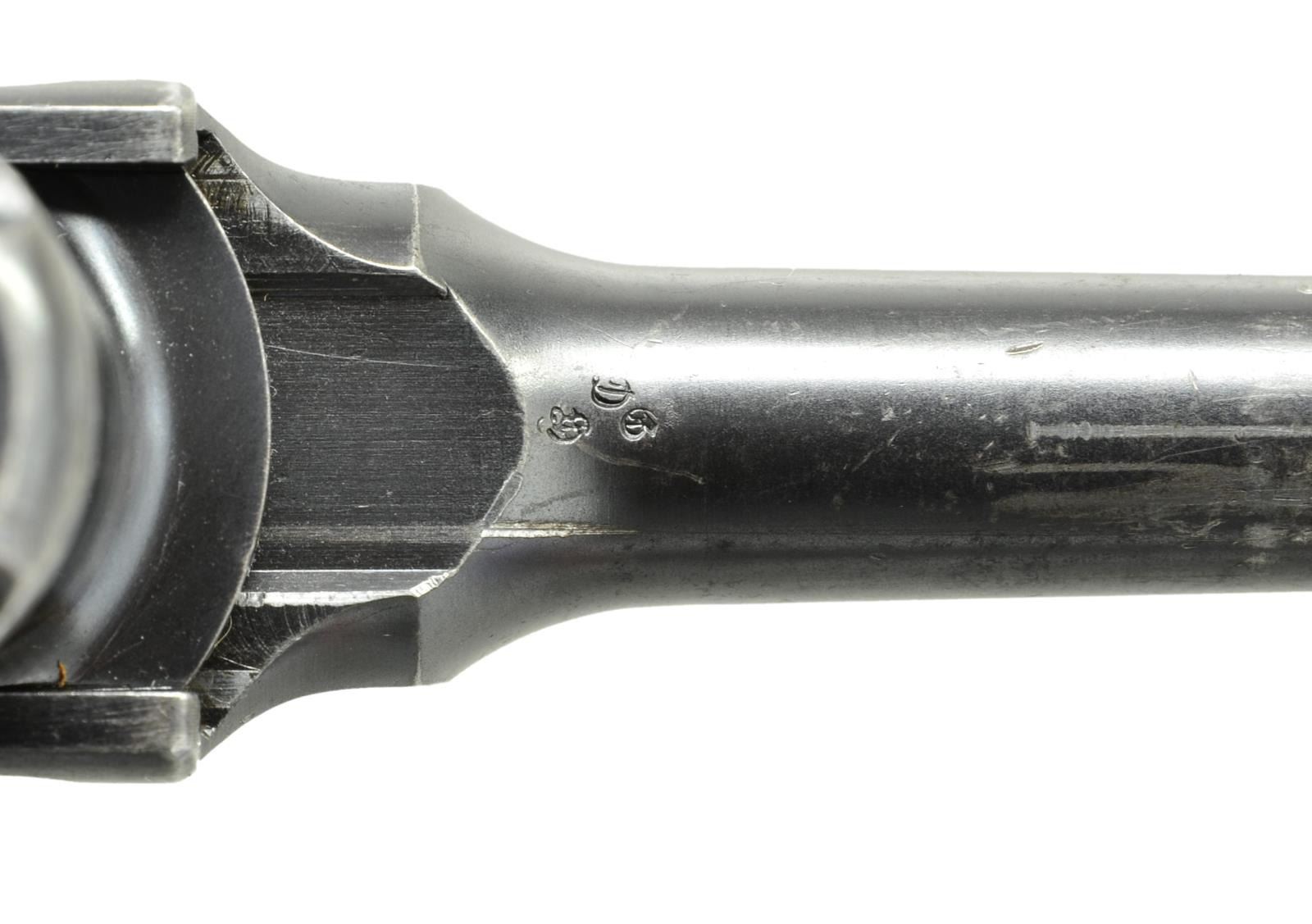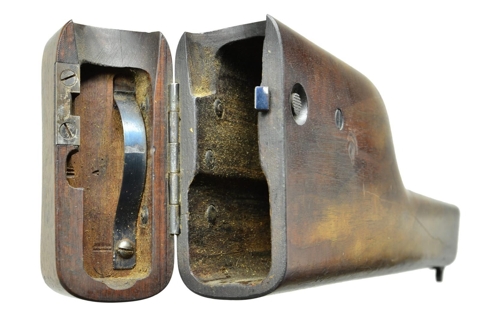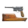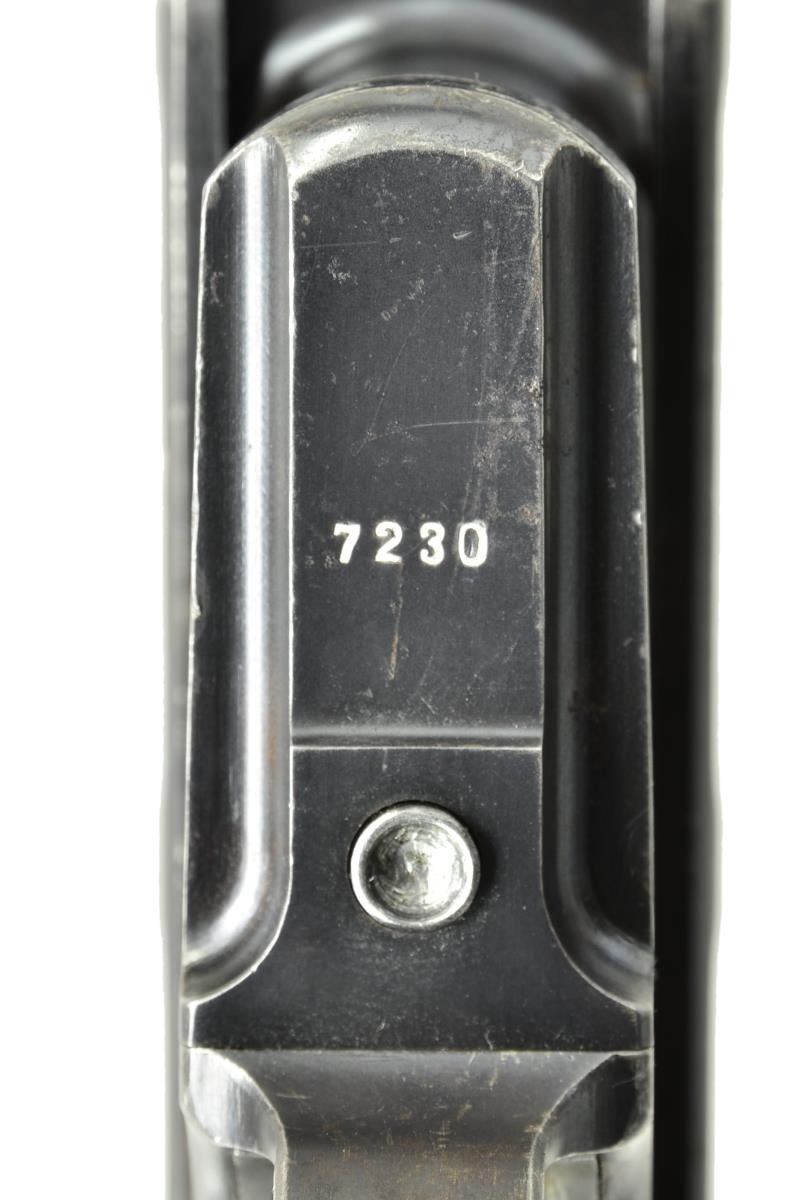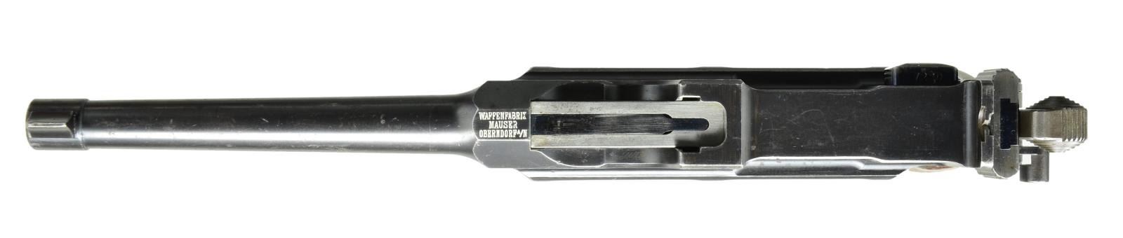SIGHTS & STOCK. Cal. 7.63mm. S# 7230. Mauser made very few 6 shot Conehammers. This mid production example has a 4.75" bbl. w/ a fixed front & rear sight. Long extractor, independently retained firing pin & early safety. Usual Mauser address over chamber. Crown/"C"/"U" on left side of bbl. extension; antler proof on right. The full S# is on back of frame, hammer, floorplate & all of the other usual sm. parts as confirmed on disassembly including the firing pin, locking block & each of the serrated walnut grips. Lanyard ring present. UNATTACHED ACCESSORIES: complete w/ stock S# "13173", originally fitted for an Early Transitional Lg. Ring pistol. CONDITION: approx. 90-95% bright original rust blue. Fire blue parts consistent w/ pistol but showing more fading, no suggestion of enhancement. Comparable condition grips w/ most varnish, oil staining & scattered handling marks. Near mirror bore. Perfect manual mechanics. Stock is excellent, retaining most of its original varnish, scattered scratches & a few dents but no cracks, faded lug & hinge. A very scarce ensemble, as 6 shot Conehammers rarely come up for sale in any condition! (01-22330/LMA). ANTIQUE. $6,500-9,500.