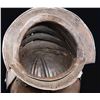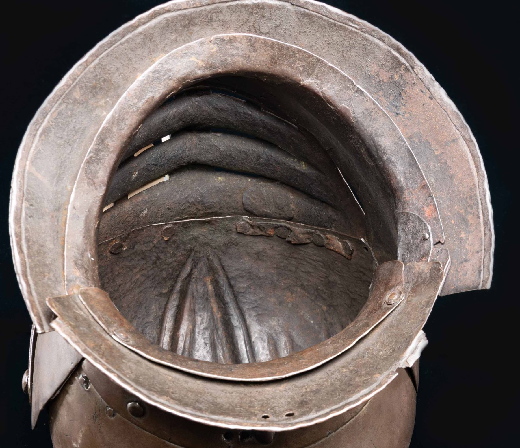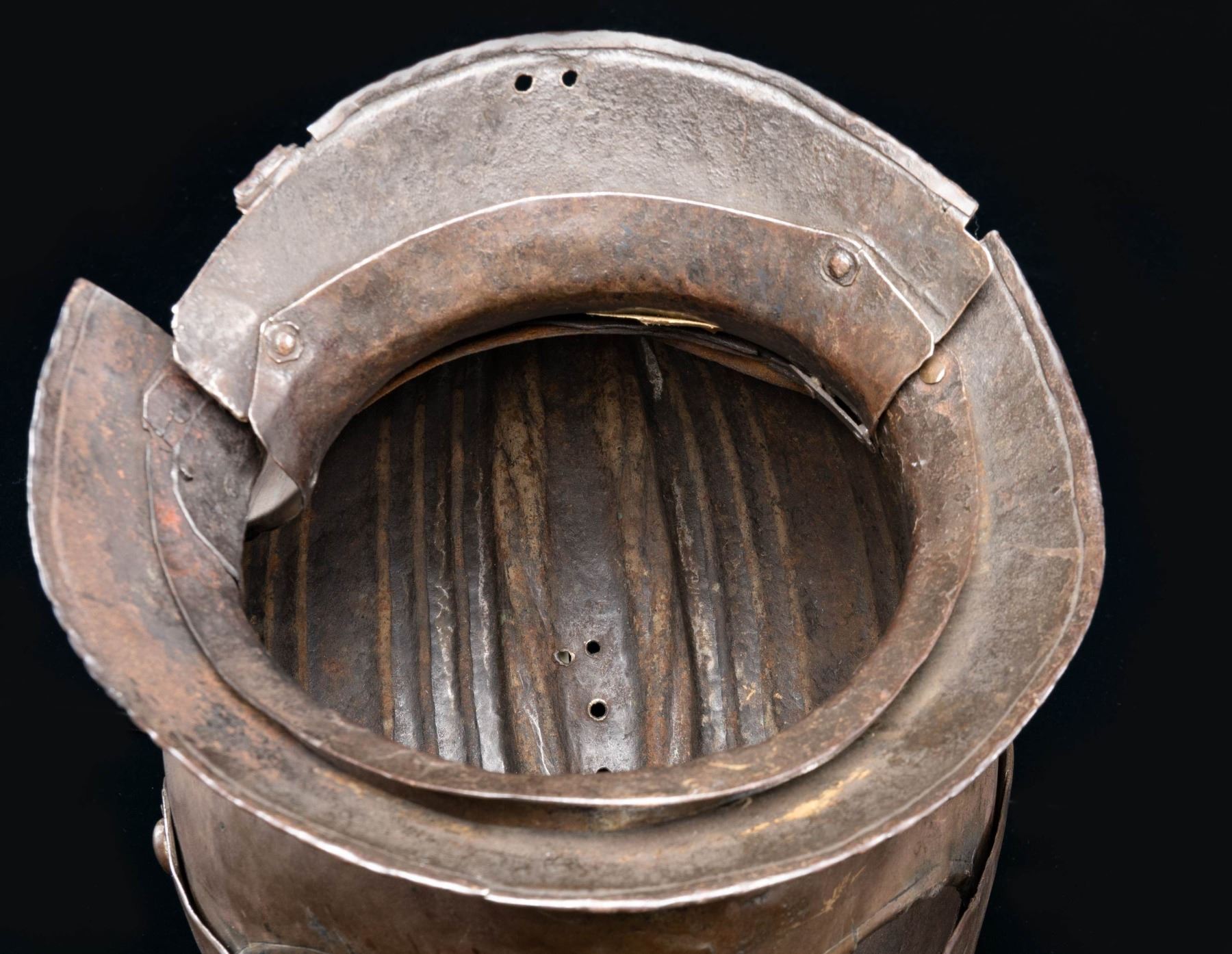 A well restored rare Maximilian style helmet popular in Germany during the early 16th Century. This example has some components that are worn and show a deep patinated finish indicating that part of the helmet is of period production. The fluted decoration was an incremental development of the plain armor popular in the 15th century. The flutes were thought to deflect points and blades of the enemy better than plain armor and added to its structural strength. The style was possibly first made for Emperor Maximilian I, also known as the "Last Knight", of Germany. The flutes in the helmet, as well as the armor, imitated the pleated clothing that was the height of European fashion at the time. The helmet has a full 8 slot visor, moderate fluting, a single neck flap, and holes for a missing plume holder in the rear. CONDITION: the helmet is reasonably solid and shows a rich patina on both the interior and exterior surfaces. There are a few extra holes in the top and rear of the body. The right visor rivet is loose but present. There is a small separation at the rear bottom left of the helmet body with a rivet repair. (02-25207/BF). $3000-5000.