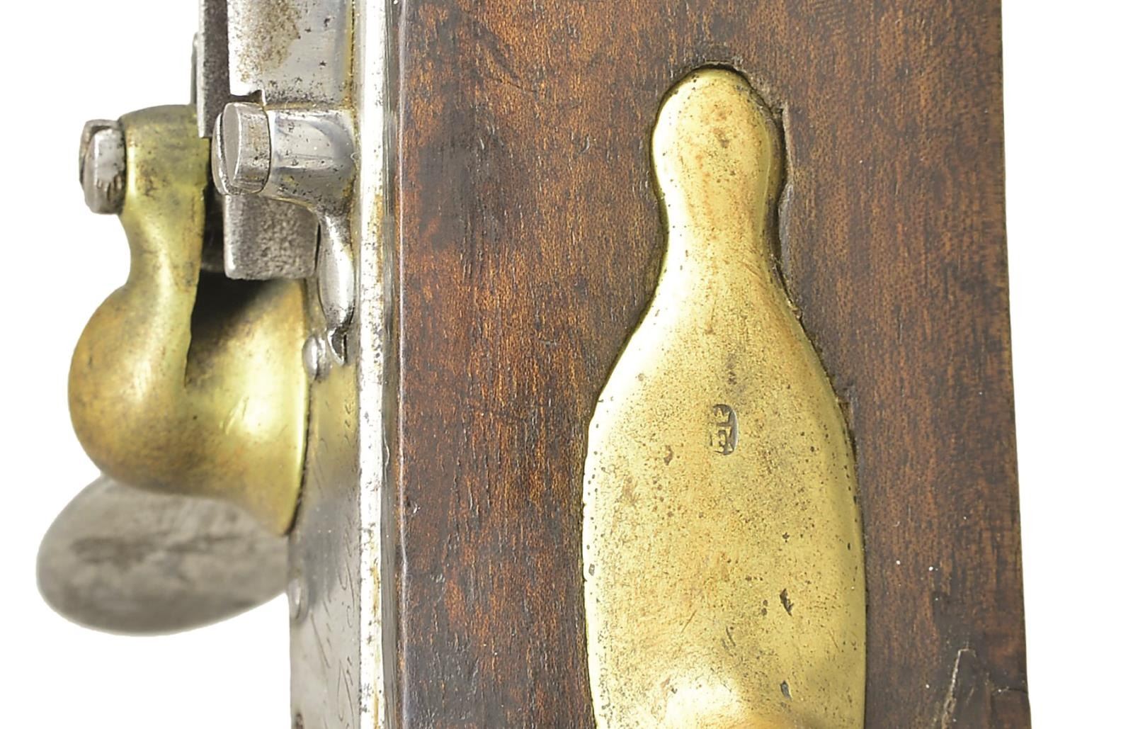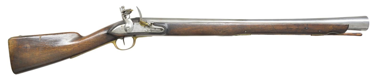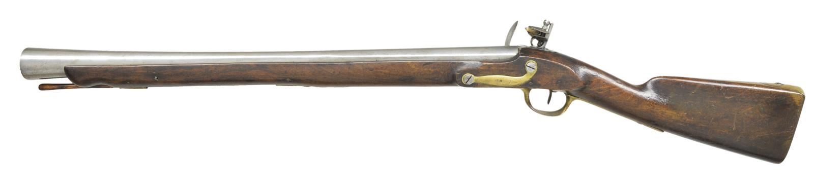 BLUNDERBUSS. Cal. approx. 70. NSN. Beretta is the world oldest firearms mfg & one of the oldest industrial enterprises, tracing it's history as far back as 1526. During Napoleon Bonaparte's occupation of Italy, 1797-1815, Beretta produced as many as 40,000 muskets a year for his Grande Armee. For this, Beretta was awarded a "Good Service Certificate" by Napoleon. This very scarce blunderbuss is one of the few surviving Beretta made military arms from the Napoleonic era. Lockplate is marked "Antonio Beretta / In Gardone". 25 7/8" Barrel with flared muzzle having a diameter of 1 3/4". Pin fastened musket style walnut stock with brass buttplate, triggerguard, sideplate, faceted thimble and pipe. Front triggerguard tang is stamped with a crown over "F" St. Etienne style proof indicating French military use. Overall, length is 41". WEIGHT: 10 lbs. CONDITION: metal surfaces have bright appearance from past cleaning. Wood has added finish over wear showing numerous scratches, dents & handling marks. Hardwood ramrod may be replacement. Sound lock w/ stiff mainspring tension. Dark, pitted bore. (01-20745/DS). ANTIQUE. $4,000-6,000.