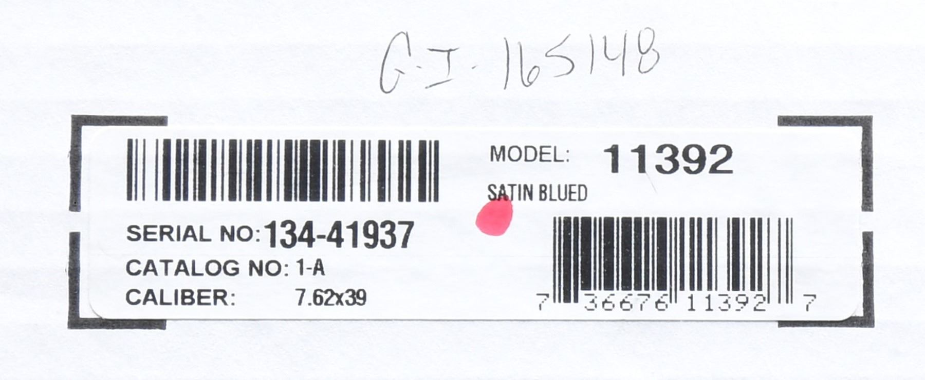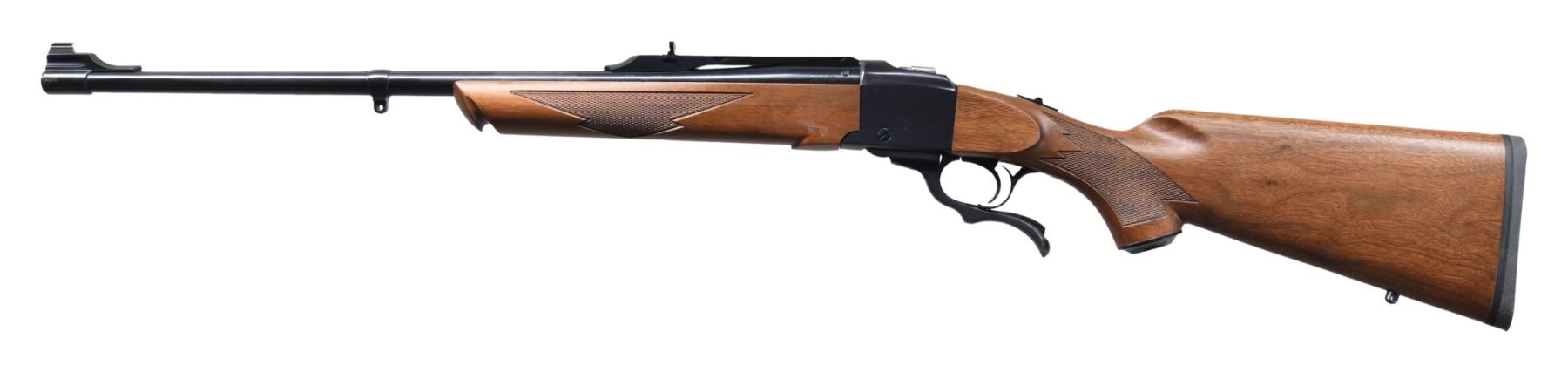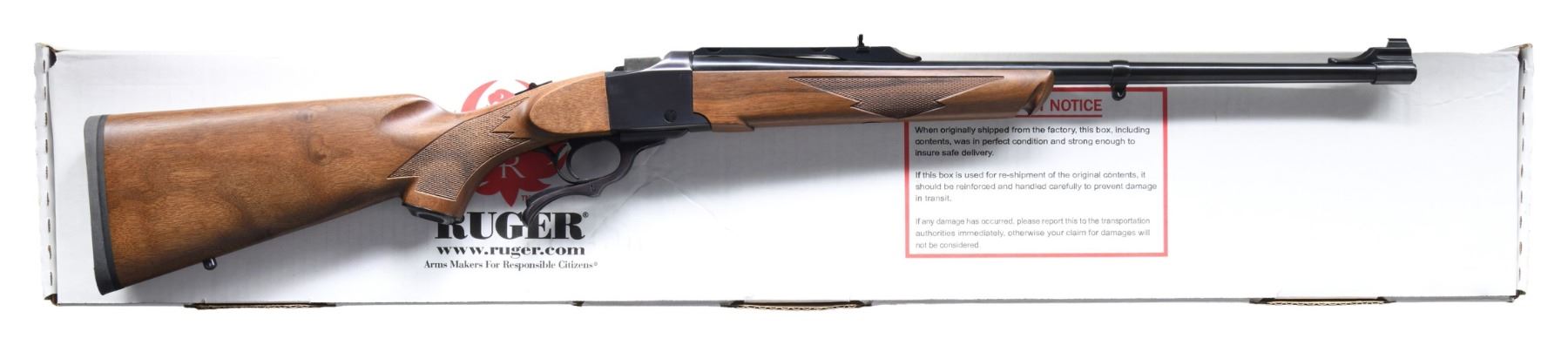 SPORTER SINGLE SHOT RIFLE WITH MATCHING FACTORY BOX. Cal. 7.62x39. S# 134-41937. Approx. 300 mfg. 2015 as Model 11392. Light weight 22" bbl. Band mounted gold bead w/ Lyman style folding adj. rear sight on quarter rib. Alex Henry checkered walnut forearm. Checkered walnut buttstock w/ Ruger steel grip cap & black pad. UNATTACHED ACCESSORIES: factory box containing Ruger paperwork, rings & lock. CONDITION: as NIB. (24-3356/MD). MODERN. $700-1,100.