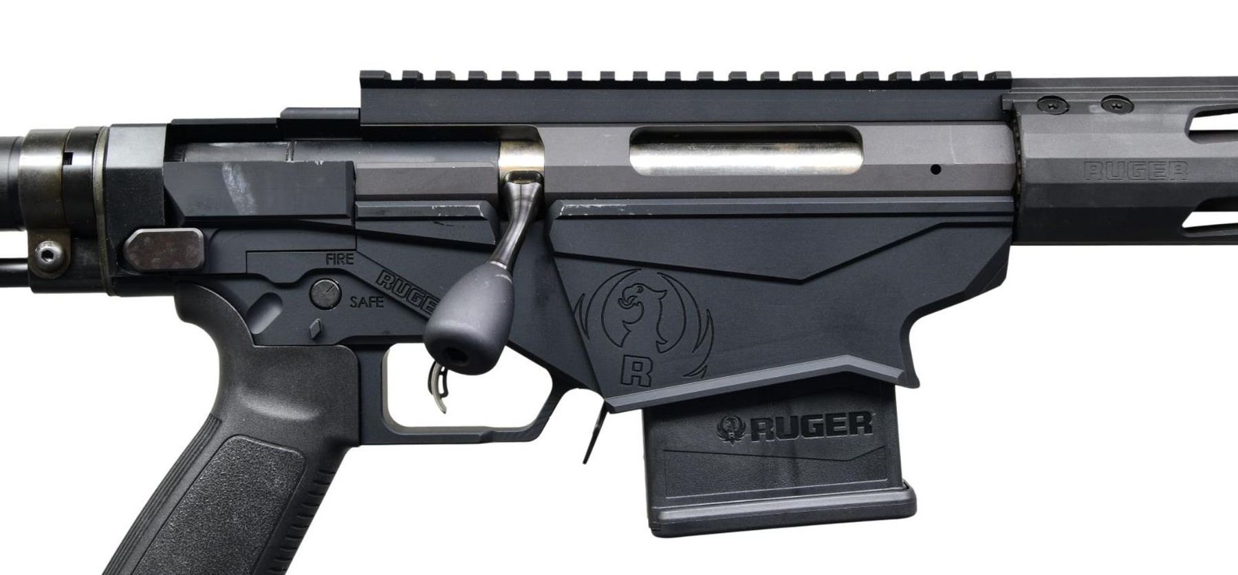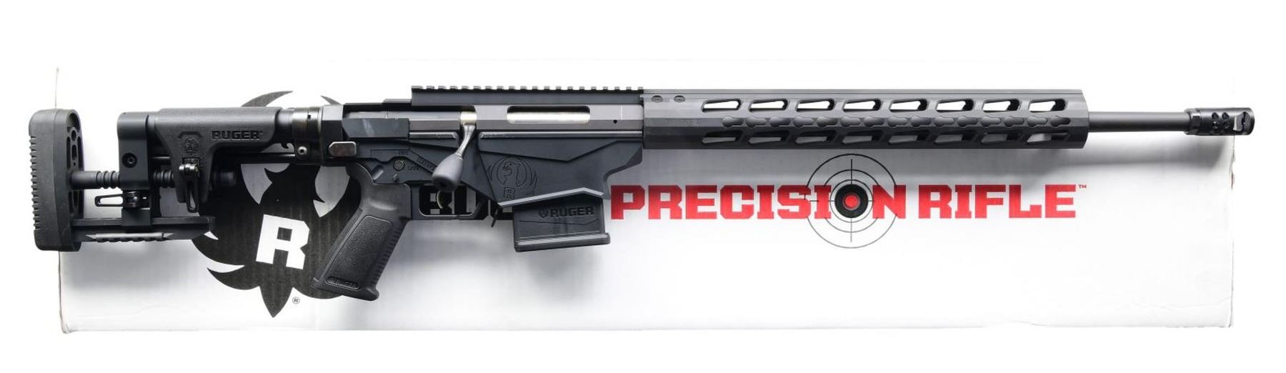 ACTION RIFLE WITH MATCHING FACTORY BOX. Cal. 5.56mm. S# 1802-00216. Bbl. 20". Precision bolt action rifle mfg. by Ruger in 2017. Standard markings are on the sides of the receiver, with the cal. designation marked on the left side of the bbl. Metal components exhibit a matte black finish overall. KeyMod handguard with factory muzzle brake and adj. side-folding MSR buttstock. MAGS: 2 10-rd. UNATTACHED ACCESSORIES: matching factory box containing factory paperwork and mags. CONDITION: near new, with metal components retaining bountiful amounts of their original factory finish overall. Mirror bore, exhibiting grease and well-defined rifling throughout. Stock and polymer pistol grip are excellent overall. Box shows mild exterior wear but otherwise remains sturdy and serviceable. A near-new example of a Ruger Precision rifle in a now-discontinued caliber. (23-6399/MLW). MODERN. $1,000-1,800.