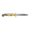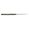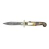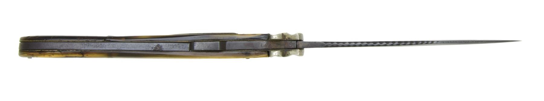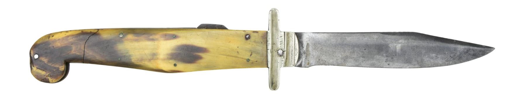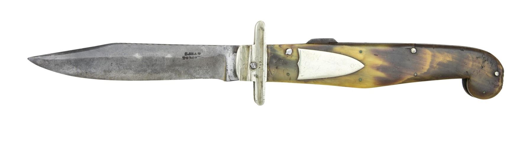 LARGE FOLDING BOWIE KNIFE, CIRCA 1845. 12.5" overall, 5.5" clip point blade stamped lengthwise: "S. SHAW / TORONTO", scalloped top edge. Pistol grip shaped handle, pinned horn slabbed panels, large German silver shield shaped escutcheon, solid sculpted top bolster & cross guard. The Ontario Ministry of Culture and Recreation shows that Shaw was listed in local trade directories from 1836 until 1850 selling axes to surgical tools. UNATTACHED ACCESSORIES: Custom protective sleeve. CONDITION: good to very good overall, uncleaned blade, sharpened over the years, smooth iron patina, handle solid with wear, crack in horn on one side. Lock is tight when blade opened. PROVENANCE: William Grimison collection; Larry W. Williams lifetime collection 1977; Featured in issue of the Antique Bowie Knife Journal. (02-23264/JS). NON-GUN. $1,500-2,500.