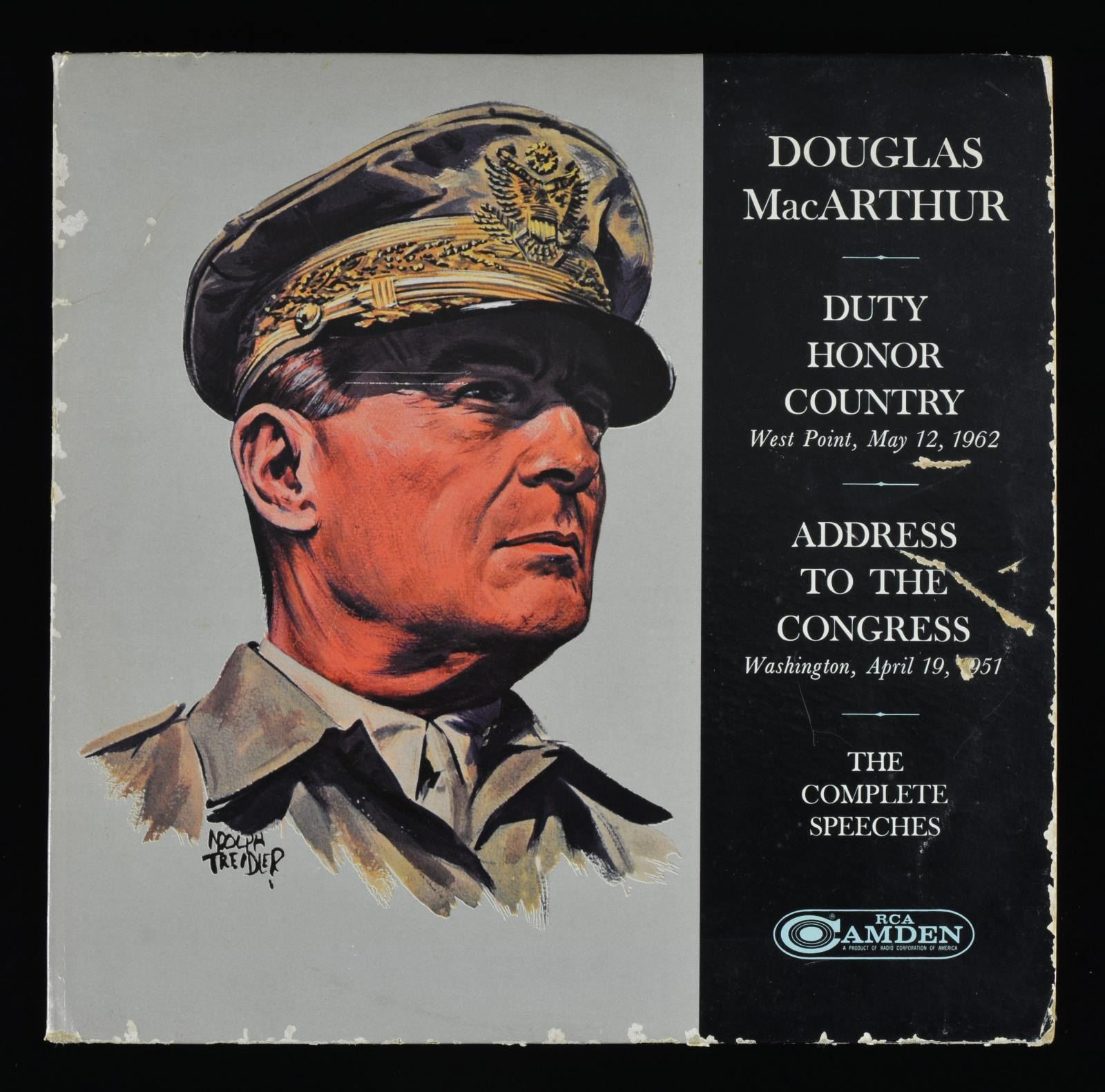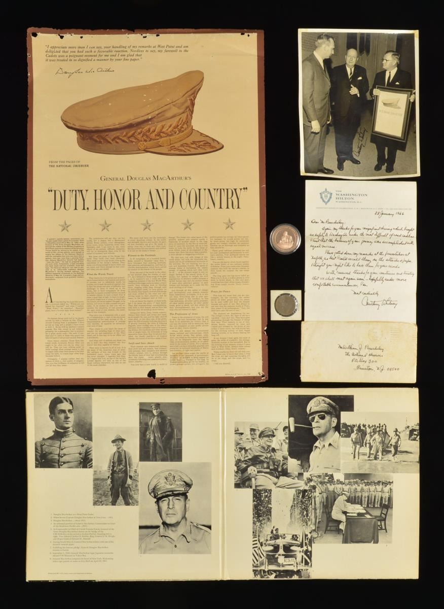 MACARTHUR’S “DUTY, HONOR AND COUNTRY” SPEECH TO WEST POINT. This group contains a very scarce poster known as the General MacArthur Duty, Honor & Country poster. This original printing has the reproduced autograph of General MacArthur under the quote from MacArthur rather than to the right side as normally seen. Poster depicts General MacArthur’s hat w/ the text of the speech below. / This lot also includes an old photograph of the presentation of a framed speech by MacArthur. / 1 Medal issued to commemorate April 19, 1951, the date of MacArthur’s farewell address. / 1 Douglas MacArthur commemorative medal. / A signed letter by General Courtney Whitney to Mr. Beardsley of the National Observer talking about the speech. / A record album w/ a recording of the West Point speech & the address to Congress. CONDITION: poster remains flat in original shipping box however it does show insect damage to the edges. Medals show light wear. Photos have glue residue on the reverse. (02-16071/BF). $600-900.
