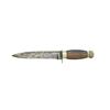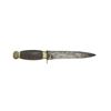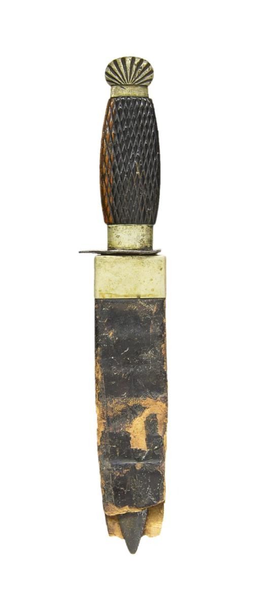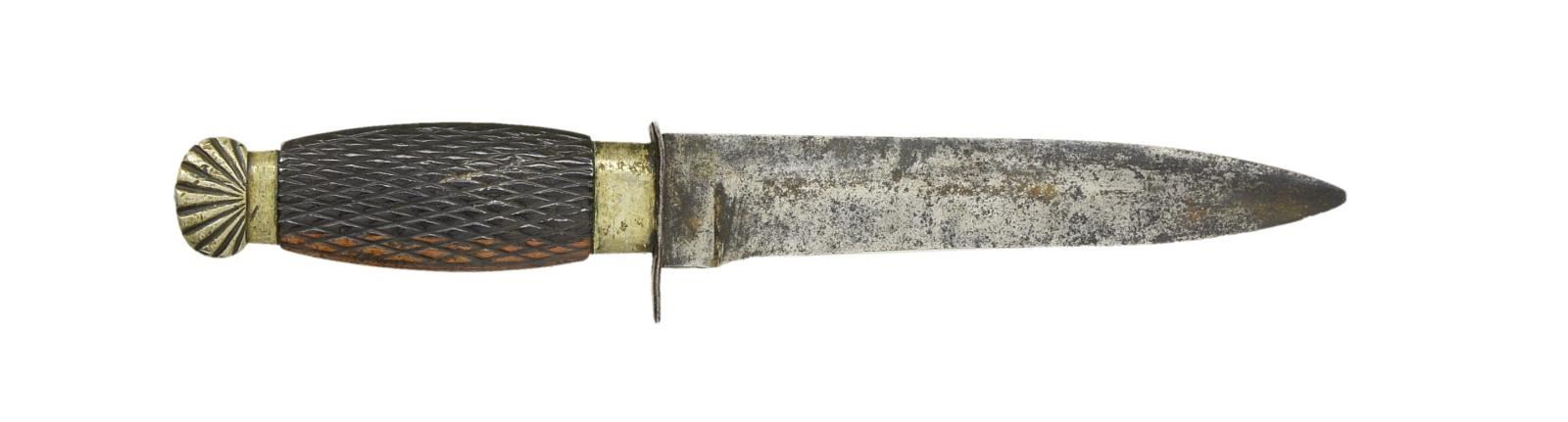 This is a very rare, but well used early American knife, deeply marked on blade “P. ROSE. NEW-YORK”. Flat, ovoid rosewood grip w/ cast German silver clamshell pommel. PROVENANCE: William Williamson collection; Butterfield Lot 3751, Jan. 28th 1997. CONDITION: fair to good. 6 1/2" blade shows extensive use & sharpening. Sm. lozenge shaped iron crossguard has top quillon broken. Hardwood grip showing two color wood, which was popular in this genre, retains an added old varnish w/ dents & dings to German silver ferrule & pommel. Knife is accompanied by German silver throated Sheffield style partial scabbard. (02-15595/JS). $800-1,200.