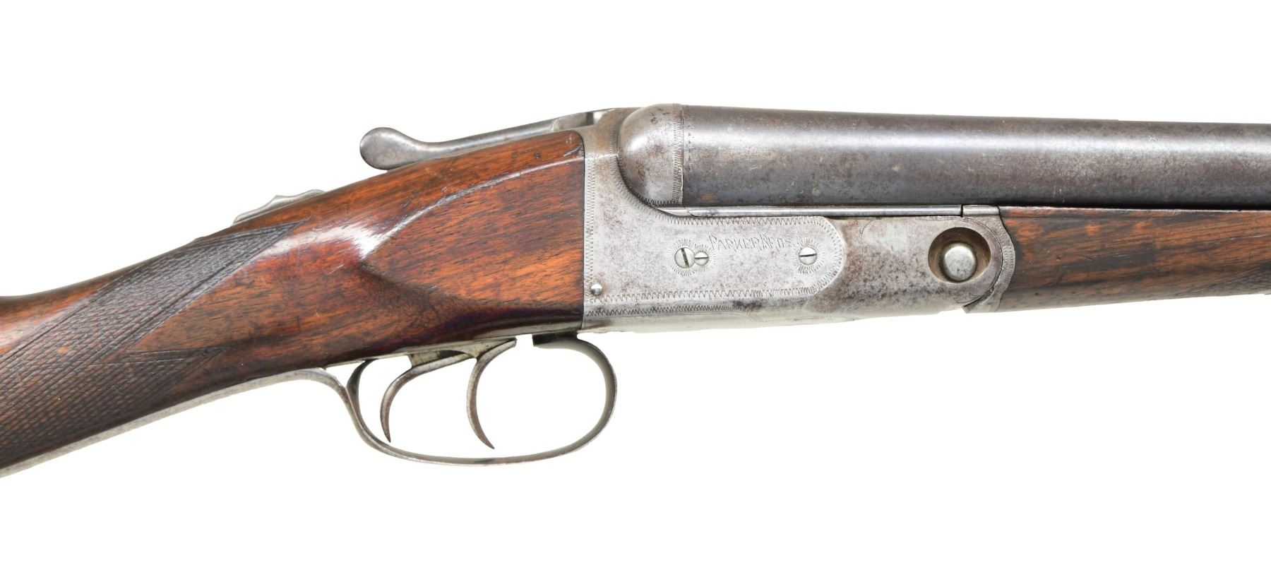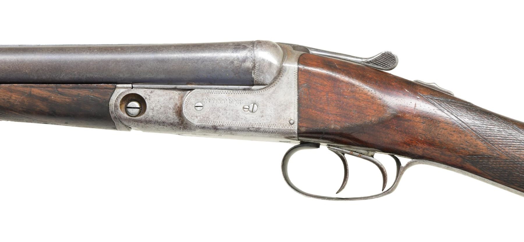 GRIP STOCK. Cal. 12Ga. 2-5/8". S# 190725. The 26" barrels are fitted with standard rib with two white beads. Parker CT. address and "VULCAN STEEL" are on rib. All correct marks are on barrel flats and rear lump is stamped "12" & "1". Usual Parker action features automatic safety and double triggers. All correct markings are on watertable and action is engraved in ususal VH style. S# is on trigger guard tang. Lightly figured Amercian walnut straight grip buttstock measures 14-1/8" over Parker dogs head buttplate with spur. Point pattern checkering is at grip and a vacant German silver shield is on toeline. Matching splinter ejector forend has usual Parker release stamped with with patent date. This S# is among the missing in identification book. MEASUREMENTS: BBLS: Bore Diameter: L .736. R .734. Restriction: L .031 (full). R .008 (IC). Wall thickness: L .029. R .040. STOCK: DAH: 2-1/4". DAC: 1-3/8". CAST: neutral. LOP: 14-1/8". WEIGHT: 6 lb. 14 oz. CONDITION: good original "as found". Barrels retaining about half their original blue with many scattered areas of rusting that has not been vigirously cleaned. Action is lightly cleaned to silver gray with scattered brown spots. Stocks show considerable wear and many marks and dings and some fairly deep scratches in their original finish. Bores are bright and shiny without noted problems. Action is tight. Right ejector does not fire. Screws are good with some evidence of turning on floorplate. (24-4583/MGM). CURIO. $1,000-2,000.