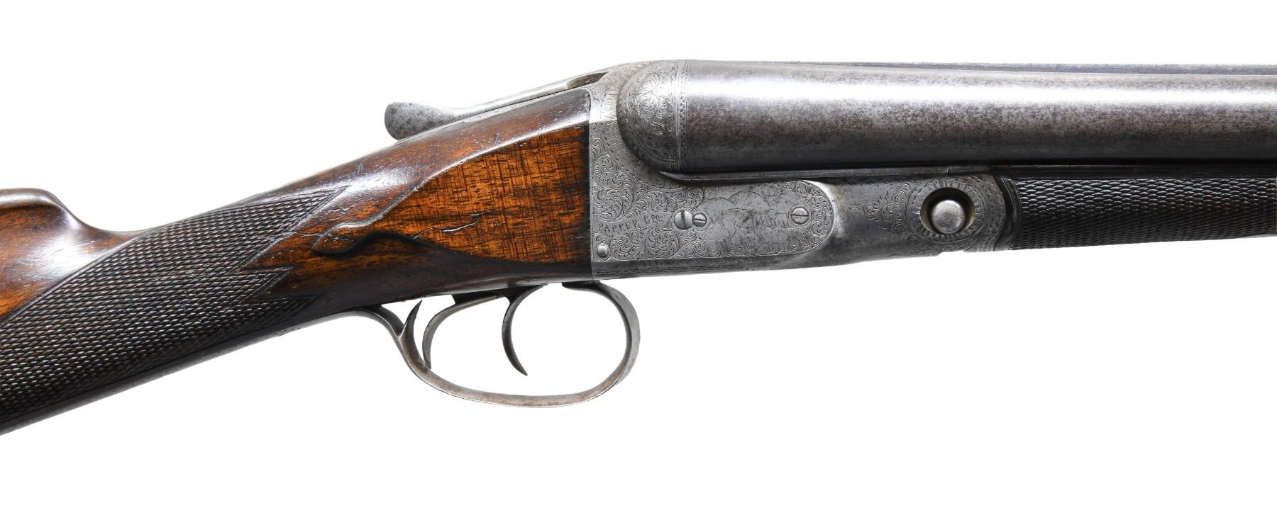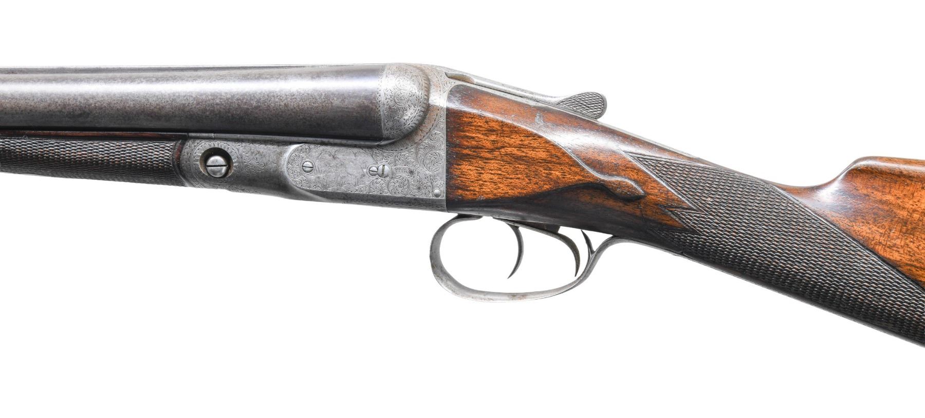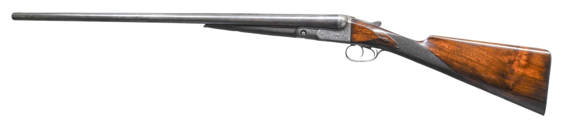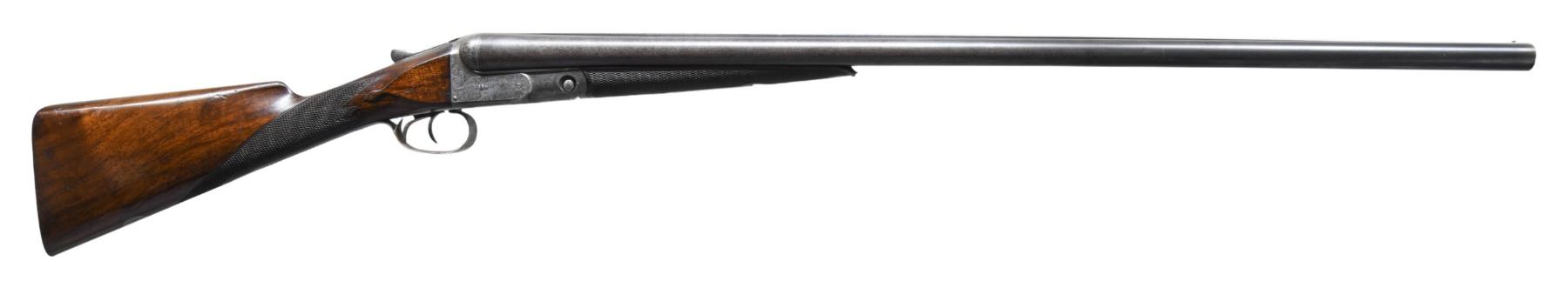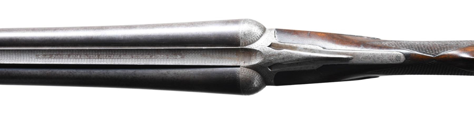 WITHOUT A SAFETY. Cal. 12 Ga. 2-5/8". S# 103565. This scarce gun is not listed in Parker Identification book but has 30" Titanic steel barrels with slightly raised matted rib. Barrel flats have all correct markings and frames size "2" is stamped on rear lump. Case hardened action without safety is fitted with double triggers. Action is engraved in usual "D" style with 70% coverage scroll surrounding dog scenes on sides with pointing pointer on left and pointing setter on right. "PARKER BROS" is on ribbon behind each scene. Trigger plate is engraved with usual four pheasant. S# is on trigger guard tang. Straight grip buttstock of somewhat figured American walnut measures 14-3/8" over skeleton steel buttplate. Stock features usual lozenge drop points, multi-point pattern checkering and vacant silver oval. Matching splinter forend is near fully checkered. Patent date is engraved on Parker release. MEASUREMENTS: BBLS: Bore Diameter: L .729. R .729. Restriction: L .038 (extra full). R .038 (extra full). Wall thickness: L .027. R .030. STOCK: DAH: 2-3/16". DAC: 1-7/16". CAST: neutral. LOP: 14-3/8". WEIGHT: 7 lb. 12 oz. CONDITION: good "as found". Barrels retaining traces of original blue and present an overall salt and pepper appearance. Action shows cleaning to peppery silver gray. Engraving remains good. Screws show some use. Stocks retain most of their original finish with a good number of marks and light scratches. Checkering is moderately worn. Bores are bright and shiny throughout without any noted problems. Action is tight. Mechanically good. (25-4456/MGM). CURIO. $2,500-3,500.