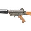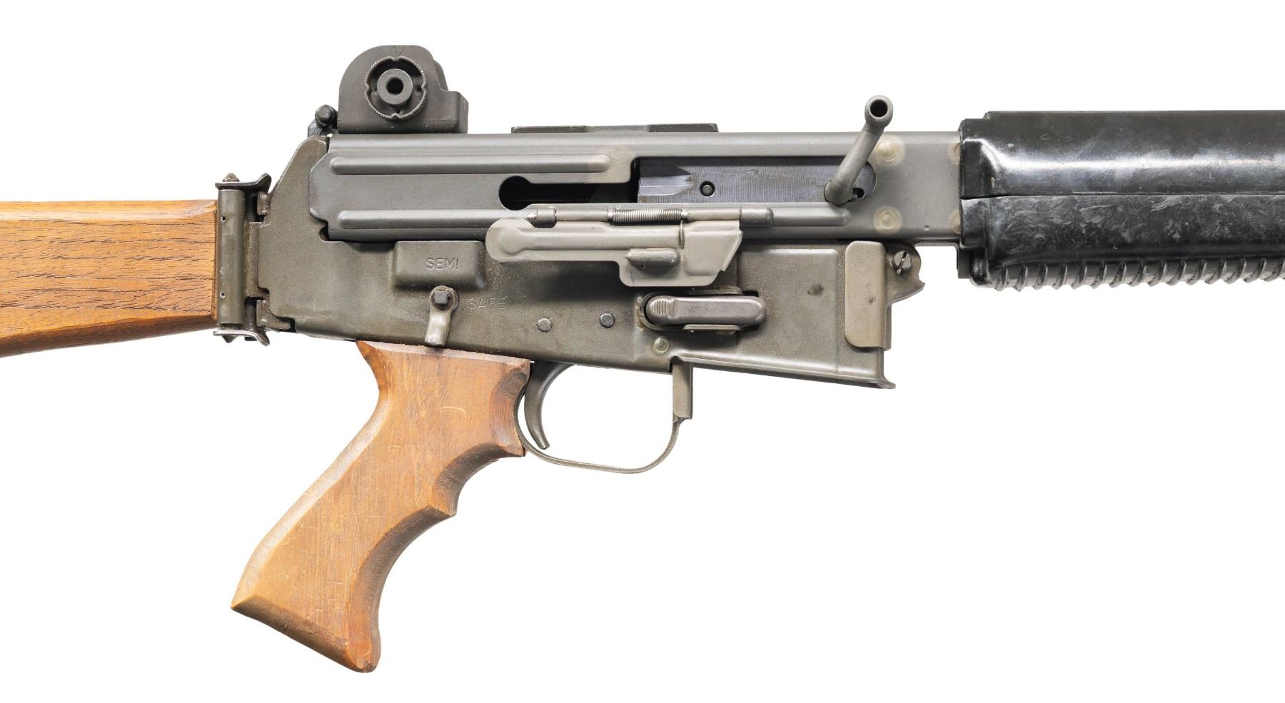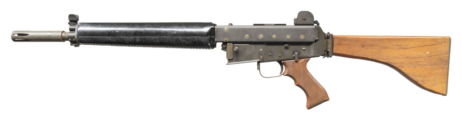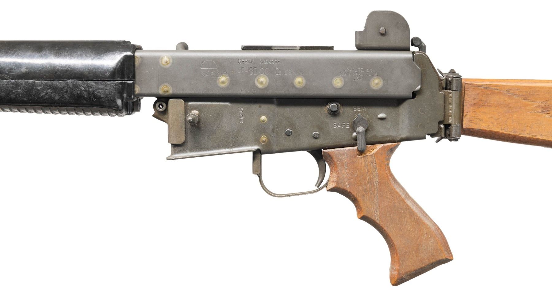Cal. 5.56mm. S# S1757. Bbl. 16 1/4". 1 of only approx. 4,000 AR-180 semi-automatic rifles mfg. in Costa Mesa, CA by Armalite. Left side of the upper is marked with the Armalite logo, followed by an unusual "SERIAL NUMBER" marking above "AR-180", followed by 4 "0"s (1 "0" partially over stamped by "180"), and other typical factory markings including the cal. designation and Armalite's mfg. information. Receiver is marked with the S# "S1757". Metal components exhibit a phosphate finish overall, save for on the bolt carrier which is blued. Bolt exhibits a chrome plated finish. Standard 2-piece ventilated black synthetic handguard, with custom wood pistol grip and side-folding buttstock. Standard AR-180 post front sight / piston assembly (with integral bayonet lug) and dual aperture rear sight graduated "200" and "400". Bbl. has been shortened, threaded, and fitted with a faux aftermarket sound moderator. Mag. is absent. CONDITION: metal components retain the vast majority of their original phosphate finish, exhibiting some light superficial handling marks overall. Sound moderator exhibits areas of wear, thinning, and discoloration. Mirror bore, retaining good rifling throughout. Proper manual mechanics. Synthetic handguard shows some scratches and superficial handling marks, but otherwise remains sound. Custom wood pistol grip and buttstock show scattered superficial handling marks, with the buttstock exhibiting a circular ding from the receiver's stock stud. Rear of buttplate exhibits consistent discoloration from cleaned oxidation. (25-4353/MLW). CURIO. $1,000-1,500.