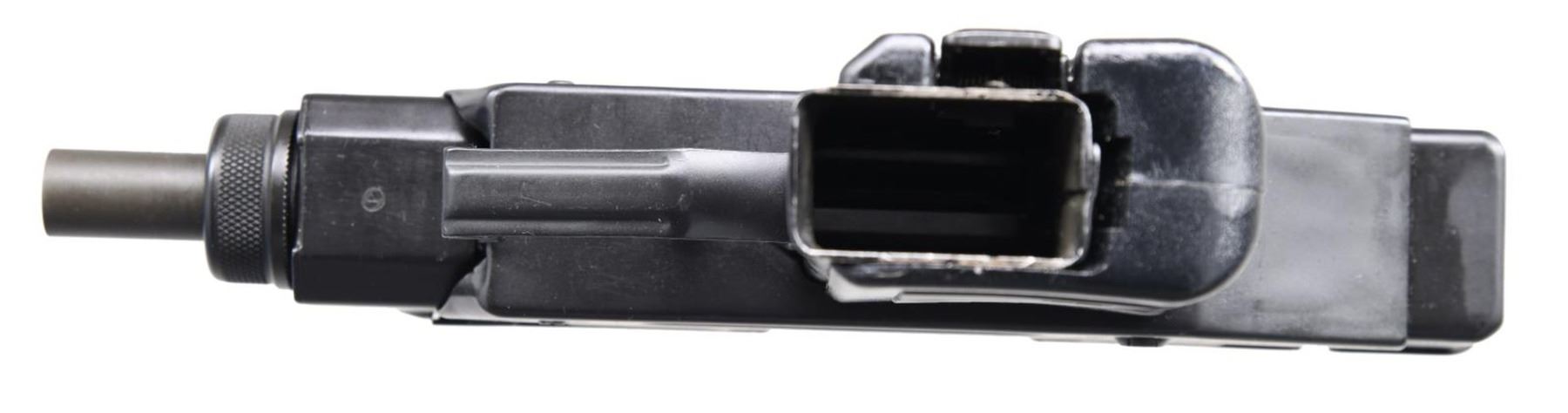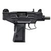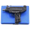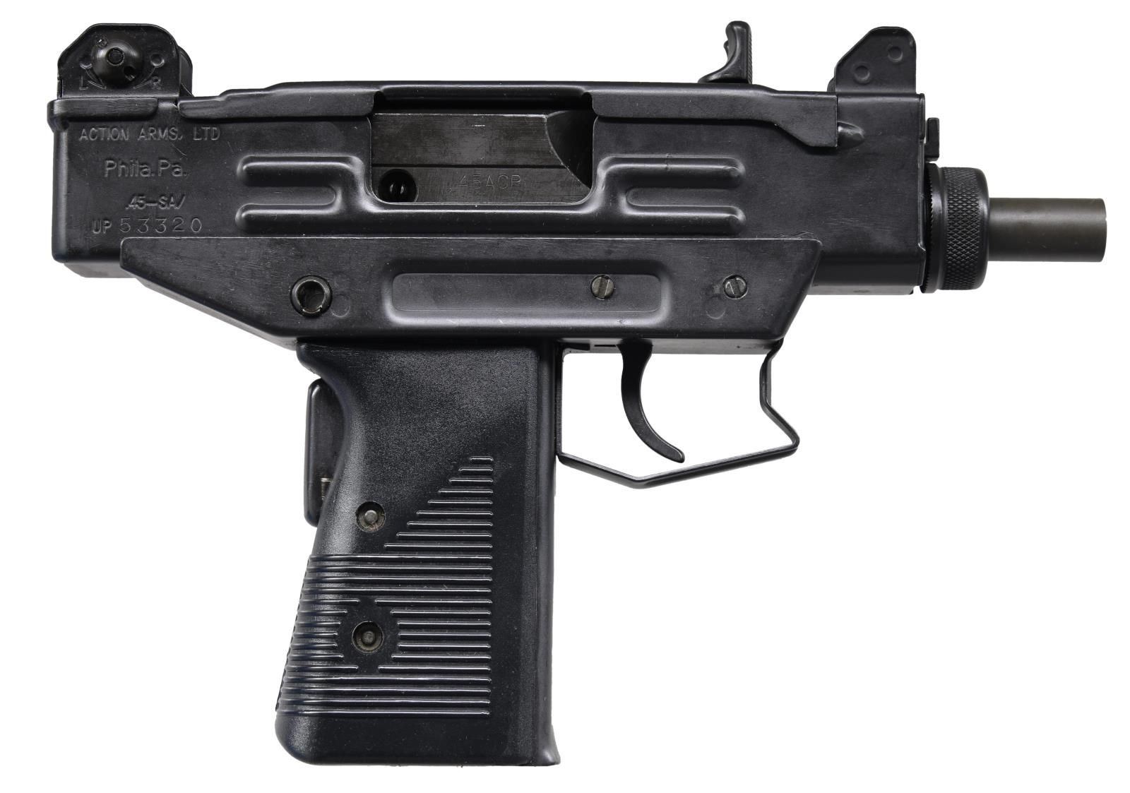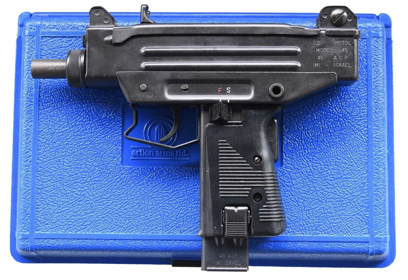 SEMI-AUTOMATIC UZI PISTOL WITH HARD CASE. Cal. 45 ACP. S# UP53320. Bbl. 4 1/2". Model 45 semi-automatic Uzi pistol mfg. in Israel by IMI and imported by Action Arms. Left side of receiver is marked "UZI PISTOL/ MODEL 45/ 45 ACP/ IMI - ISRAEL", with Action Arms' importer information marked on the right above ".45-SA/" and the S#. Left side of bbl. is marked ".45 ACP". Metal components exhibit a black enamel finish, with the bbl. exhibiting a parkerized finish. Trigger group housing is mounted with 2-piece grooved black plastic grips. Post front sight with square notch rear sight and 2-prong black polymer charging handle. MAGS: 1 10-rd. UNATTACHED ACCESSORIES: blue plastic Action Arms' hard case. CONDITION: near new, with metal components retaining virtually all of their original factory finishes overall. Mirror bore, exhibiting well defined rifling throughout. Grips are excellent overall. A fine example of a rare IMI Model 45 semi-automatic Uzi pistol. PROVENANCE: Lifelong Collection of Terrance McCarty. (24-258/MLW). MODERN. $1,200-2,000.