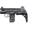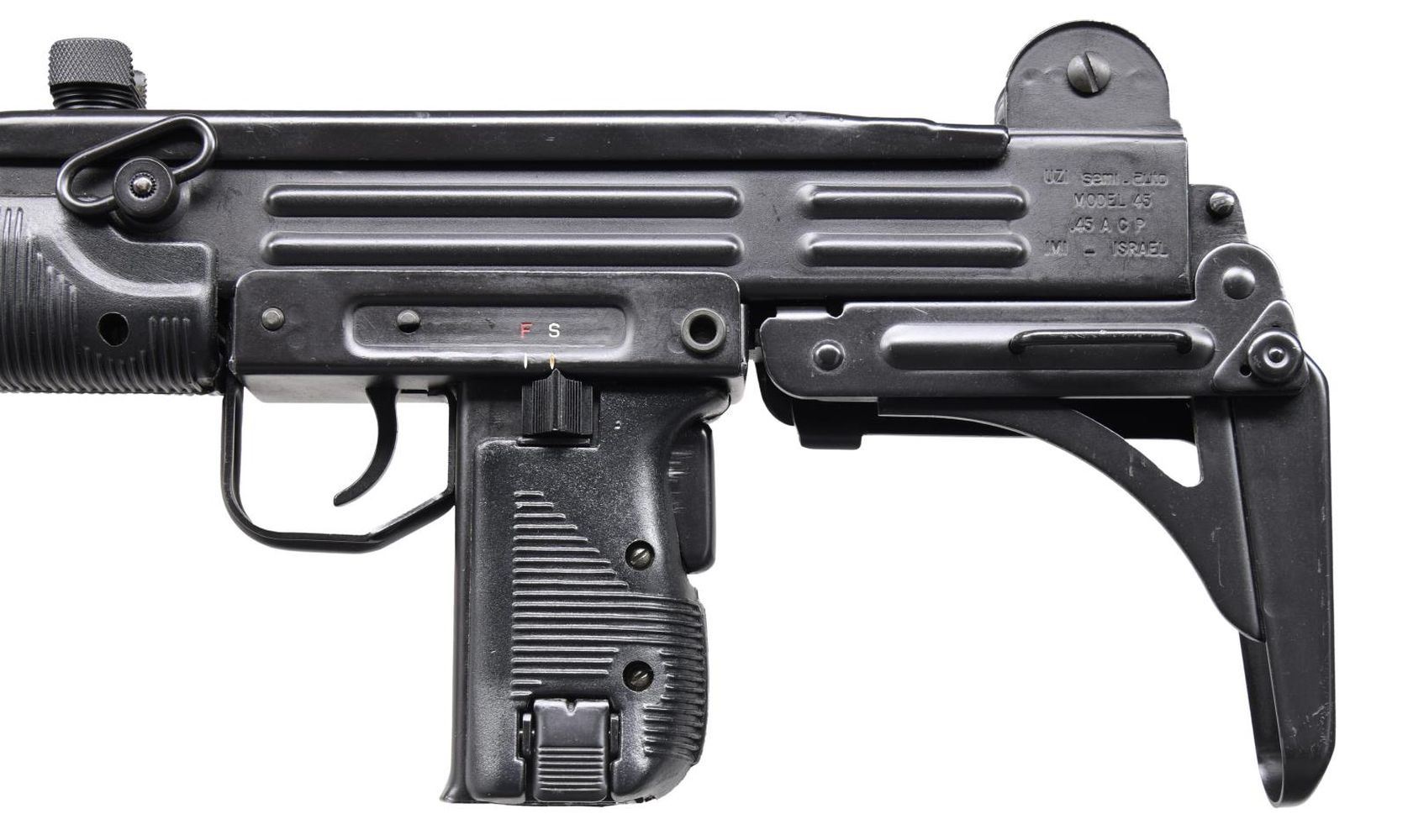 SEMI-AUTOMATIC UZI CARBINE WITH HARD CASE. Cal. 45 ACP. S# 001304. Bbl.16 1/4". Model 45 semi-automatic Uzi carbine mfg. in Israel by IMI and imported by Action Arms. Left side of receiver is marked "UZI semi-auto/ MODEL 45/ ,45 ACP/ IMI - ISRAEL", with Action Arms' importer information and the S# marked on the right. Right side of bbl. is stamped with the last 3-digits of the S#, with ".45 ACP" stamped on the left towards the bbl. collar. Metal components exhibit a black enamel finish, with the bbl. exhibiting a parkerized finish. 2-piece grooved black polymer grips and handguards. Standard Uzi pattern post front sight with Model B pattern rear sight. Rear of frame is mounted with the Uzi's distinctive collapsible buttstock. MAGS: 1 16-rd. UNATTACHED ACCESSORIES: Action Arms black plastic hard case containing a faux short display bbl. as well as a khaki canvas web sling. CONDITION: excellent, with metal components retaining bountiful amounts of their original factory finish overall, with some superficial marks from handling and storage present on the bbl. Brilliant mirror bore, exhibiting well defined rifling throughout. Polymer furniture is excellent overall. A very nice example of a rare commercial Uzi variation. PROVENANCE: Lifelong Collection of Terrance McCarty. (24-307/MLW). MODERN. $1,200-2,000.