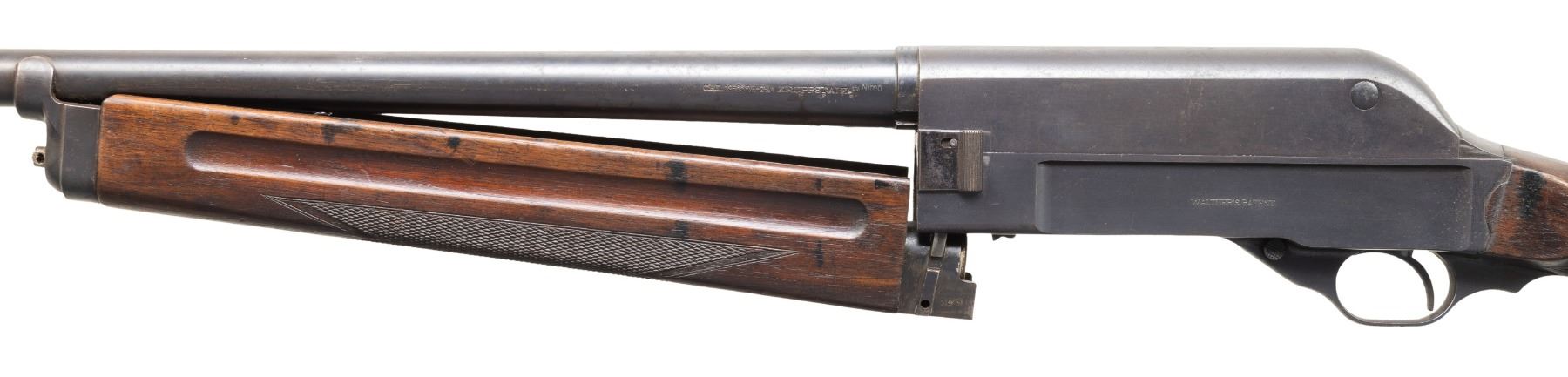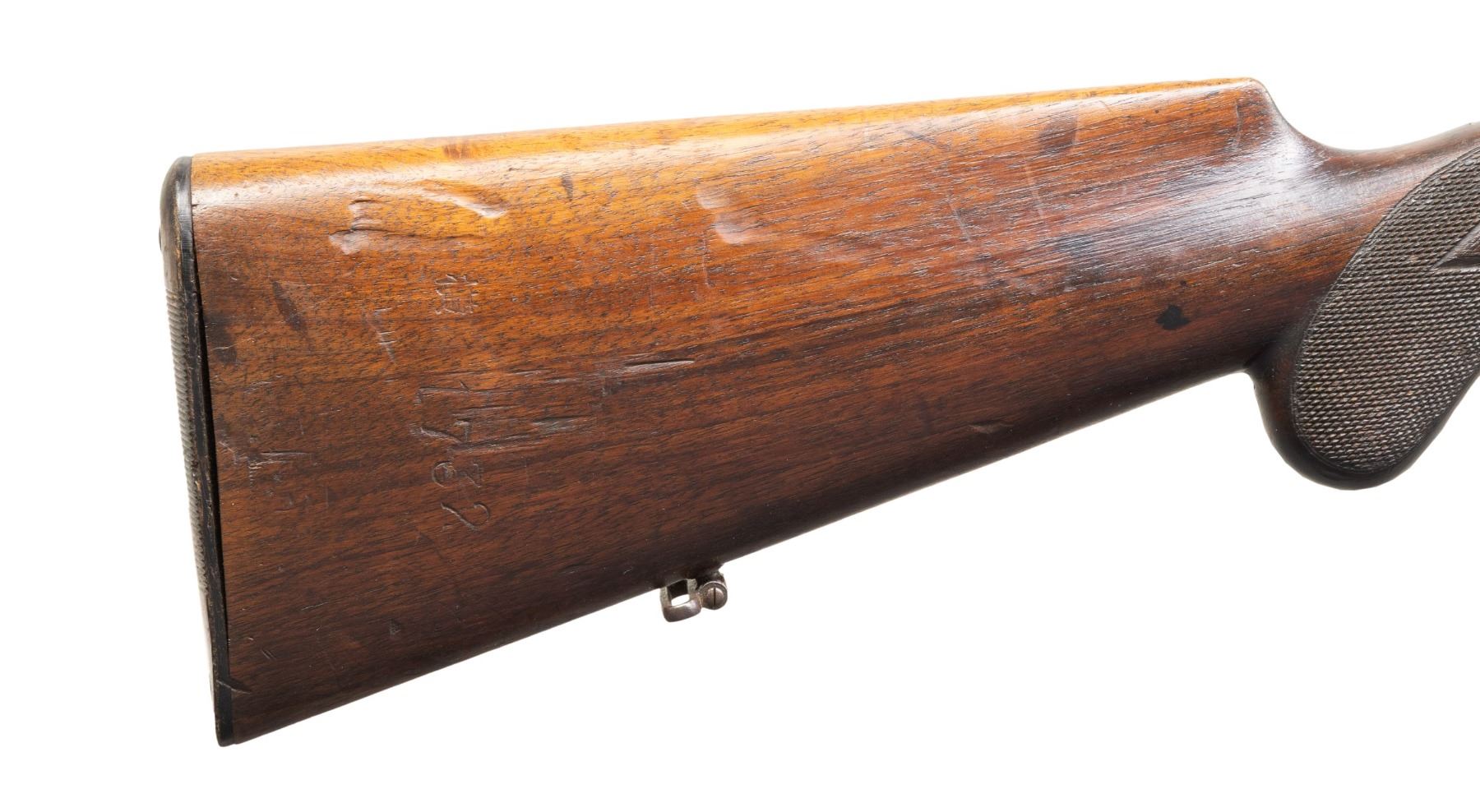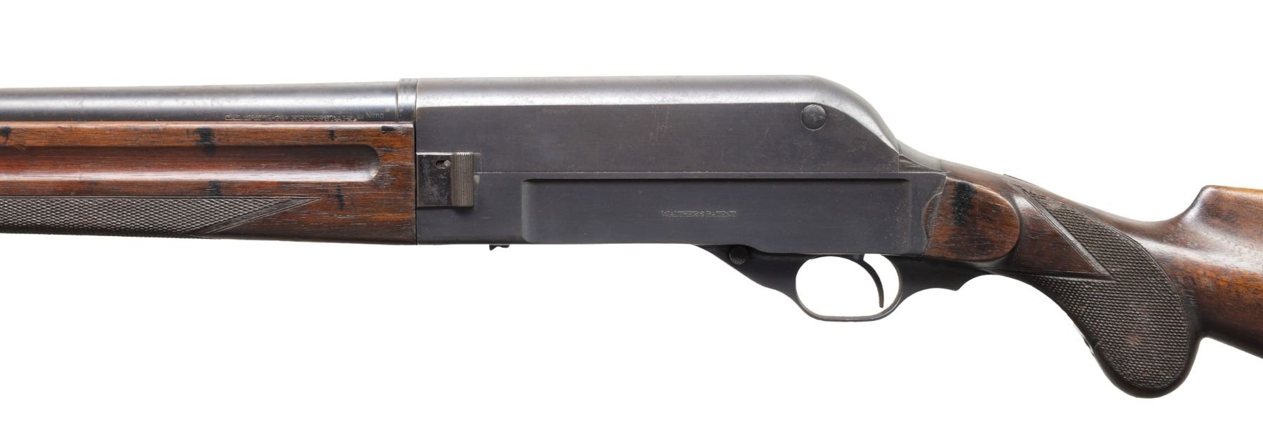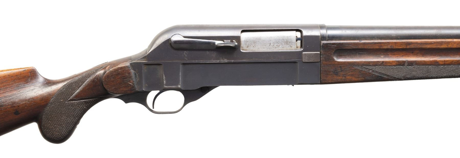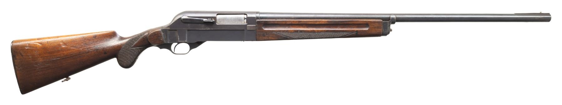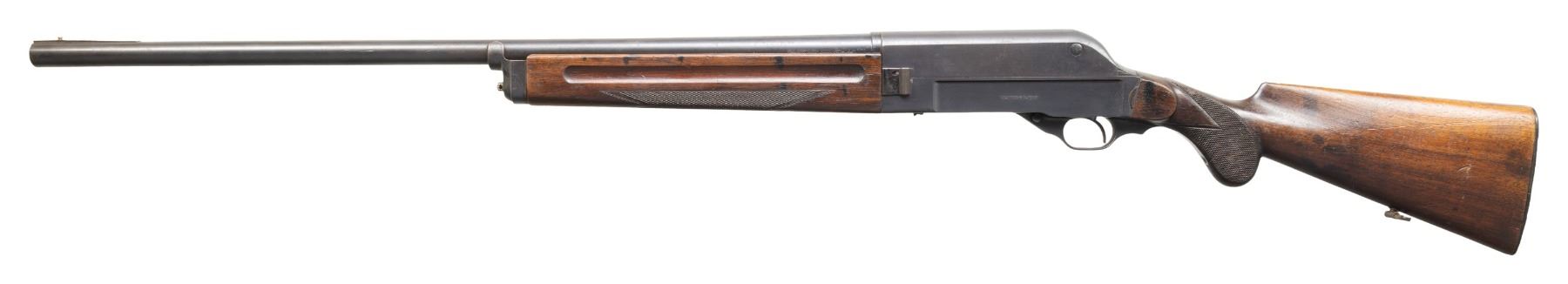 SHOTGUN. Cal. 12 Ga., 2 1/2". S# 2599. Mfg. 1921-1931. Bbl. 27.5" w/ ramp mounted front bead & Full choke. Tubular magazine in forearm; loading is done by releasing the latch on left side of action allowing mag. to pivot downward. Lever operated, toggle lock, short recoil action. Checkered walnut stock set w/ finger groove forearm & rnd. knob pistol grip buttstock. Right side of buttstock has rack number "1732" w/ partially discernable Asian character. CONDITION: fair fading blue mixed with brown patina showing peppery oxidation throughout. Fair worn wood finish with numerous dings & marks throughout along with gouges around wrist. Shiny bore. PROVENANCE: From the PMRB Collection. (25-5922/MD). CURIO. $600-800.