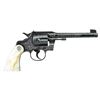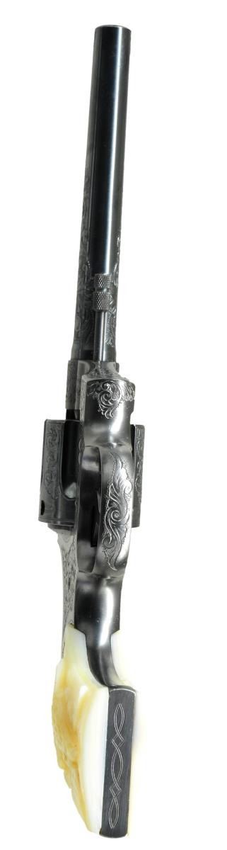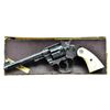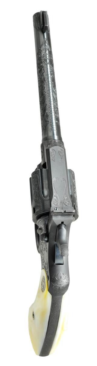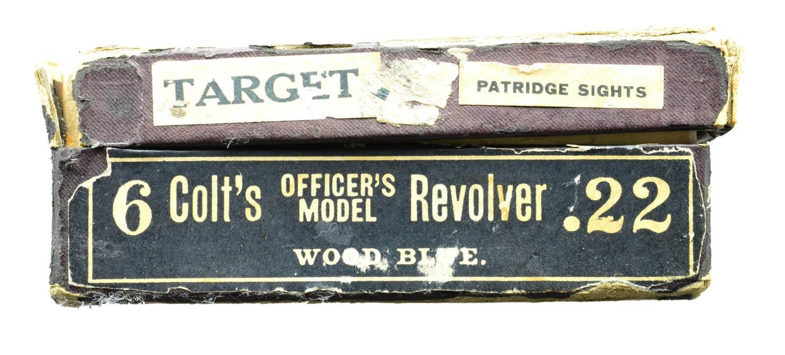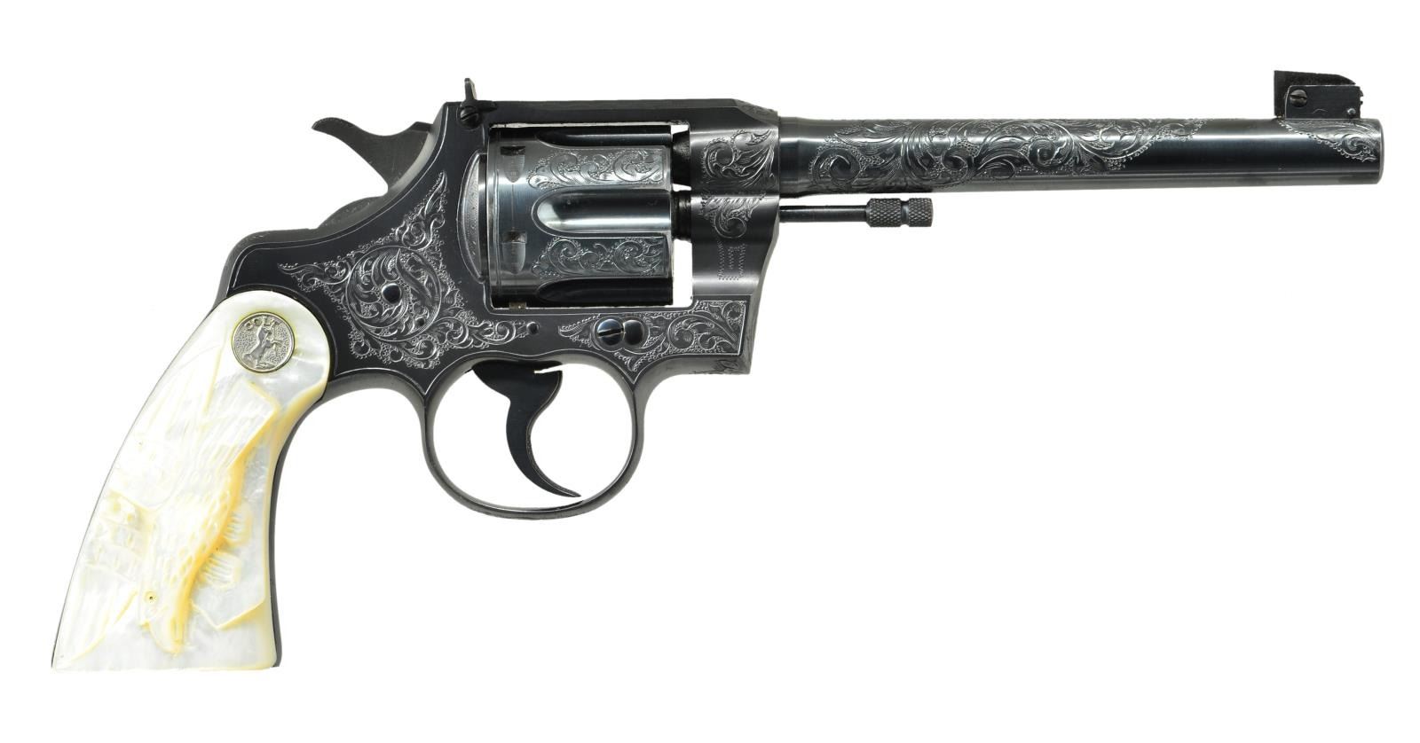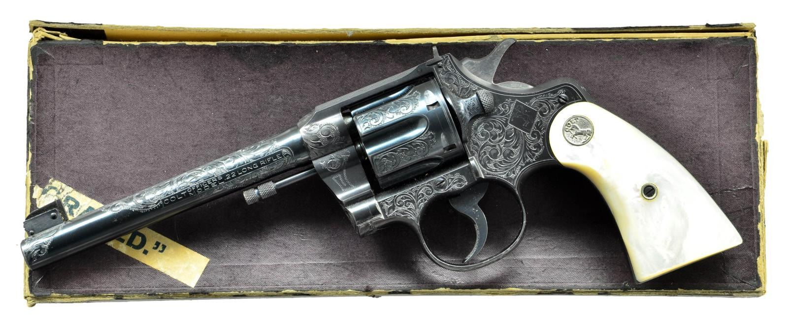 MODEL FLAT TOP TARGET REVOLVER. Cal. 22 LR. S# 20240. Target configuration with blue finish and 6" tapered barrel. Adjustable blade Patridge target front sight and windage adjustable rear sight in dovetail on frame. Barrel has period 2 line address on top surface and marked “COLT /OFFICERS MODEL/ .22 LONG RIFLE” on the left side. Left sideplate has the Colt trademark, Rampant Colt framed in a punch dot diamond. Blued trigger has checkered face, hammer is polished bright on sides with blued top & rear edges. Top flat of the frame and rear of the frame are matte finish with tasteful engraving flourishes. Backstrap is checkered. Factory engraved most likely by William Gough and ordered with class “B” coverage consisting of flowing acanthus scrolls in punch dot background on frame, barrel and appended surfaces. Revolver mounted with factory 2 piece pearl grips with Rampant Colt silver medallions and a raised carved eagle on the right panel. UNATTACHED ACCESSORIES: Colt factory letter which specifies Caliber 22 with 6" bbl, Blue Finish, Pearl Stocks, Class “B” Engraving and shipped to Loan Account; Spaulding W. Arms, Salt Lake City, Utah on May 31, 1938 in a one gun shipment. Remarks section indicates that the revolver was returned to the factory on Feb 1, 1939 and reshipped 6 additional times on loan for display to important Colt dealers around the country. The revolver's final shipment was on April 5, 1940 to the Bacharach Raisin Company in Baltimore, MD. Also accompanied by the original Colt burgundy hinged lid cardboard box with black & white end label identifying this revolver. Additionally there are 3 black & white over labels, 2 on the end of the lid “TARGET” and “PATRIDGE SIGHTS”. The 3rd label is diagonally over the top “ENGRAVED” from which “EN” is missing. This exact revolver is pictured on page 330 of The Book of Colt Engraving (Wilson) and on page 306 of Colt Pistols (Wilson & Hable) wherein it's stated that it is “one of the most traveled of sample guns”. Wilson also observes that this box was shipped 6 or 7 times and shows the travel wear but protected the gun during its travels. CONDITION: appears as new and unfired. Retains virtually all of its original factory finish with sharp engraving and crisp markings. There is only the most faint cylinder line and a small spot or two on left side of the trigger. Grips are excellent, showing great fire and color. Crisp mechanics. Bright bore. Box has rubbed edges and a couple of broken corners with the right end of the top partially detached, otherwise it is intact with mostly legible labels. Inside of box is clean with most print legible. This is the wonderful opportunity to own a pristine Factory Sales Sample exhibiting Colt's best work in the years leading up to WWII. PROVENANCE: R.E. Hable Collection; Vicente Sepulveda Collection. (22-5672/). CURIO. $17,500-27,500.