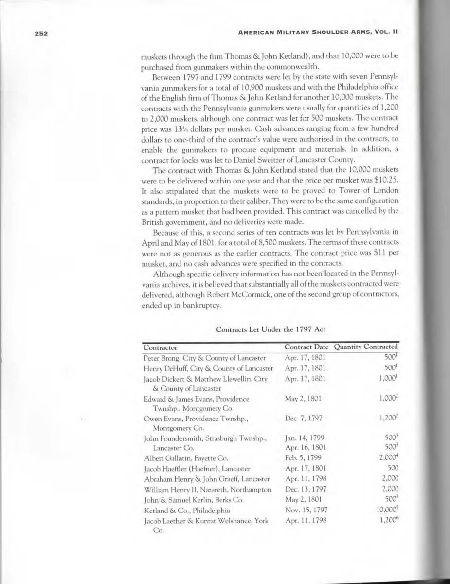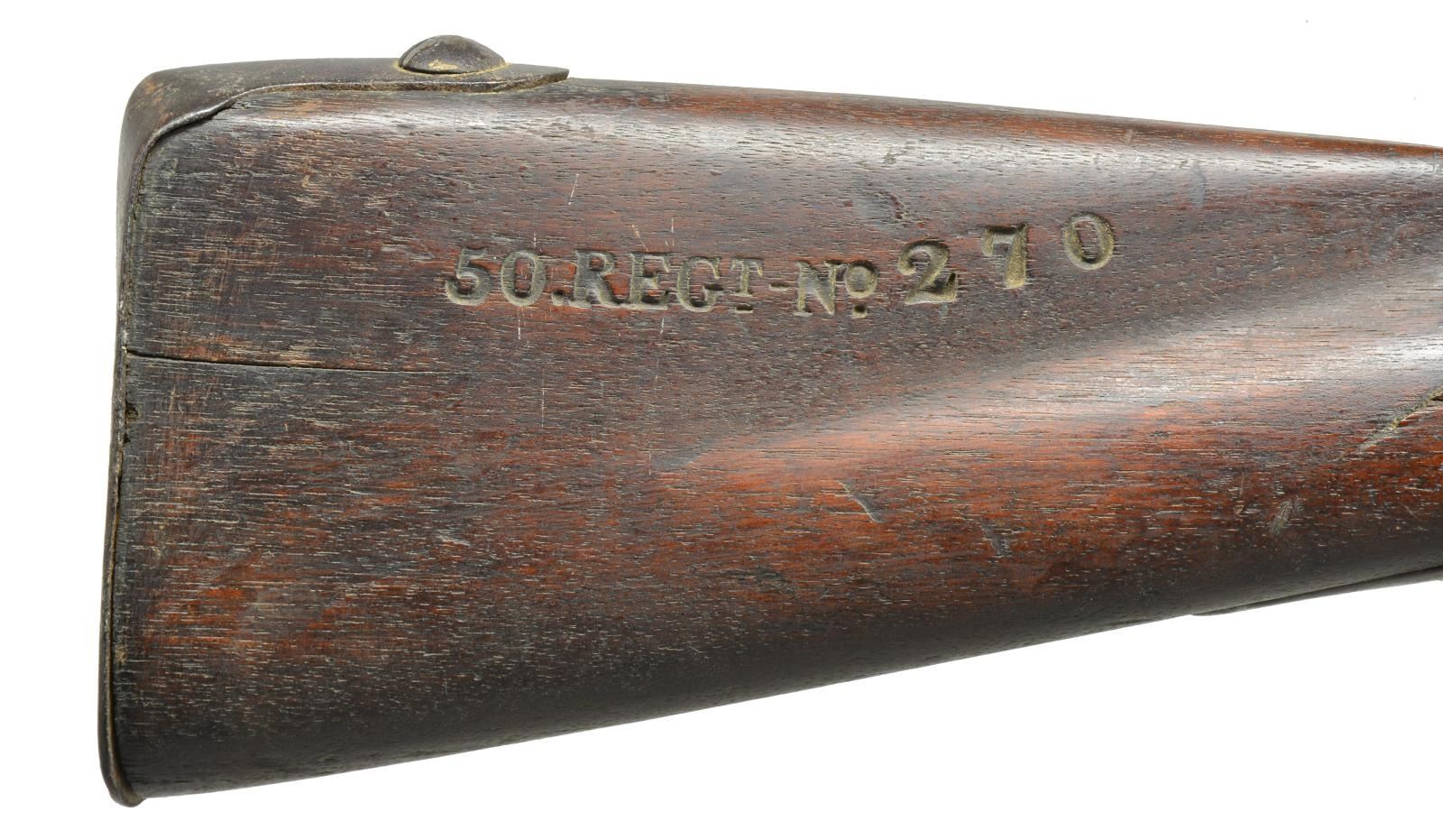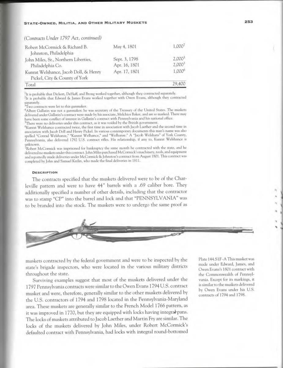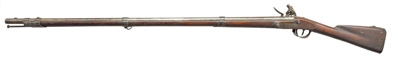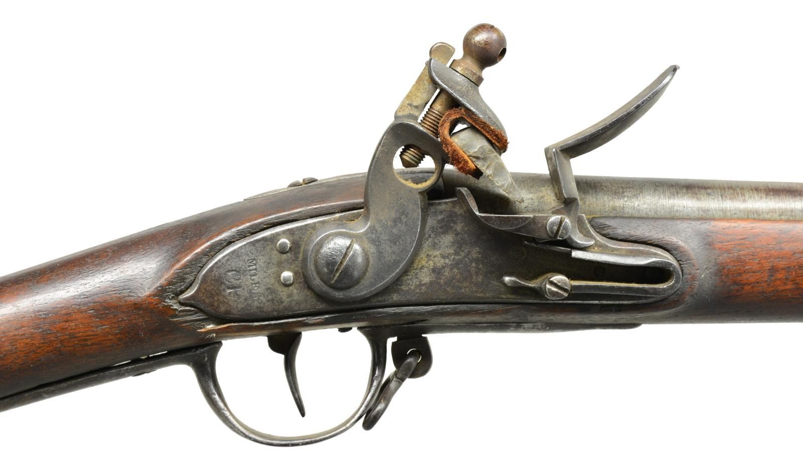 MUSKET. Cal. 70. NSN. Bbl. 44" marked at breech “CPNA” oval cartouche w/ liberty cap over “P”. 59 1/2" Overall. George Moller in his text states that this state cartouche dates delivery 1797-1801. Lock is marked at tail, stamped vertically “MILES / CP". "50 . REGT No. 270” stamped on right side of butt stock & lg. "WS" on left. Inspectors cartouche w/ 2 indiscernible script initials over “V”. CONDITION: very good overall. Appears original & matching other than added ramrod & lock screws. Cock has welded repaired shank holding top jaw w/ added top jaw screw. Stock is sound w/ chipping rear of lock. 2 Cracks between lock & trigger guard. Mechanically fine w/ clear dark bore. PROVENANCE: The Estate Collection of Gary Parietti. (01-19297/JS). ANTIQUE. $2,000-2,500.