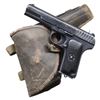 Cal. 7.62 Tokarev. S# 3156. Bbl. 4 5/8". Blade front sight. U-notch rear sight. Matching numbers on backstrap, bbl. & frame. Slide number appears scrubbed & trigger assembly is numbered "76". Rare TT-30 Tokarev pistol made before the simplified & more prolific TT-33 pistol. Rear rear of frame has serial, Tula star & 1935 date. Mix of original & reblue finish. Grooved black grips with CCCP star monograms. MAGS: 2-8 rd. one matching numbered to pistol & other is numbered to a different gun. UNATTACHED ACCESSORIES: original green holster with cleaning rod. CONDITION: grips show some dings & handling marks. Metal retains 50% mix of original blue & touch up reblue with scattered fading to gray, edge wear, oxidation & dings. Action functions properly when hand cycled. Very good bore. (25-515/MJC). CURIO. $2000-3000.