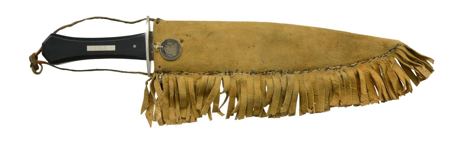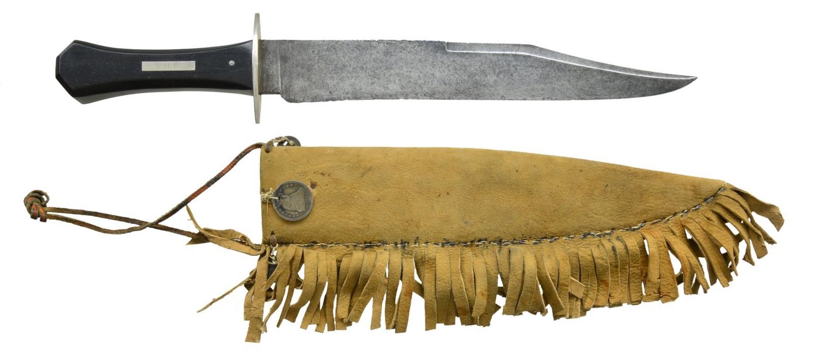 16" Overall, 11" clip point with 4.5" clip, scroll etched blade: “WADE WINGFIELD / & ROWBOTHAM” marked lengthwise and ricasso: “NO. 82 / TENTER ST / SHEFFIELD”. Rosewood grip with German silver crossguard and escutcheon with initials: “W. H. P.” Carved wood sheath with fringed edge, three antebellum American silver coins attached with strings is later addition but fits well. CONDITION: good to very good overall, blade is gray and worn with staining and light pitting, small nicks in cutting edge. PROVENANCE: From the Lifelong Collection of Glen E. Mattox. (02-18375/JS). $3,000-4,000.