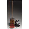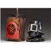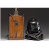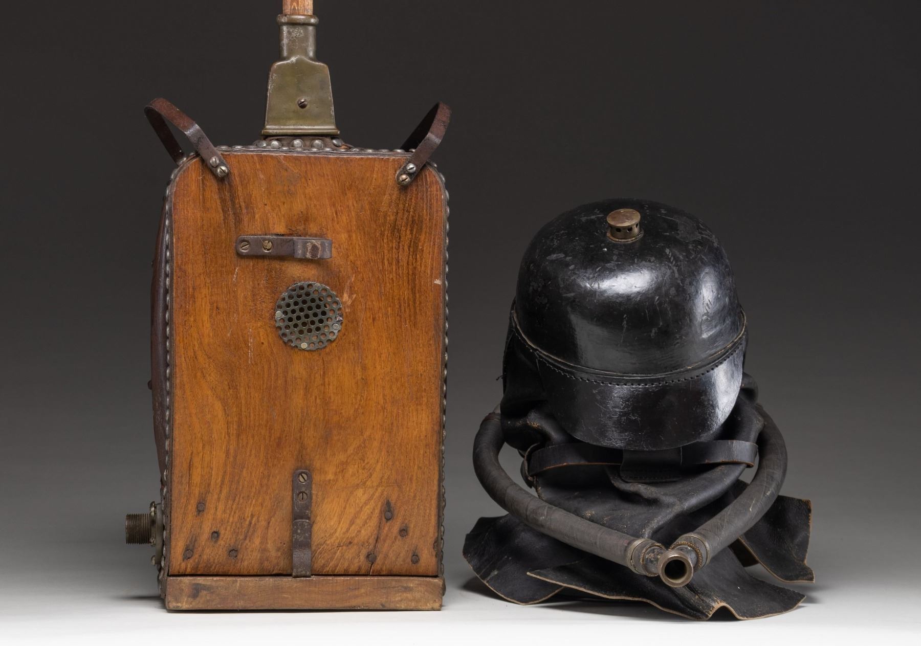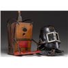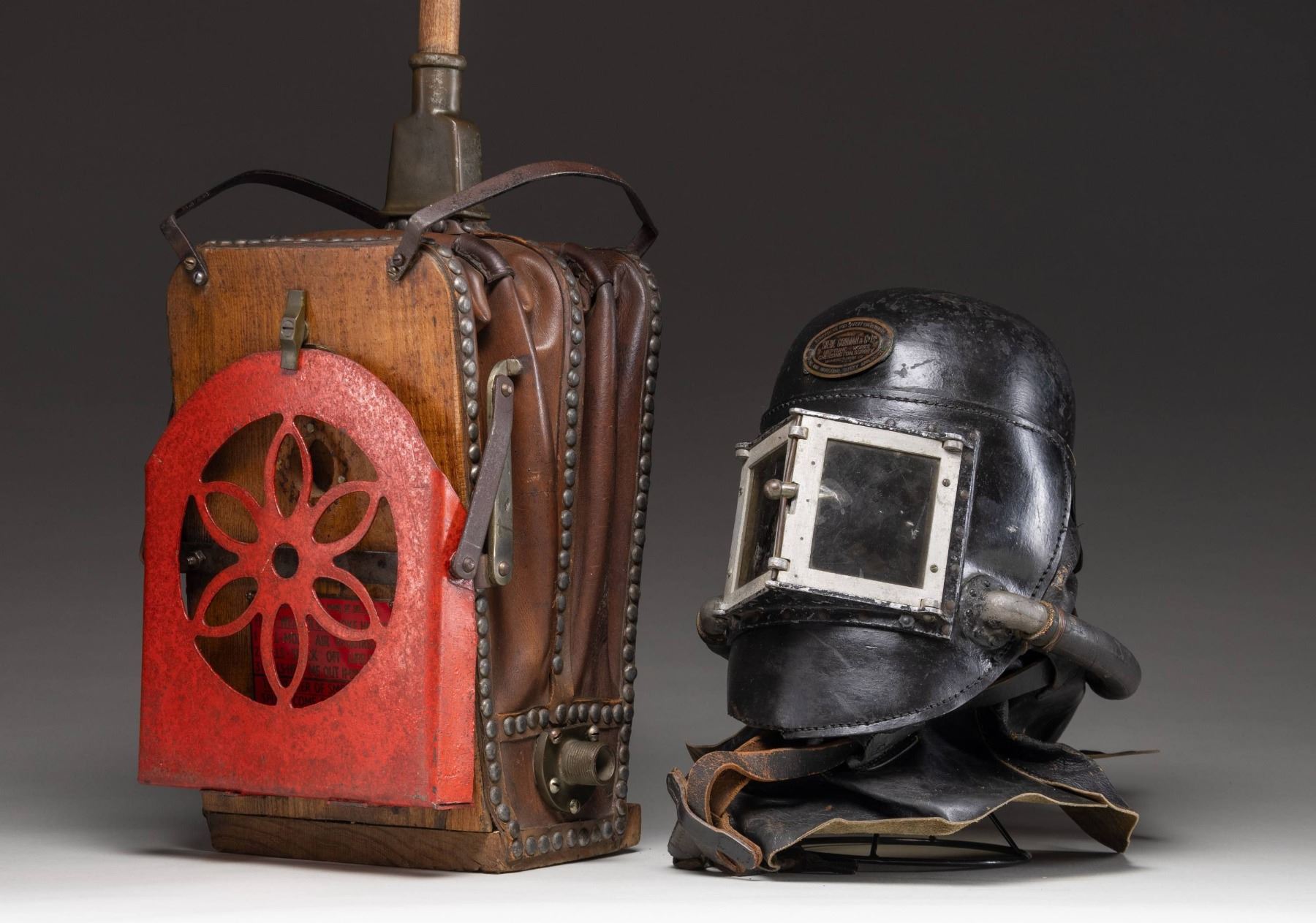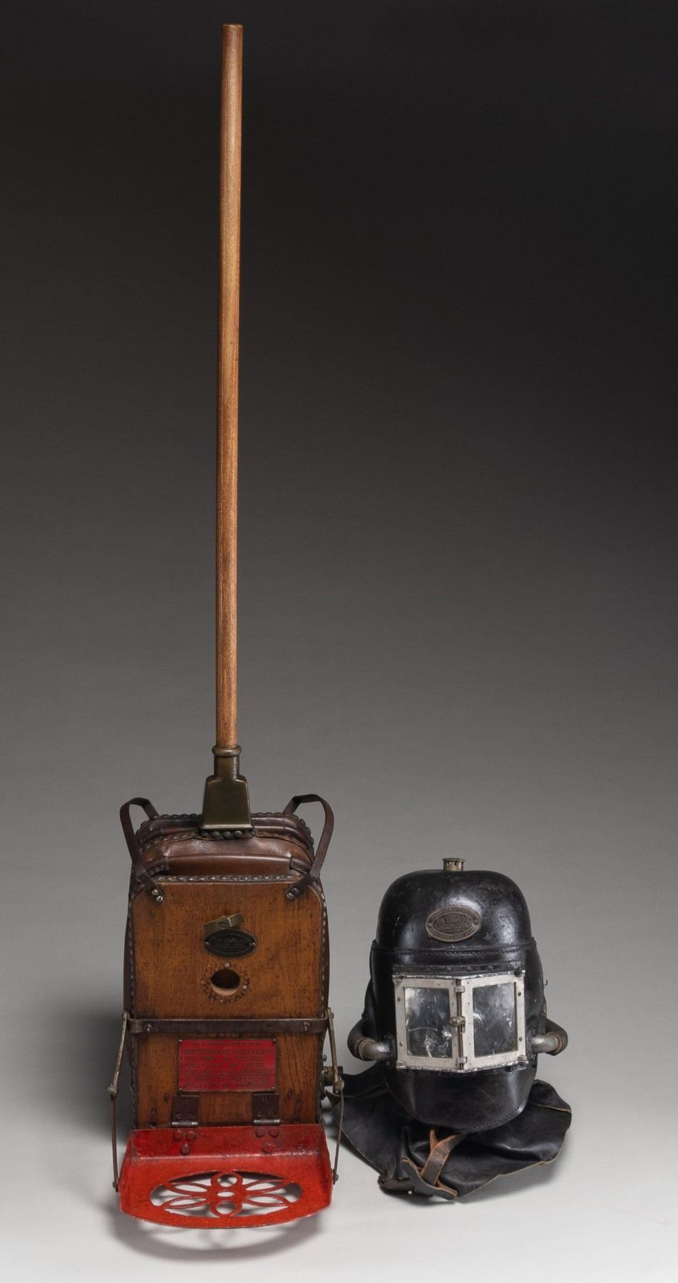 WITH BELLOWS. Fireman's "Smoke Helmet" mfg. by Siebe Gorman & Co. LTD. circa. 1878. Siebe Gorman was prominent name for diving gear in the 1830s, and was the first company to register the "Smoke Helmet'. The Smoke Helmet was designed for rescue use for firemen, with the operator having fresh air pumped to the helmet via a bellow that was operated by another crew member outside. This example exhibits a brass data plate that reads "EVERYTHING FOR SAFETY EVERYWHERE/ SIEBE GORMAN & CO LTD/ NEPTUNE WORKS/ CHESSING, SURREY/ MANUFACTURERS OF/ MINE & INDUSTRIAL SAFETY APPLIANCES". Brown leather construction, with brass top. The view port is riveted to the mask itself and features 2 hinged aluminum framed mica panels. A rubberized canvas hose protrudes from either side of the helmet from iron fittings and terminate in a single threaded hose nozzle at the rear. Bellow is constructed of iron, wood, and leather. Strips of brass tacks are present on the edges of the wood fittings, as well as along the central edge of the leather bellow section. Wood broom type handle terminates in a brass socket. UNATTACHED ACCESSORIES: document detailing the history of the Siebe Gorman Smoke Helmet. CONDITION: helmet is good, showing mild exterior wear, as well as scattered marks from handling and storage. Leather remains malleable, with some age related cracking and crazing present on the neck cowl and tassels. Brass parts have acquired a pleasing patina. Mica viewing windows show some small scratches, as well as areas of delamination. Bellow is very good overall, showing some losses to its red painted exterior on the stand plate. These Siebe Gorman & Co. LTD. "Smoke Helmets" are seldom encountered outside of museums and private collections, making for a rare opportunity for one to acquire an intriguing part of 19th century fire fighting history. (02-25147/MLW). $3,000-4,000.
