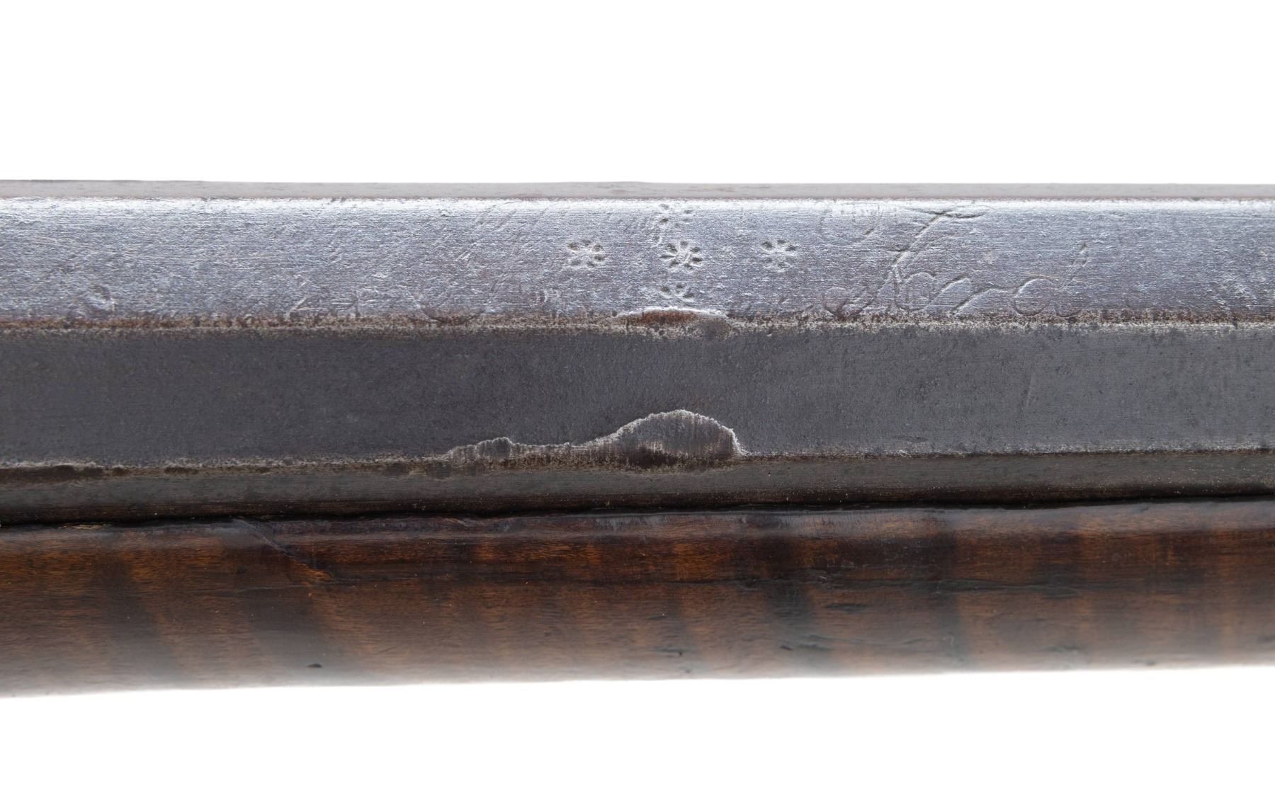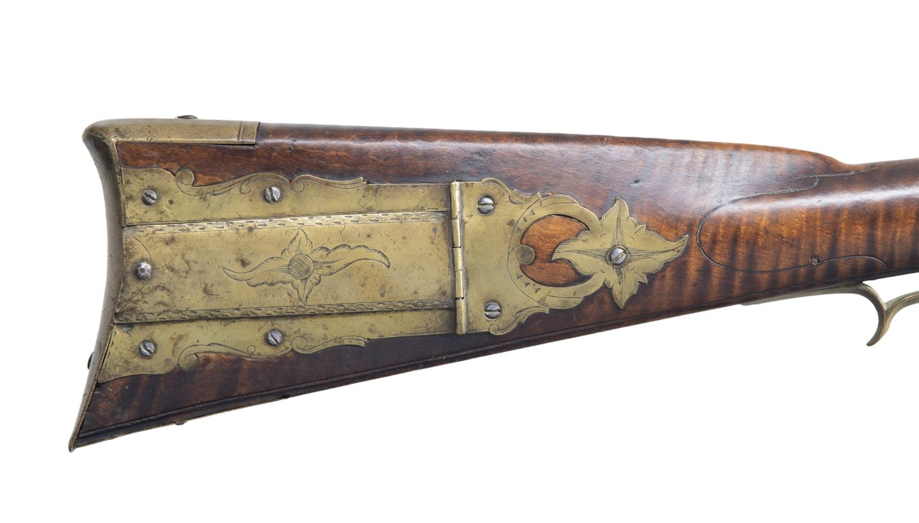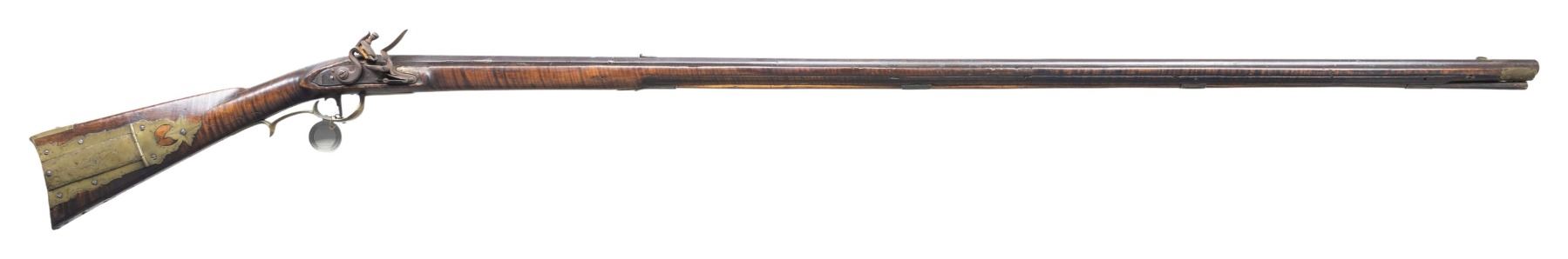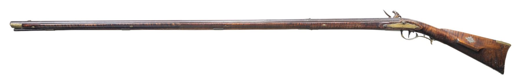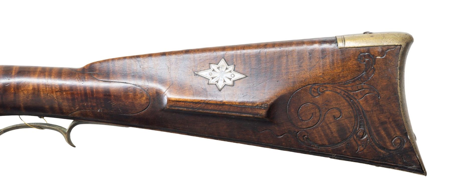 RIFLE. Cal. 56. NSN. Exceptionally long smoothbore rifle 67.75", 53" octagonal to round barrel signed in script "J * FORD". Gun is so long that the curly maple forestock was made in 2 pieces with mortise & tenon attachment, Ketland lock, engraved silver hunter's star and incised carved, 4-piece engraved and pierced patchbox. Rifle was deaccessed from the defunct Milton Hershey Museum of American Culture in Hershey, PA and still has the small branded museum inventory number on bottom of butt stock. Milton Hershey was among the earliest collectors of Kentuckys in the 1920s and his museum housed many of the rare Dauphin County rifles including this one. Rifle has 2018 KRA "President's Display" medal. This is among the best John Ford rifles known as the few other survivors are not carved. John Ford (1780-1862) born in York, worked in Harrisburg, PA and was state armorer in 1818. CONDITION: very good as restored from percussion back to flint configuration. Stock has no restoration, hand worn patina. Mechanics fine, clear dark smooth bore. PROVENANCE: from a prominent collector. (01-28027/JS). ANTIQUE. $4,000-8,000.