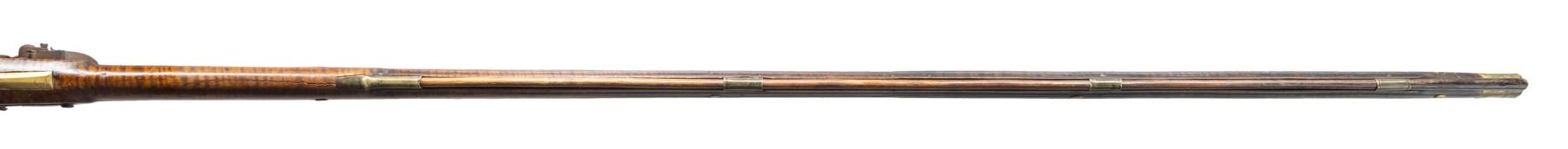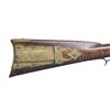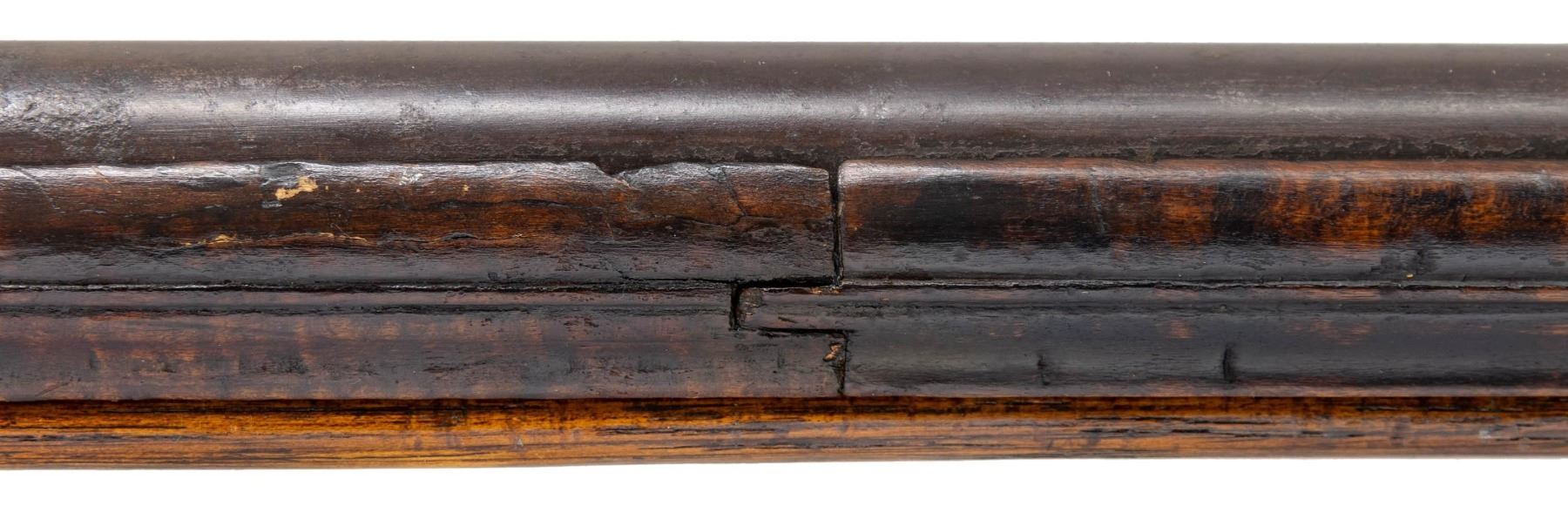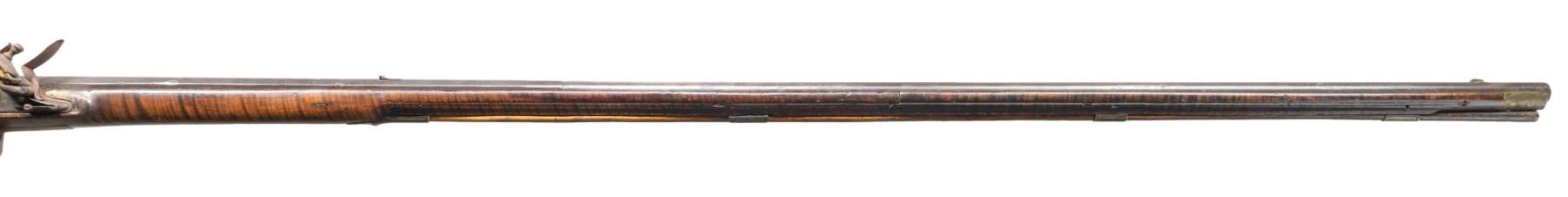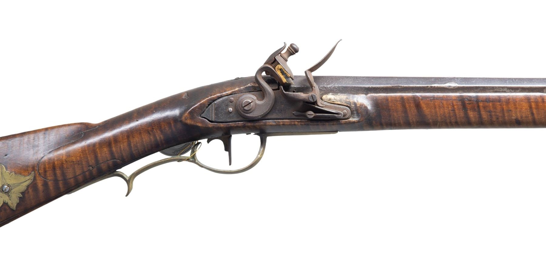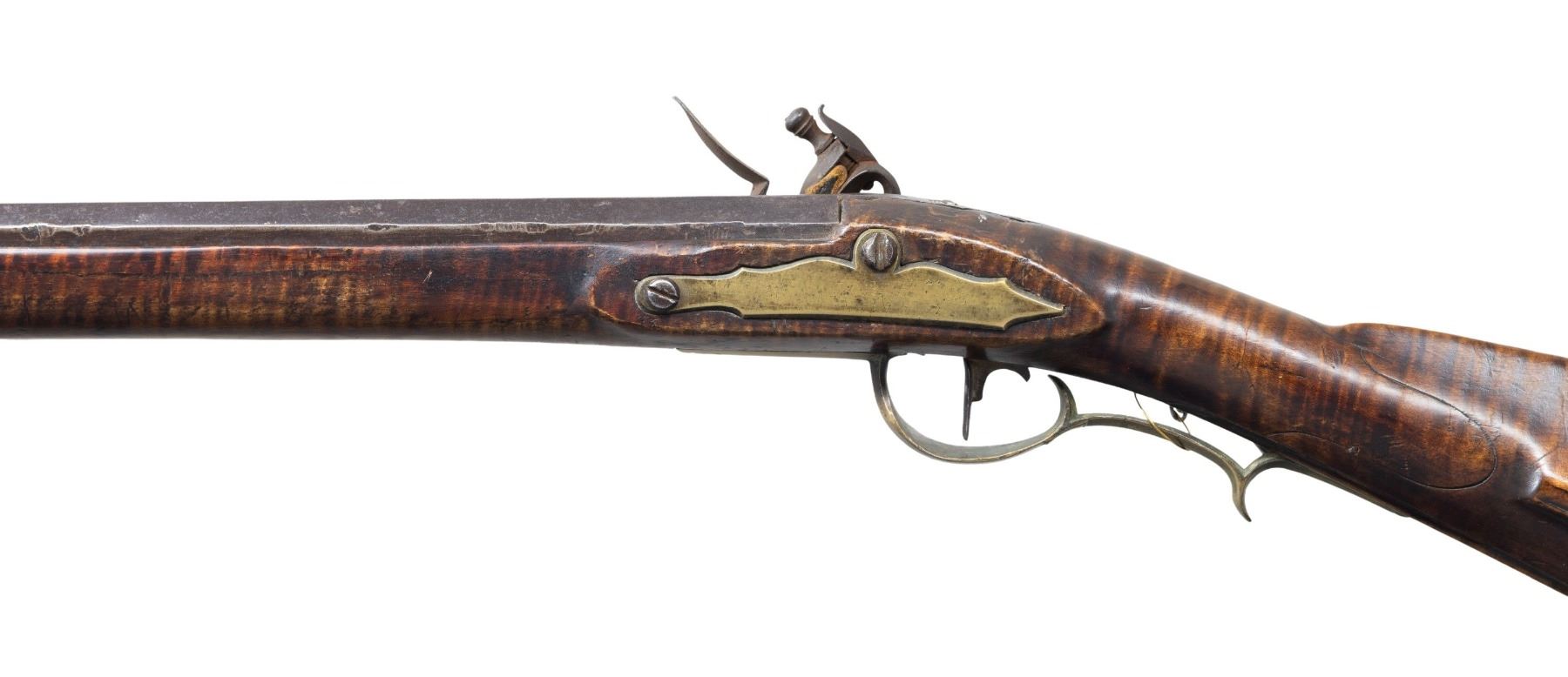 RIFLE. Cal. 56. NSN. Exceptionally long smoothbore rifle 67.75", 53" octagonal to round barrel signed in script "J * FORD". Gun is so long that the curly maple forestock was made in 2 pieces with mortise & tenon attachment, Ketland lock, engraved silver hunter's star and incised carved, 4-piece engraved and pierced patchbox. Rifle was deaccessed from the defunct Milton Hershey Museum of American Culture in Hershey, PA and still has the small branded museum inventory number on bottom of butt stock. Milton Hershey was among the earliest collectors of Kentuckys in the 1920s and his museum housed many of the rare Dauphin County rifles including this one. Rifle has 2018 KRA "President's Display" medal. This is among the best John Ford rifles known as the few other survivors are not carved. John Ford (1780-1862) born in York, worked in Harrisburg, PA and was state armorer in 1818. CONDITION: very good as restored from percussion back to flint configuration. Stock has no restoration, hand worn patina. Mechanics fine, clear dark smooth bore. PROVENANCE: from a prominent collector. (01-28027/JS). ANTIQUE. $4,000-8,000.