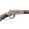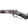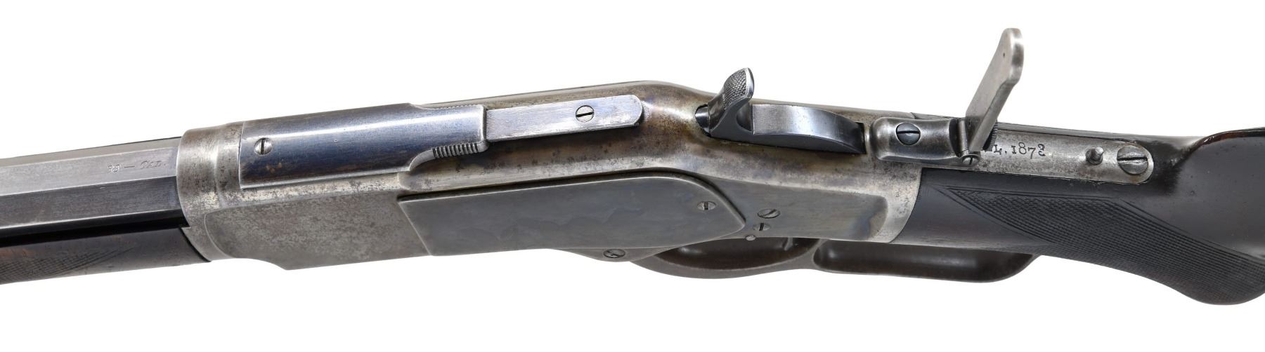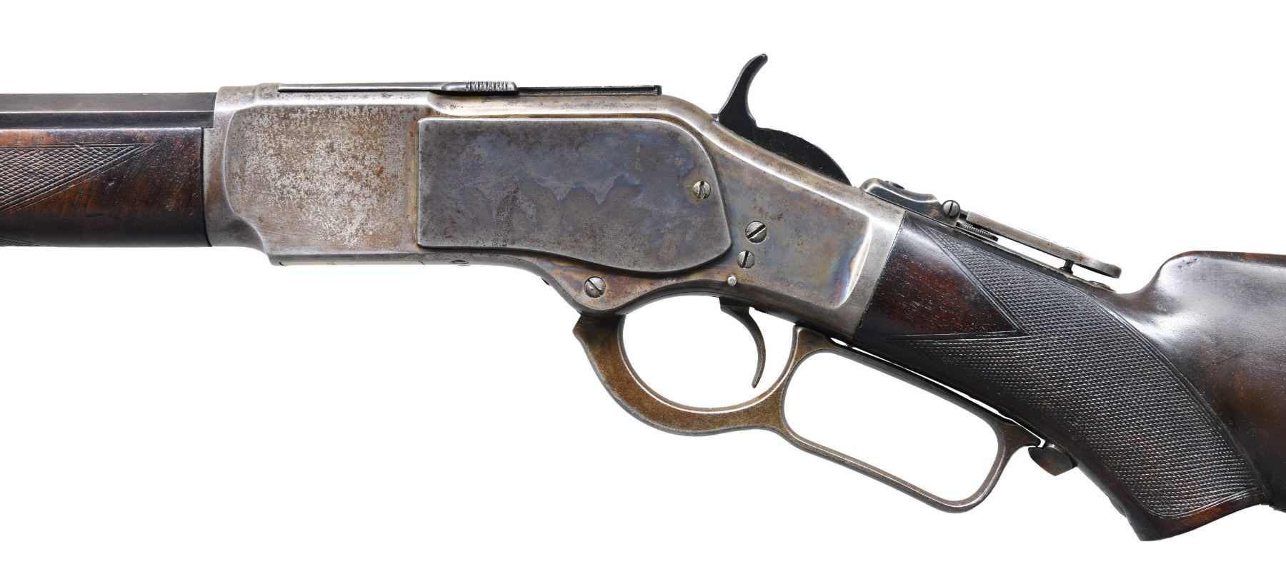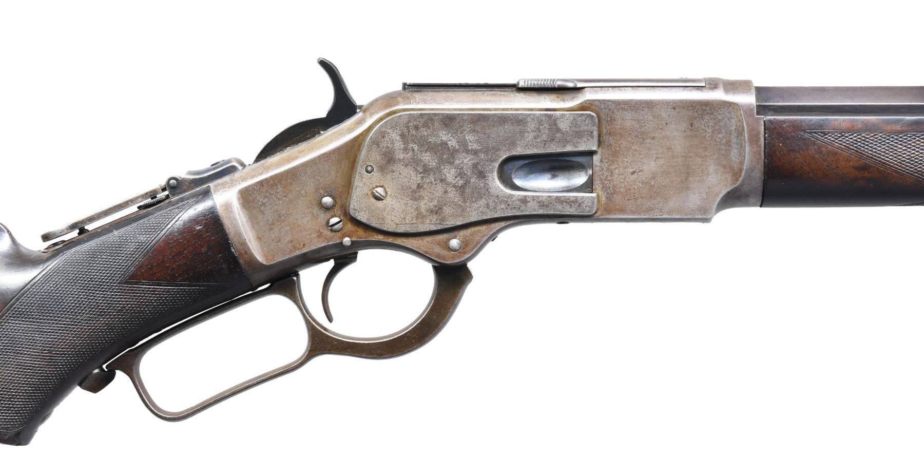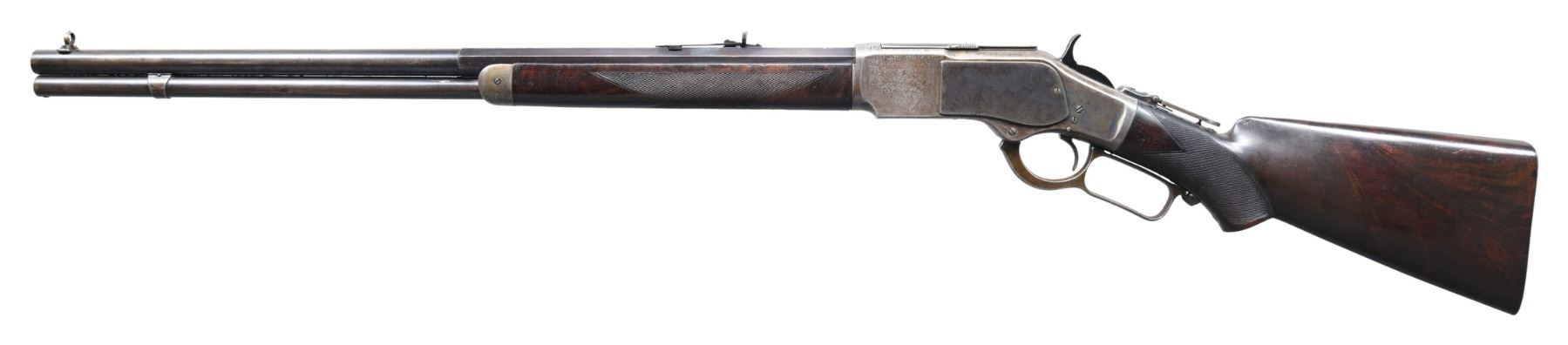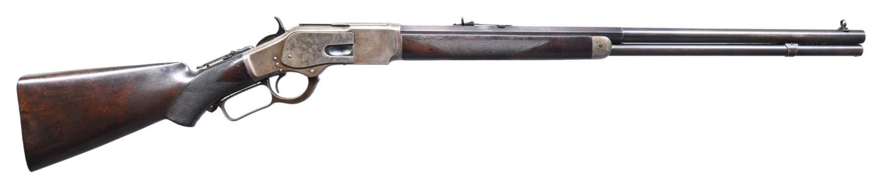 COLORED DELUXE LEVER ACTION RIFLE. Cal. 38 WCF. S# 97081. Bbl. 24" in desirable & seldom seen octagon to round configuration with full length mag. Combination front sight, sporting rear sight w/ a 62-B peep tang sight. Blue finish w/ case colored action. Forearm & pistol grip stock of nicely grained walnut. Features include steel shotgun buttplate, ebony grip insert & style H factory checkering. 1882 manufacture. CONDITION: bbl. & mag. tube retain 60% original blue showing edge wear & small spots of corrosion. Action retains nicely visible case colors on part of the left side w/ other areas having faded to gray. Stock & forearm have a added varnish over original finish and show scattered light to moderate scratches & marks. Mechanically fine. Bore retains largely intact rifling with some scattered pitting. (01-27054/BH). ANTIQUE. $10,000-15,000.