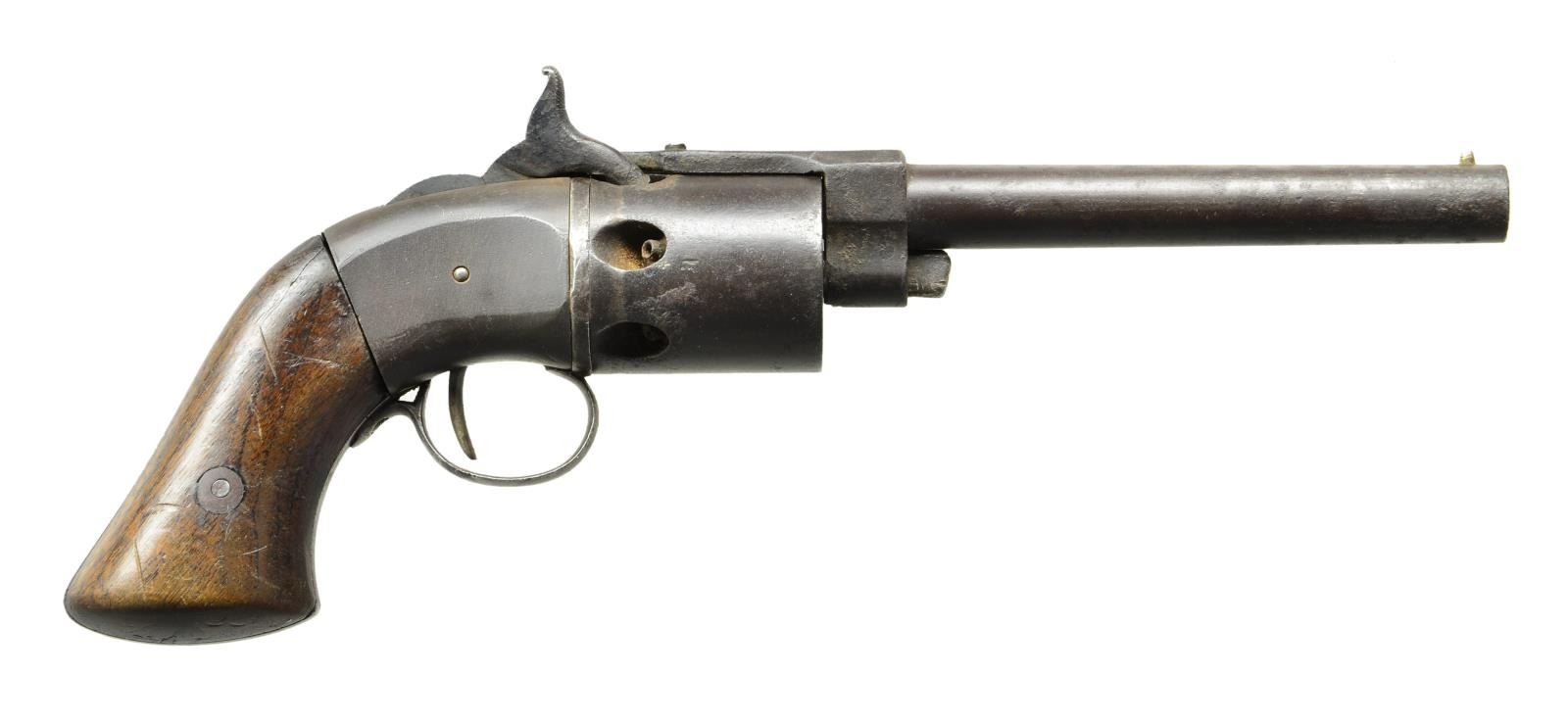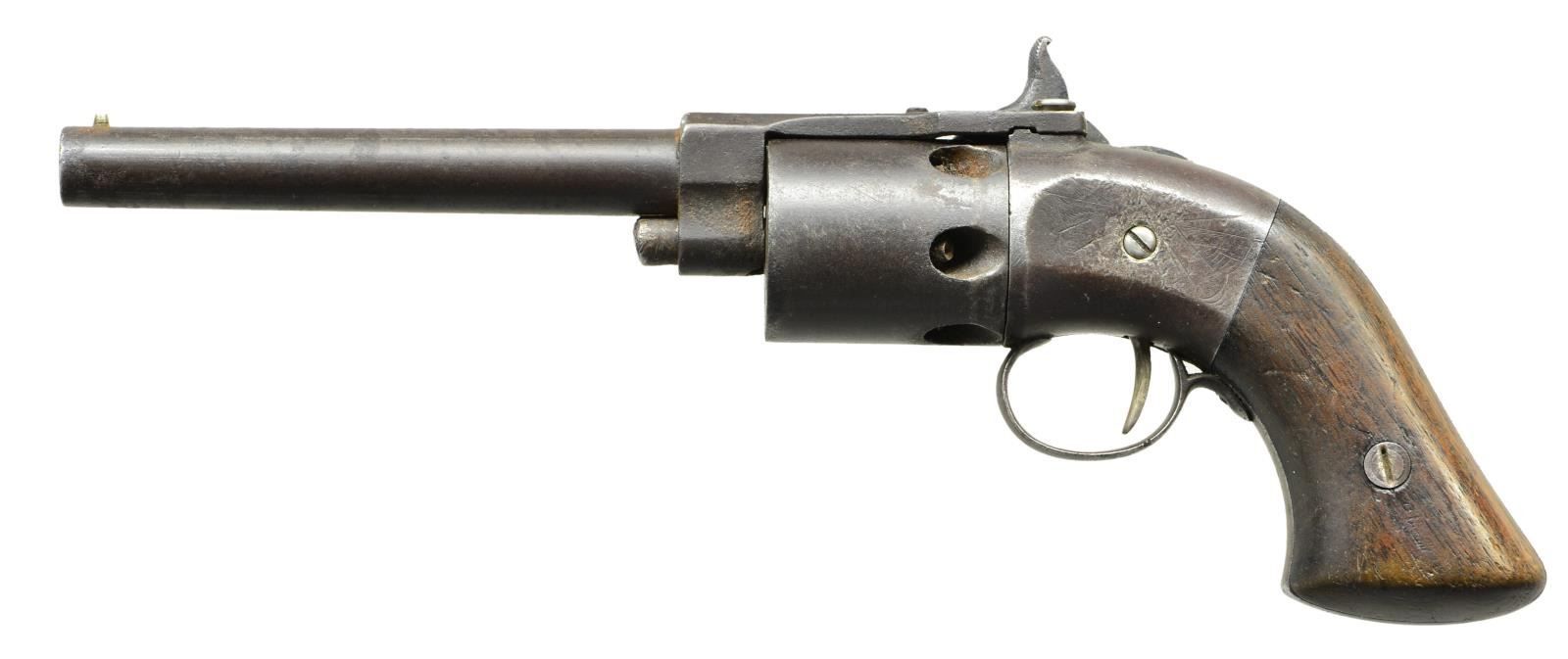 Cal. 31. S# 217. Bbl. 5" round with brass post sight. Mfg. 1851 with total estimate of 350 (some sources say 100 but this is #217) before ceasing due to Colt's lawyers bringing patent infringement proceedings (Colt also went after Mass. Arms, Conn. Arms, etc.). Center hammer model offered in 3 single trigger patent variations: Jacquith, Warner and Warner with loading lever assembly (4th variation had loading lever and double triggers). 6 rd. unfluted cyl. with matching number on rear. Right side or top strap would have the patent name markings; none readable on this revolver. Serial number on right side under grips; left grip usually numbered; no numbers on this one. Cylinders had etched decorations as did sides of frame. Finish was case colored frames and blued barrels. Although markings of patent style not readable, profile indicates Warner style. CONDITION: poor to fair overall with brown patina mixed with cleaned light oxidation and loss of markings and decorations except on top strap plus faint marks on left side of frame. Missing cylinder pawl so no rotation. Replacement top strap retaining screw. Right grip appears mismatched with curved chisel gouge marks on back yet screw bushing appears correct. Half cock notch functioning but not full cock. Fair cylinder chambers with good nipples. Fair pitted bore with clear rifling of 7 grooves and lands. (01-22147/NW). ANTIQUE. $500-750.