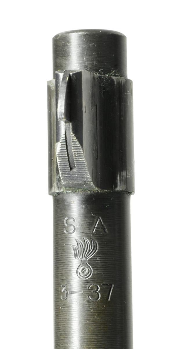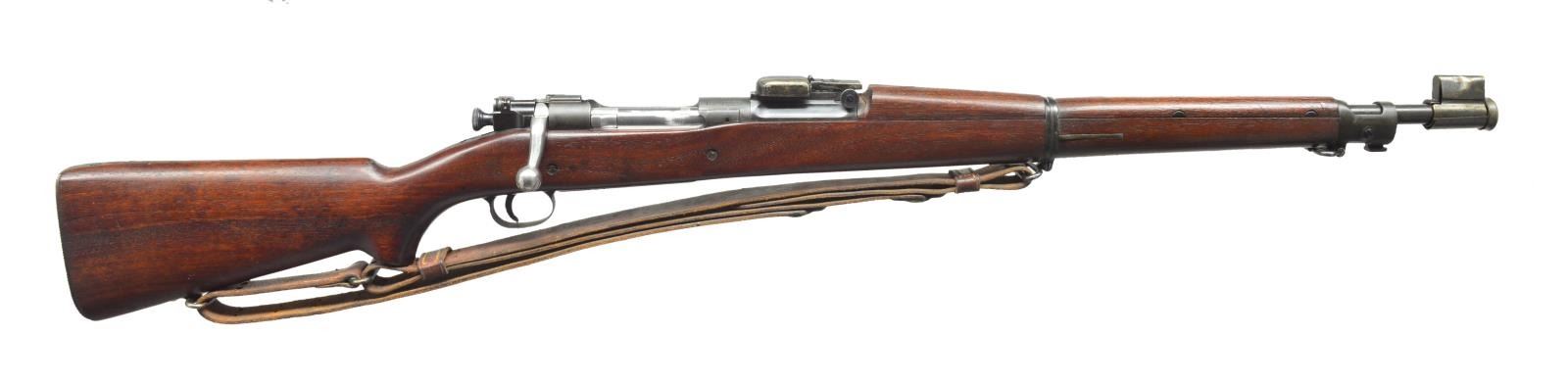 ACTION RIFLE. Cal. 30-06. S# 1497223. Rare National Match rifle produced in 1937 w/ all correct features in excellent condition w/ Springfield Research Service letter documenting this rifle & it's shipping to Commanding Officer Troop K 121st Cavalry NY National Guard Syracuse, NY on 06/23/39. Star gauged 24" bbl. marked behind front sight "SA flaming bomb 3-37". Receiver has "Hatcher Hole". Polished bolt numbered by electro pencil to rifle. Bolt marked "NS" on top of handle & marked "3" underneath handle. Extractor marked on rear "CV". Bolt race ways have been polished leaving the punch proof mark faint on right rail. Cocking piece marked "C64109-2". Mag. cut off is polished on underside. Ladder rear sight graduated to 2850yds. w/ volley notch. Flat windage & elevation knobs. Blade front sight. Grooved trigger. Type C matching walnut stock set. Stock marked on left side w/ faint "S.A. SPG". Marked in cutoff recess w/ "W 7 2". Has encircled "P" proof under grip & drawing number "D-1836" at belly. Correct milled furniture. Correct 10 LPI trap buttplate. Handguard has drawing number "D28179". 1907 Sling w/ brass hooks markings appear to be "?SSCO J.E.M." UNATTACHED ACCESSORIES: Springfield Research Service letter dated Sept. 21, 2010 indicating rifle "Type: Model 1903A1, National Match 1939. Caliber .30. New with Target and Star gauge Record. / Shipped To: Commander Officer, Troop "K", 121st Cavalry, N.Y. National Guard, Syracuse, New York. / Shipped on: 6/23/29." Also included is a photo copy of voucher No. 8-1482. confirming same information as letter. Rifle equipped w/ brass front sight cover marked "P. J. O'HARE SOUTH ORANGE N.J. MADE IN U.S.A." & black finished, steel hinged rear sight cover also by P.J. O'Hare. Front sight cover is overall patina w/ wear dents & scratches. Rear sight cover has thin finish w/ wear, scratches & flaking. CONDITION: a fine example of a rare National Match rifle while undoubtedly used, was well cared for. Stock set has very light wear & sm. scattered handling marks. Notable dents occurring on forward end of handguard on top & left. Metal has 90% original parkerized finish w/ light high point wear. Front sight fixed base has notable thinning due to use of accessory front sight cover. Sling has wear, flexing & cracking. Near excellent shiny bore. (21-1445/RW). CURIO. $2,500-4,000.